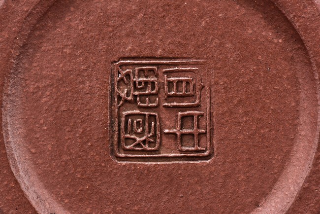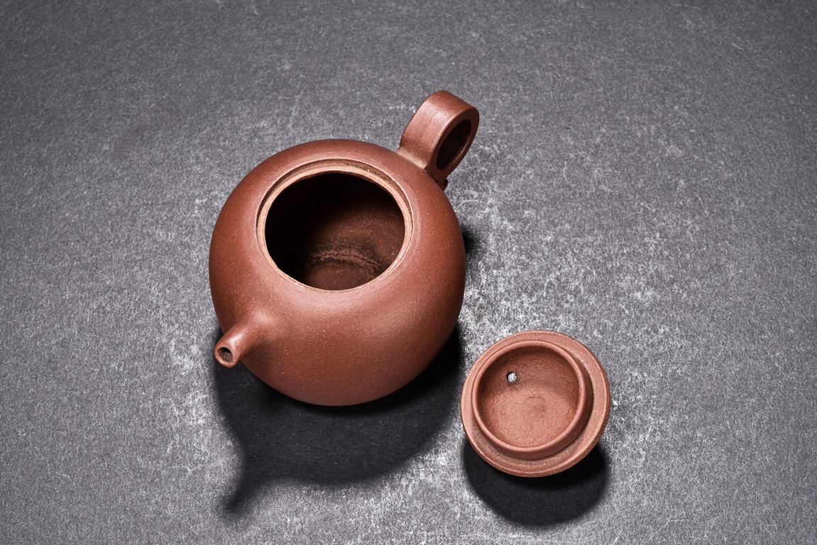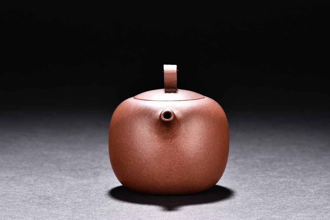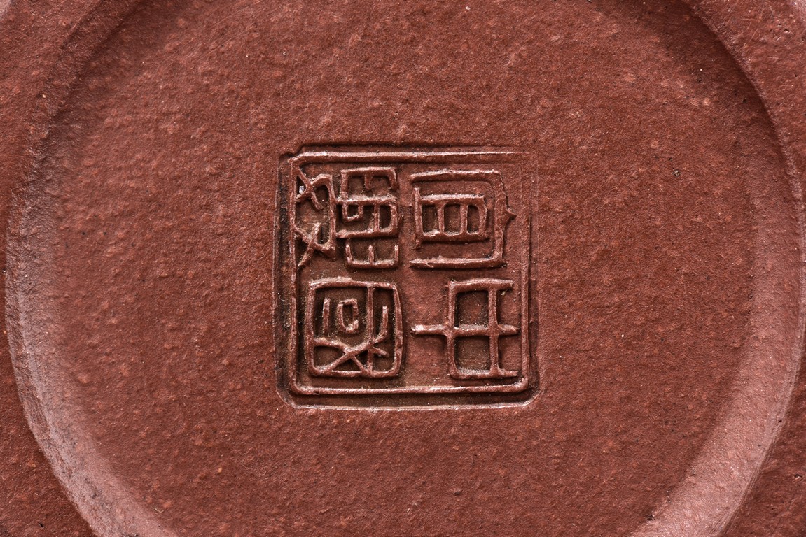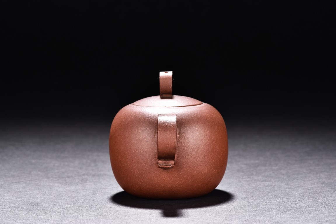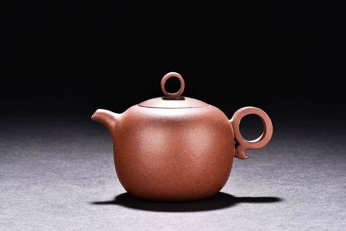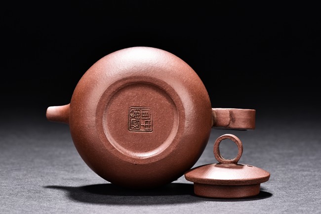 The teapot is of rounded body, the finial of ring shape, short spout, the bottom carved with four character'zhong guo yi xing' mark.