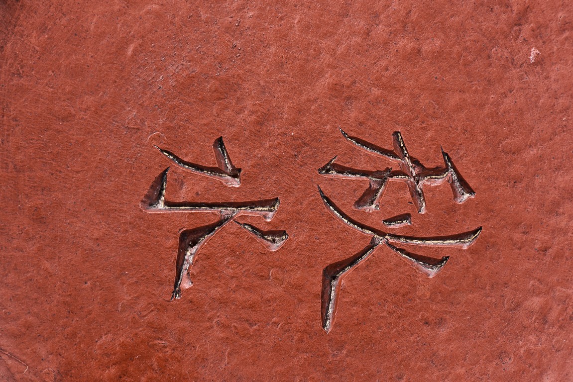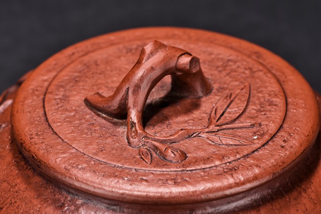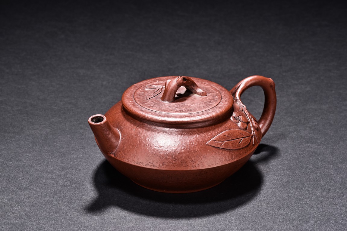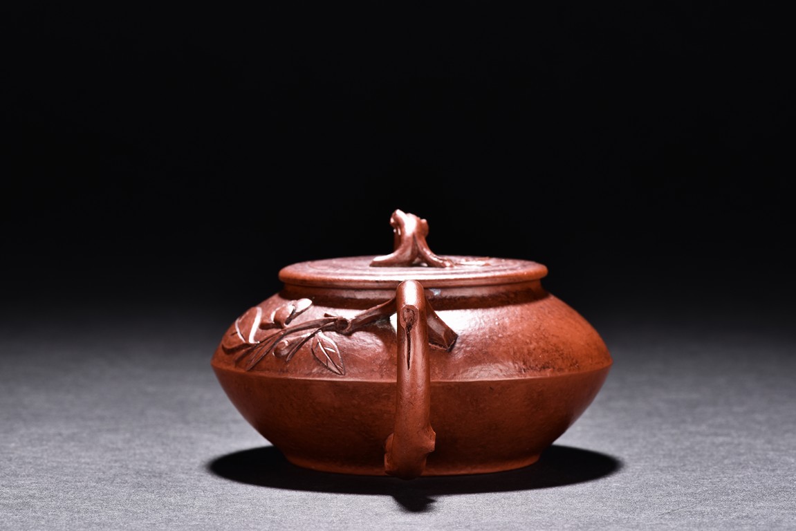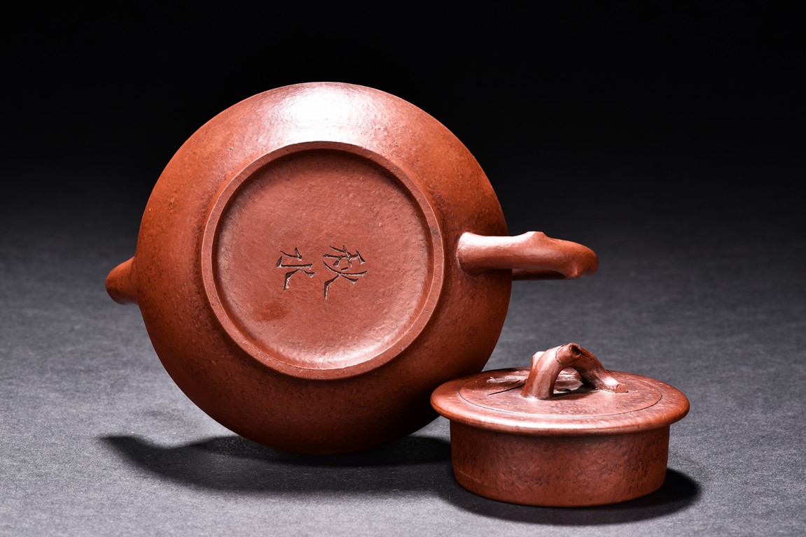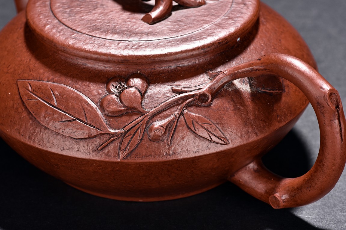 Of compressed shape, the finial and handle carved with branch form, the bottom inscribed with'Qiu Shui' mark.