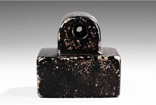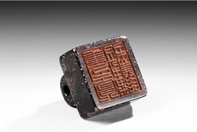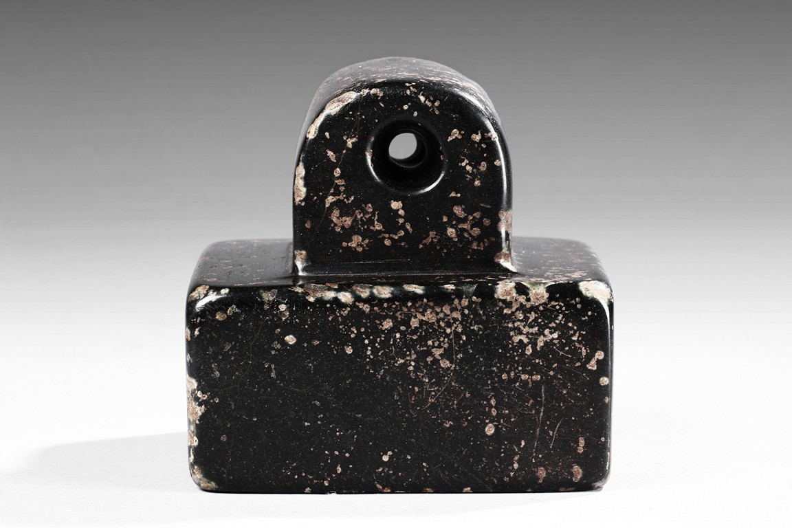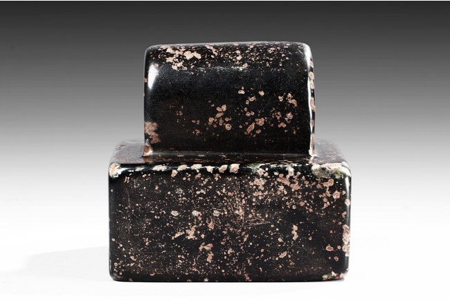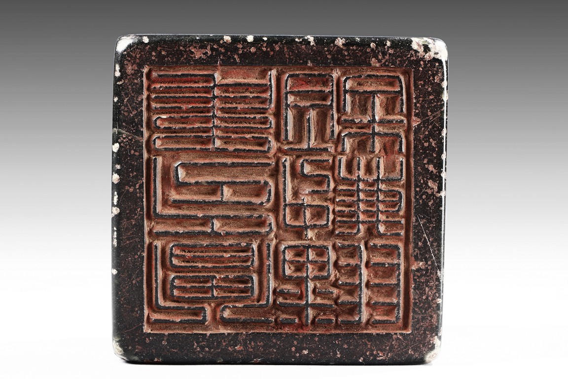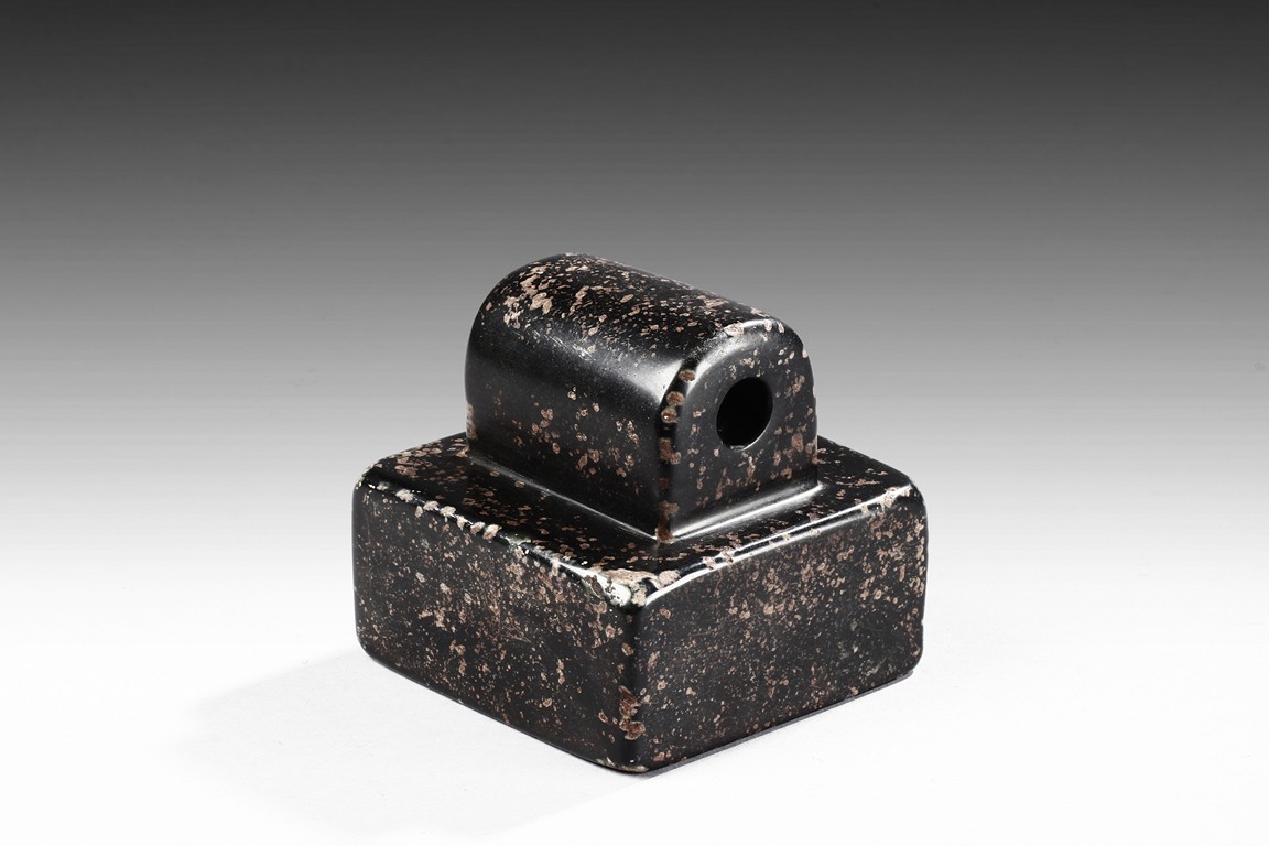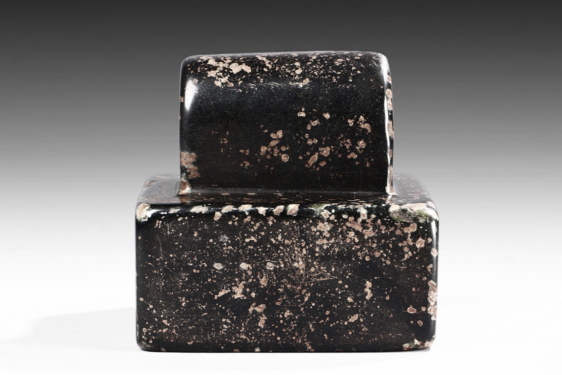 The seal stamp has a flattened square base with a half cylindrical handle with hole on top. The stone of deep black with natural dotted white patterns splashed around. Six character mark on the bottom. Qing Dynasty period.