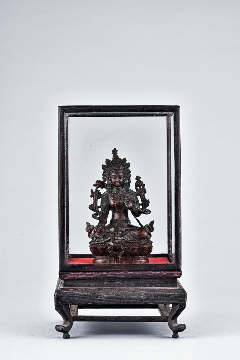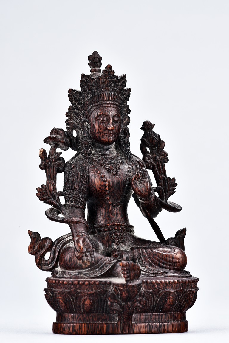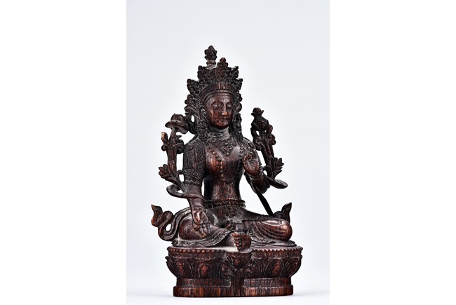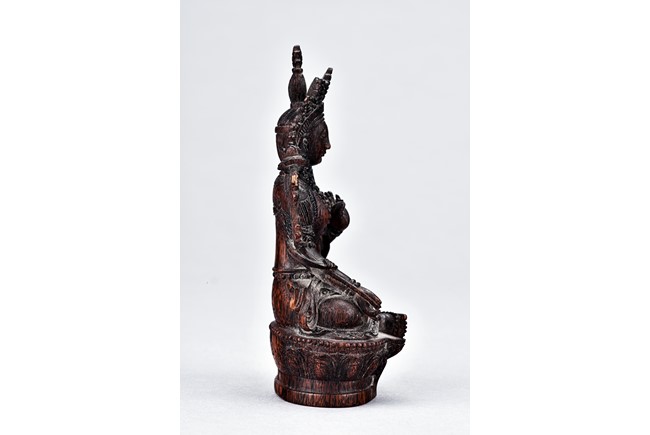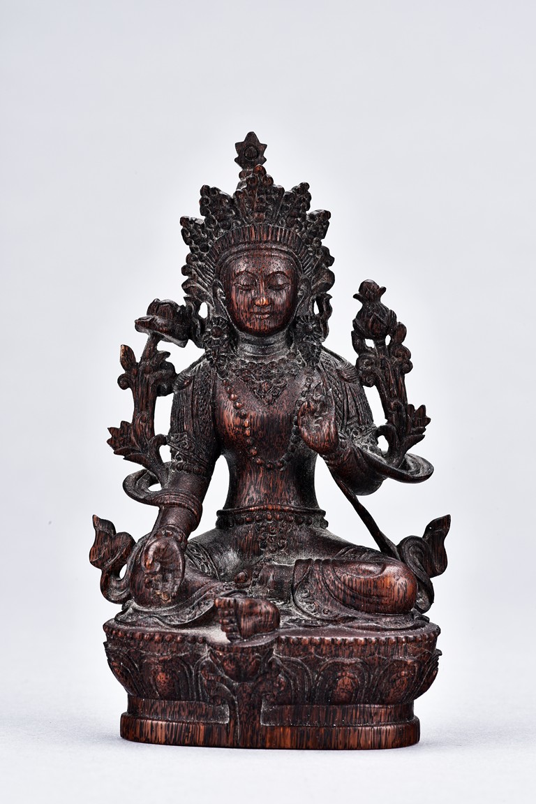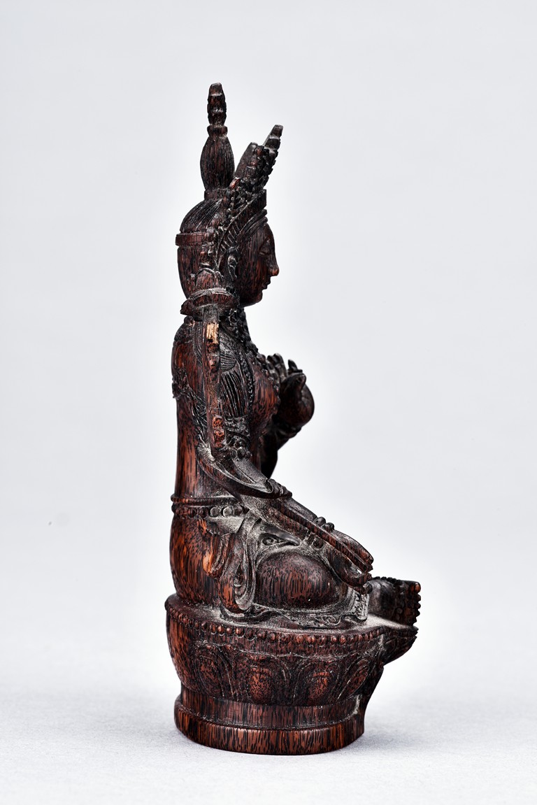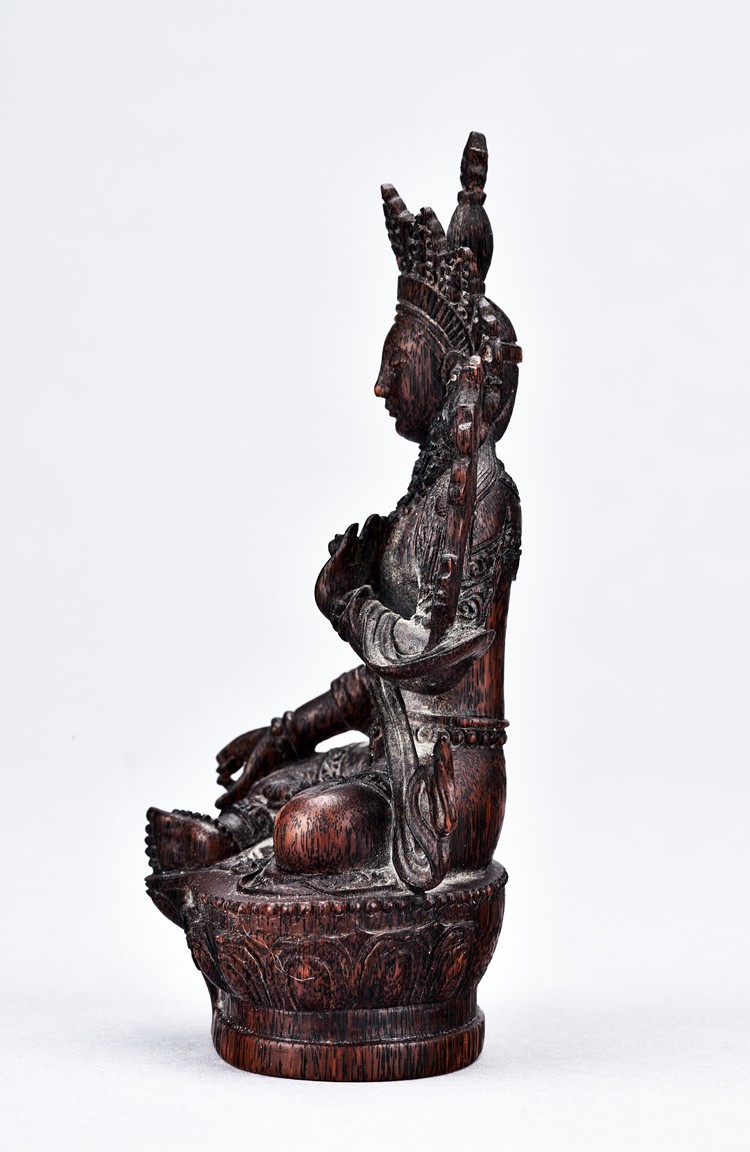The bodhisattva is shown seated on double lotus throne, hands in vitakamutra, adorned in jewelry, with elaborate belt draped over her arm, the face with calm expression. Qing Dynasty period.