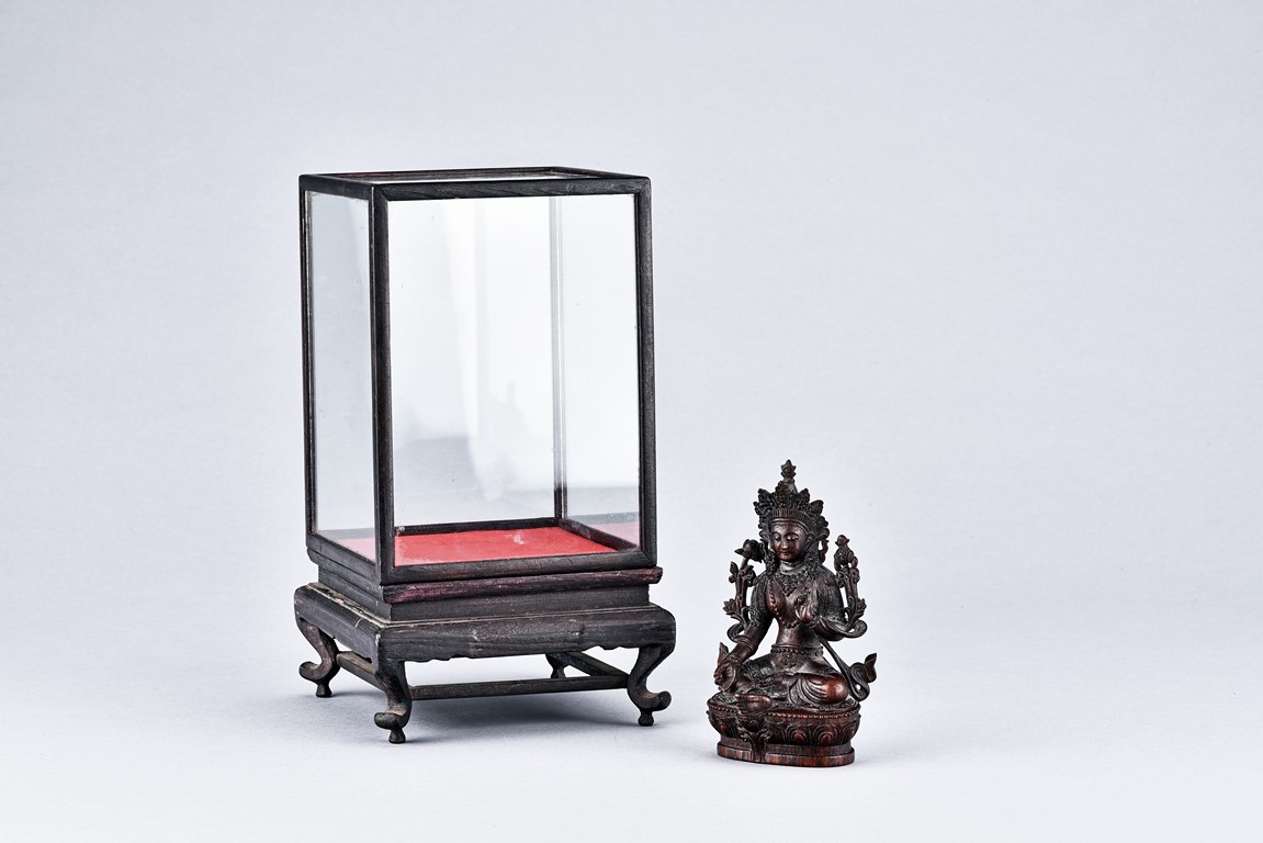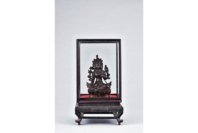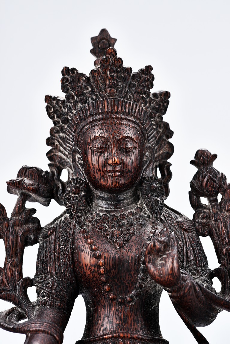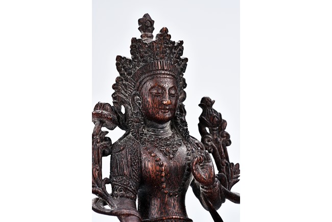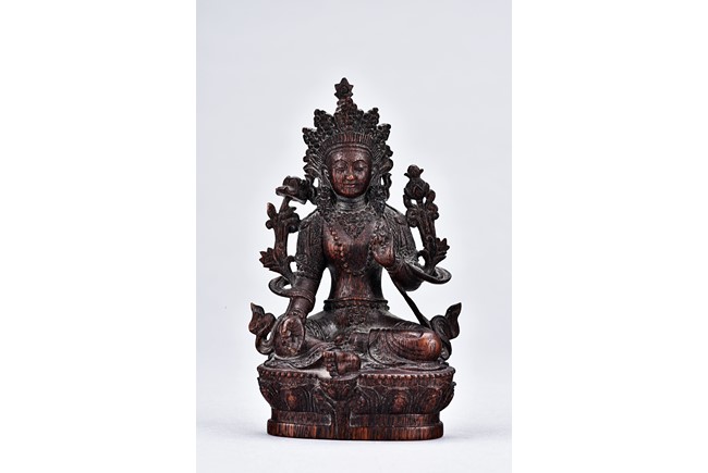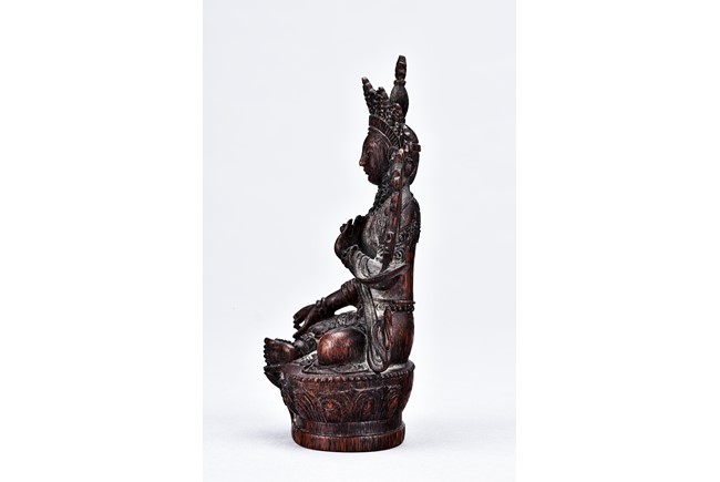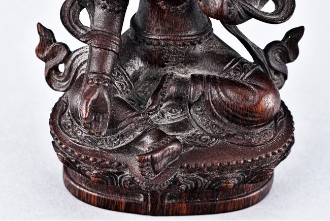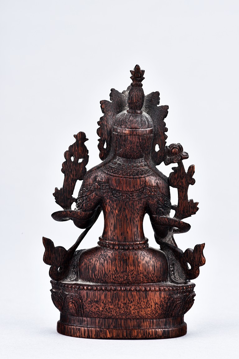 The bodhisattva is shown seated on double lotus throne, hands in vitakamutra, adorned in jewelry, with elaborate belt draped over her arm, the face with calm expression. Qing Dynasty period.