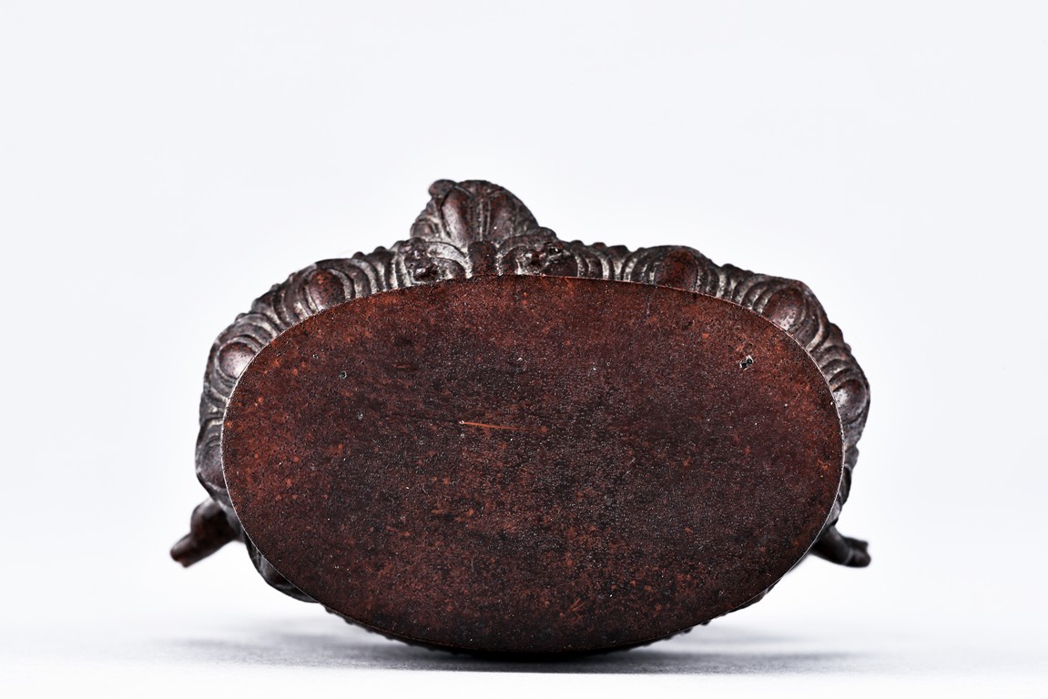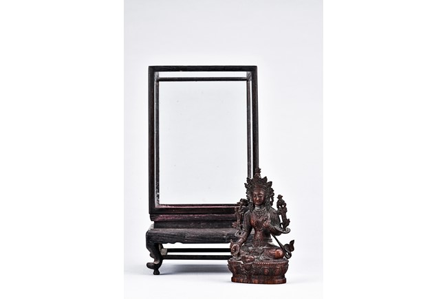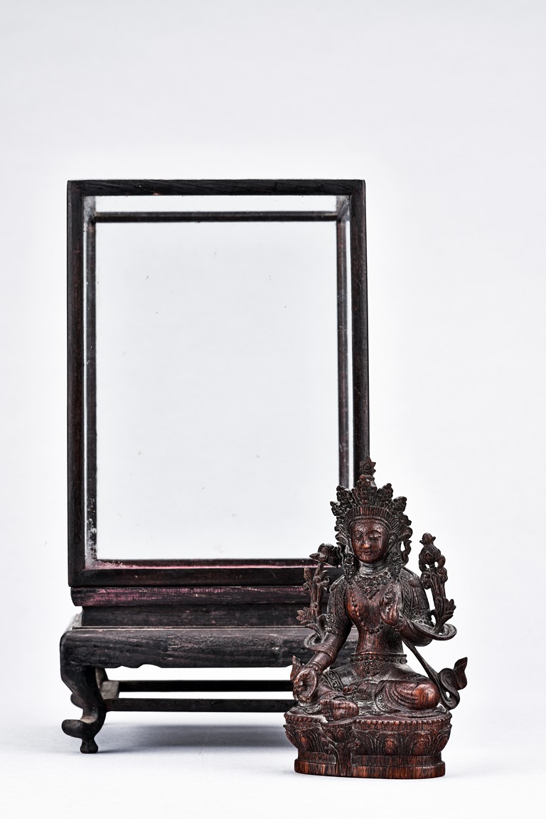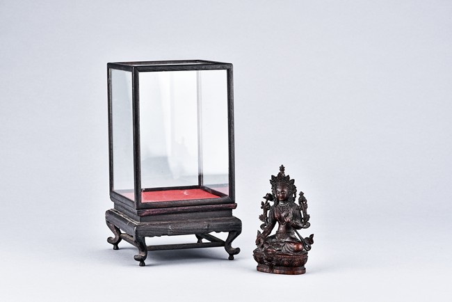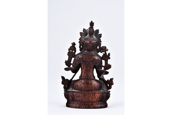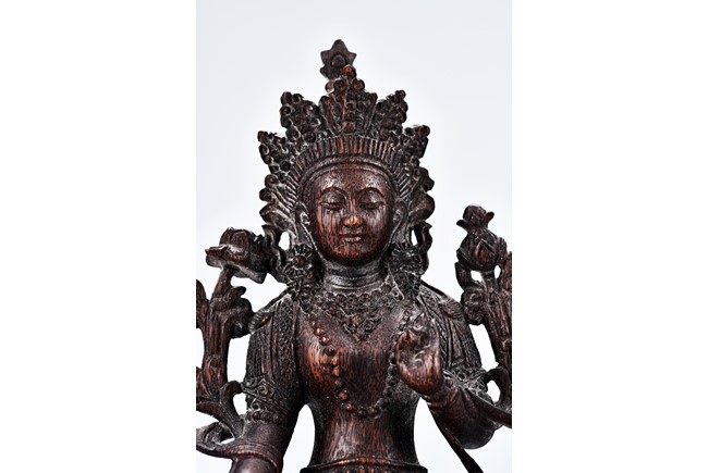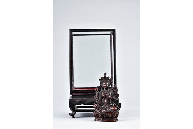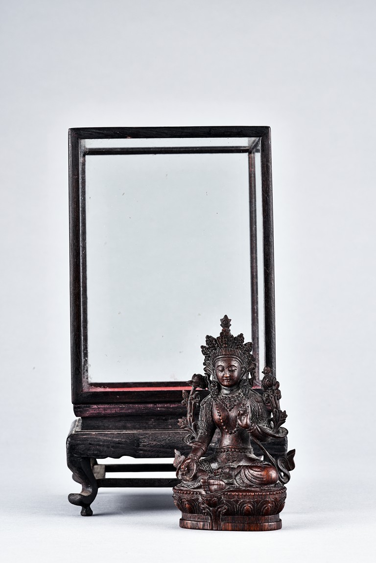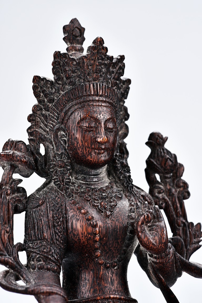 The bodhisattva is shown seated on double lotus throne, hands in vitakamutra, adorned in jewelry, with elaborate belt draped over her arm, the face with calm expression. Qing Dynasty period.
