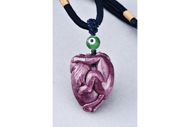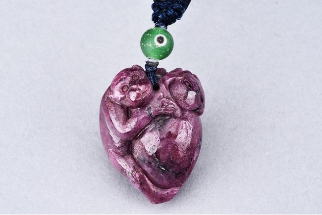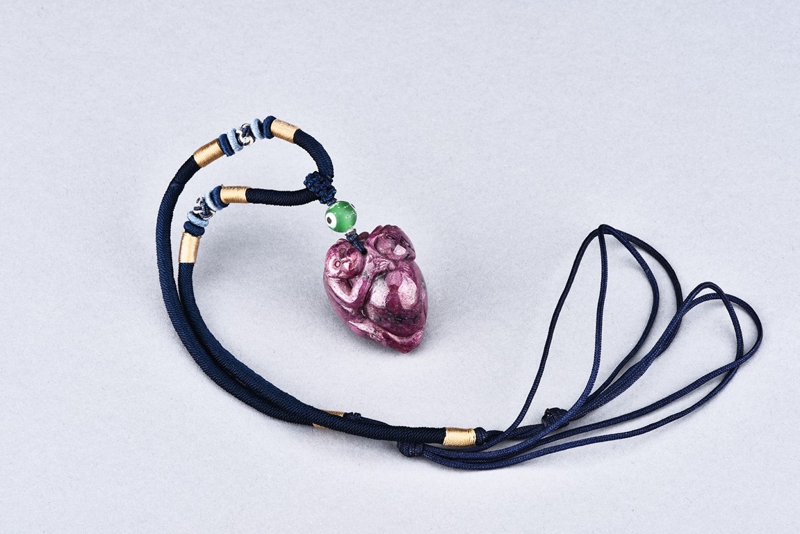 The pendant is modelled in the form of a monkey holding a peach. The stone is of opaque purple tone.