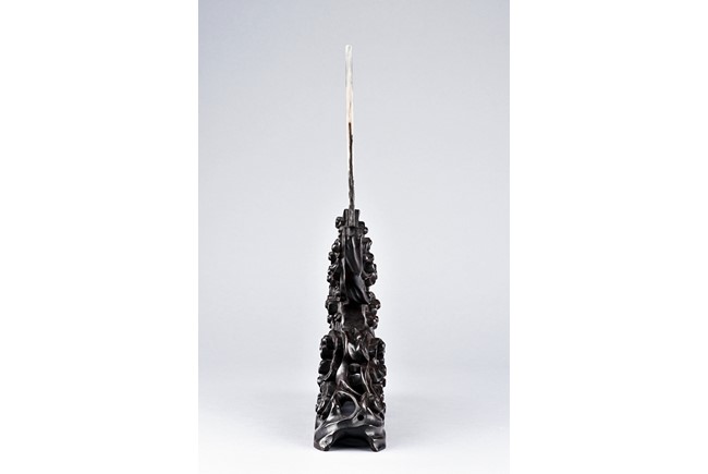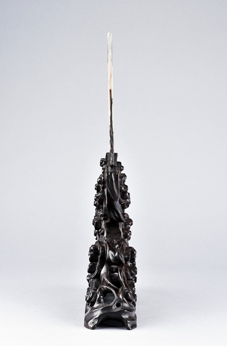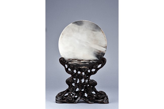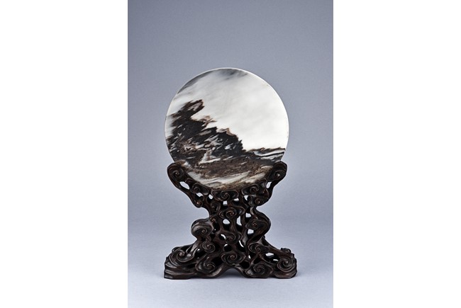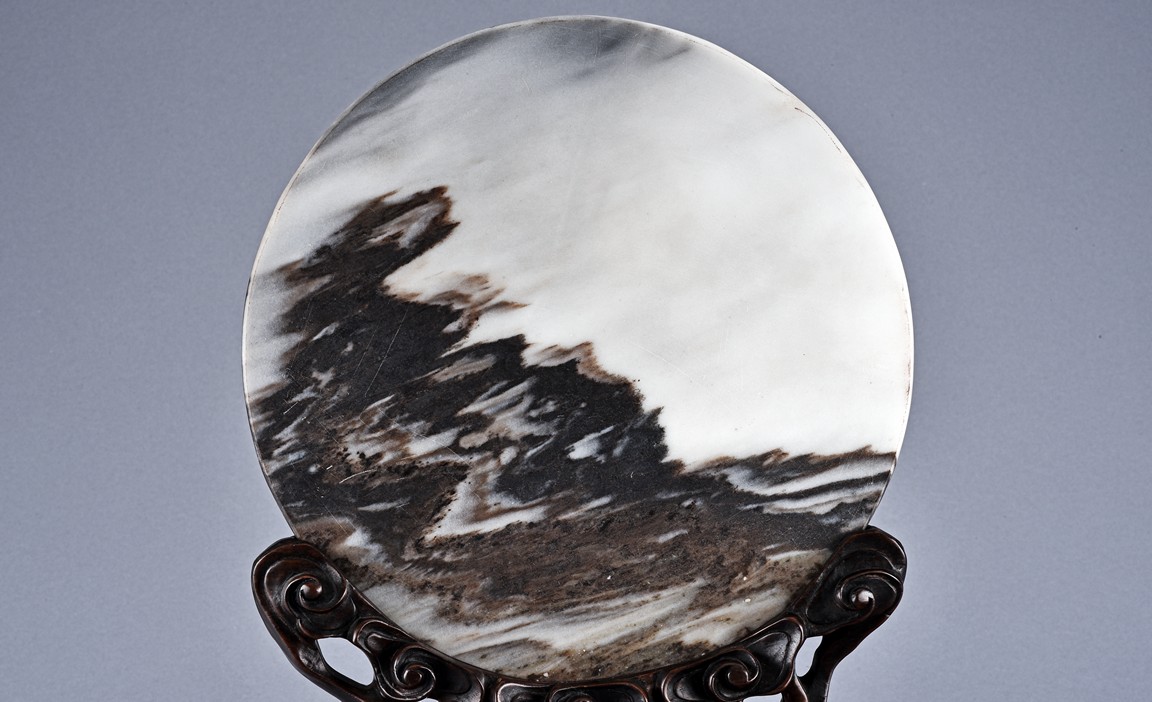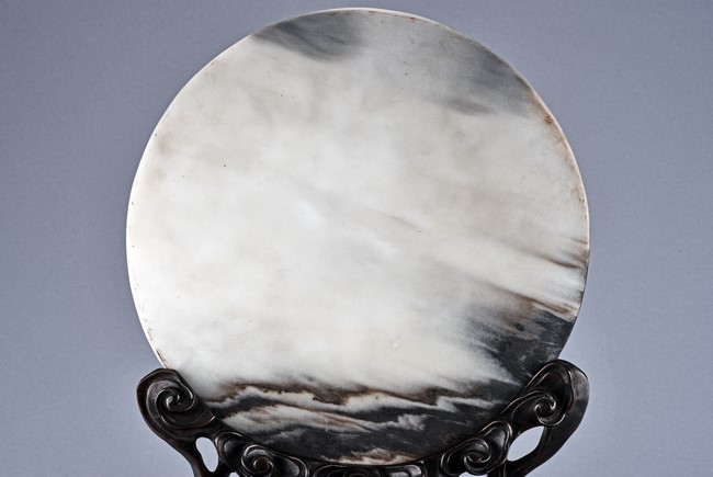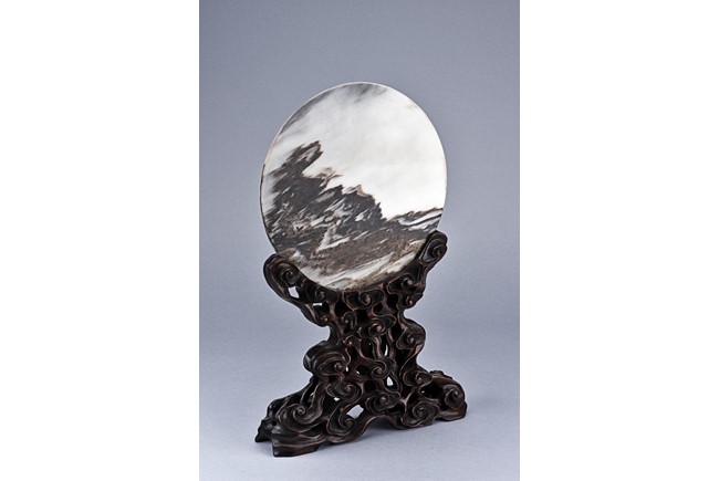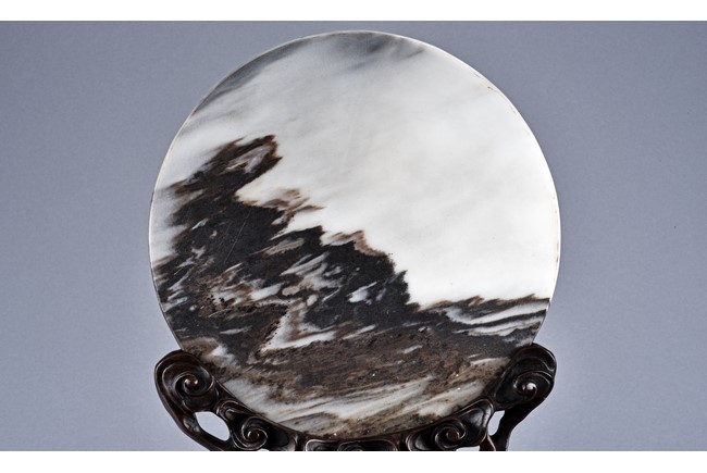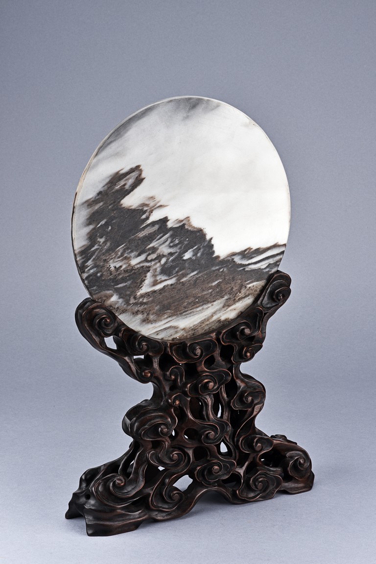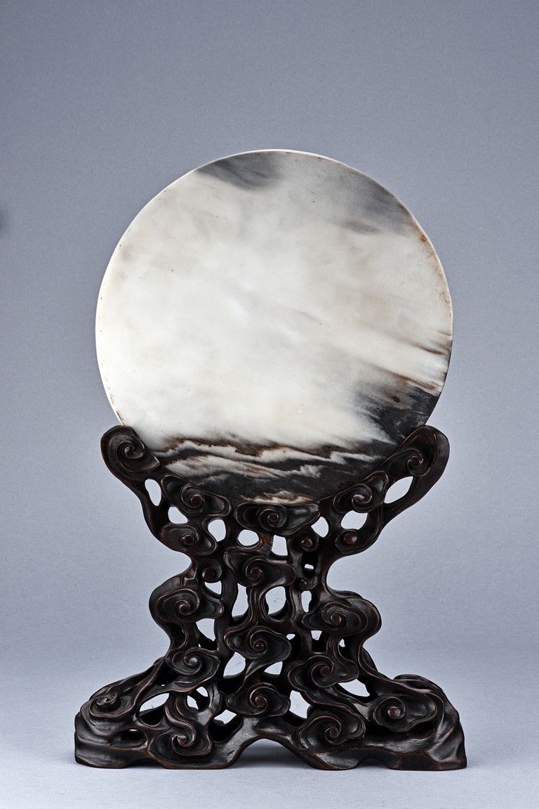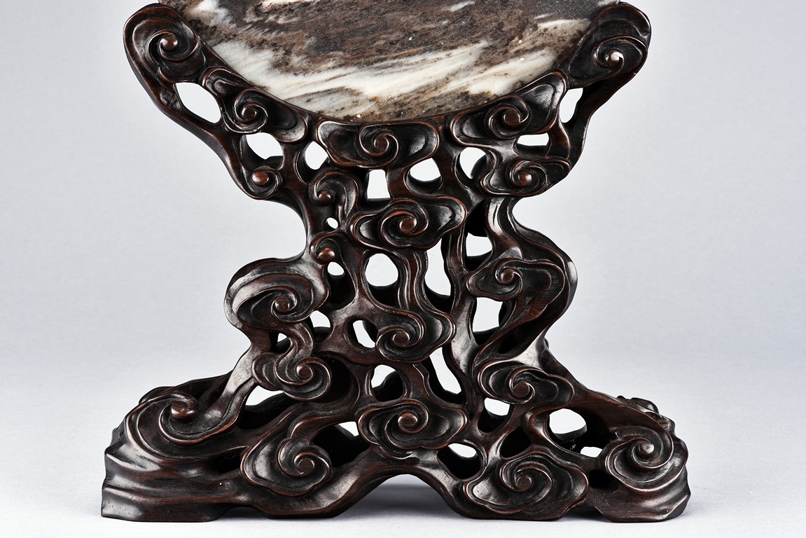 The white marble plaque is of black and dark brown striations, supported on hongmu wood stand, reticulated in openwork with auspicious cloud motif. Qing Dynasty period.