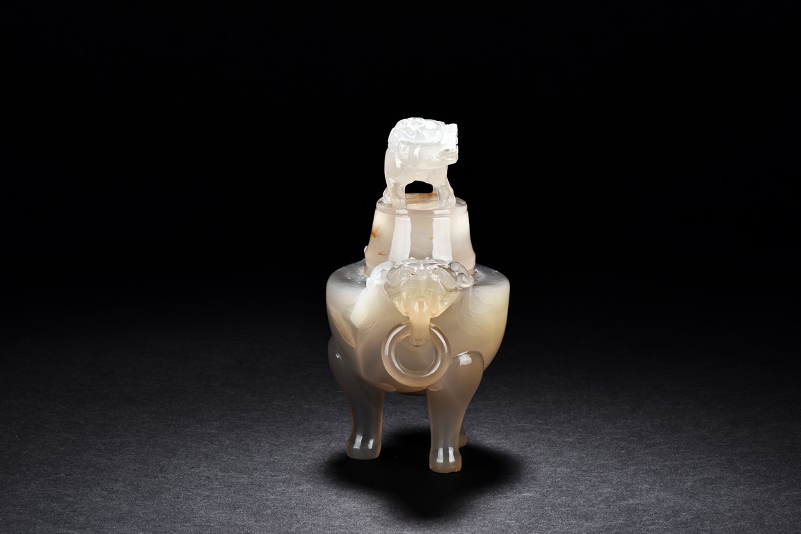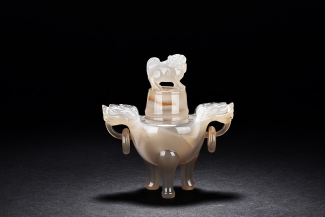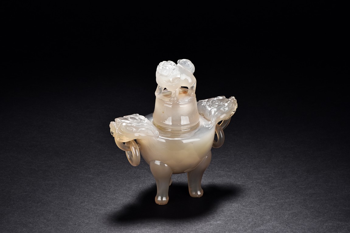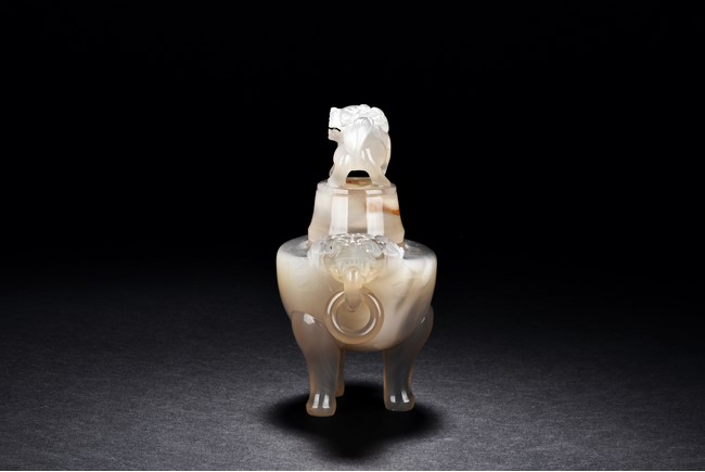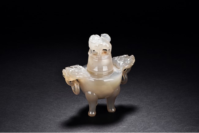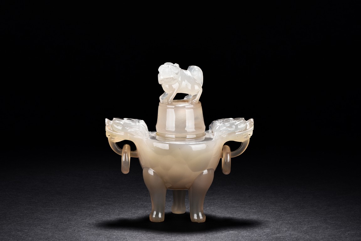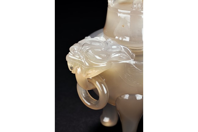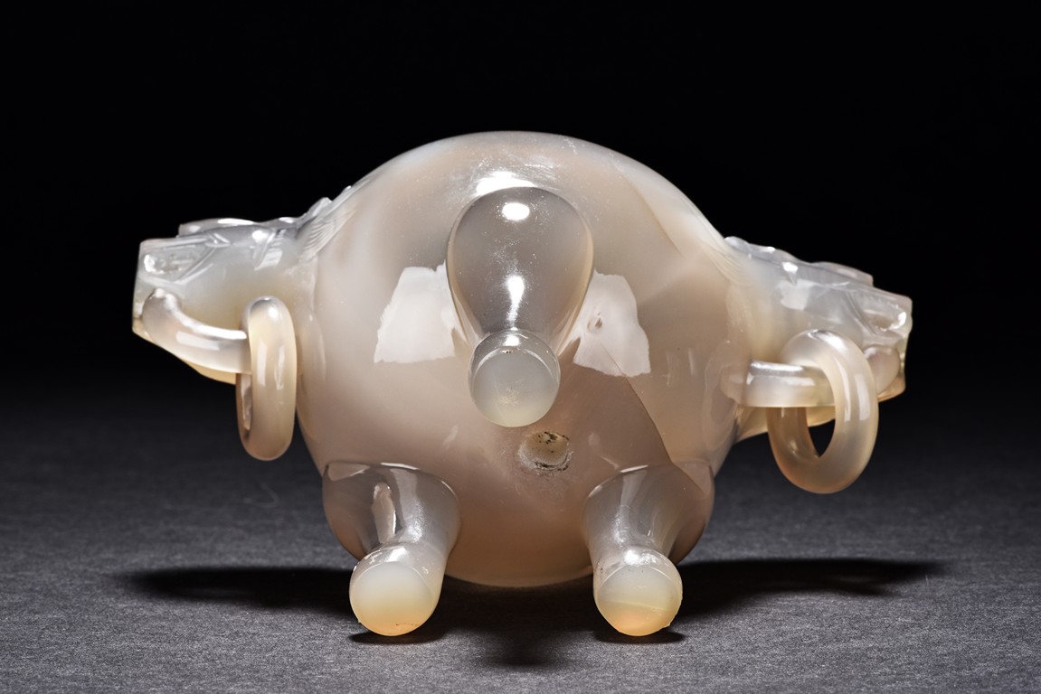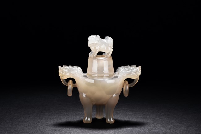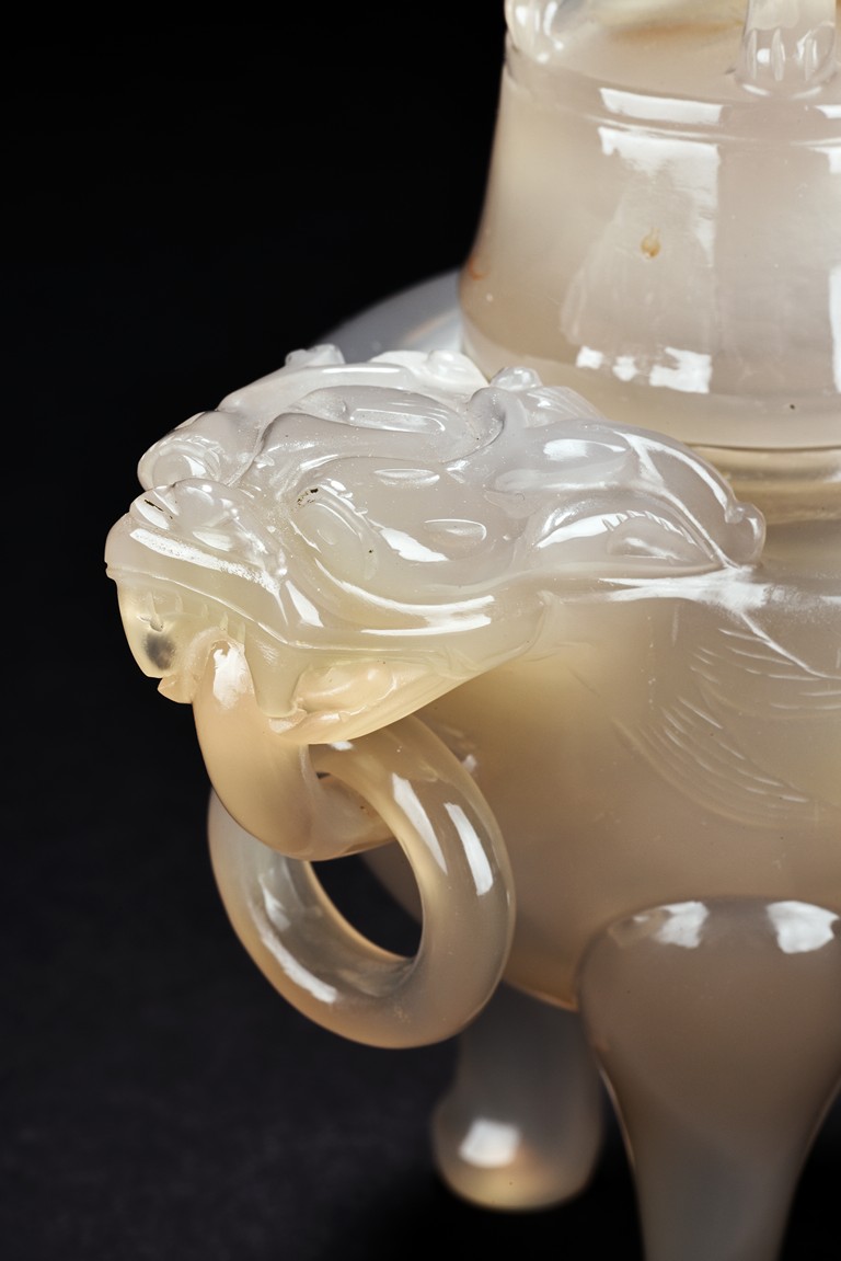 Supported on three long splayed feet, the exterior well polished, body flanked by two beast form handles suspended with rings, the cover with lion-form finial. The stone is of high translucency. Republic period.