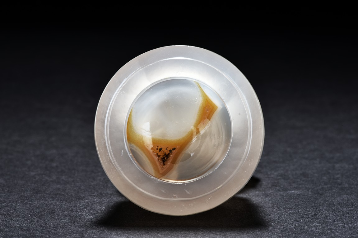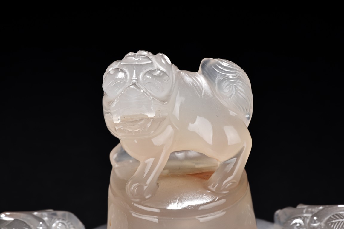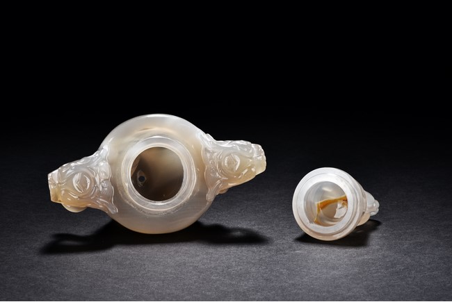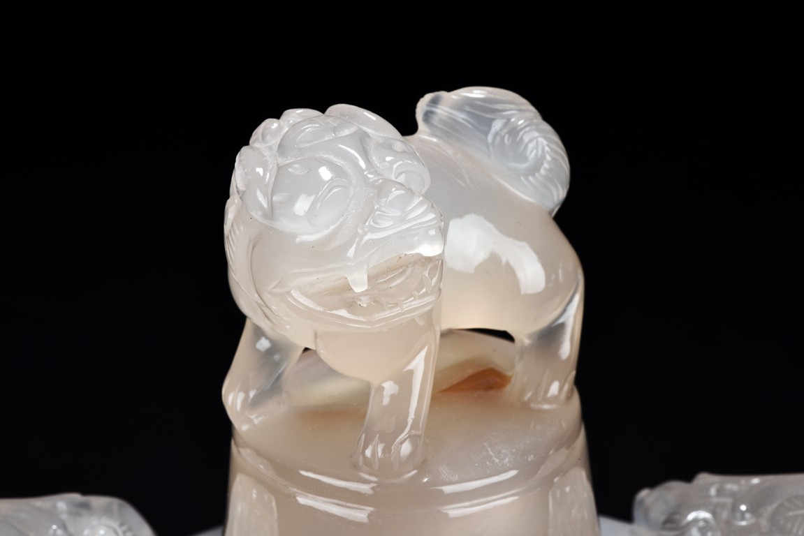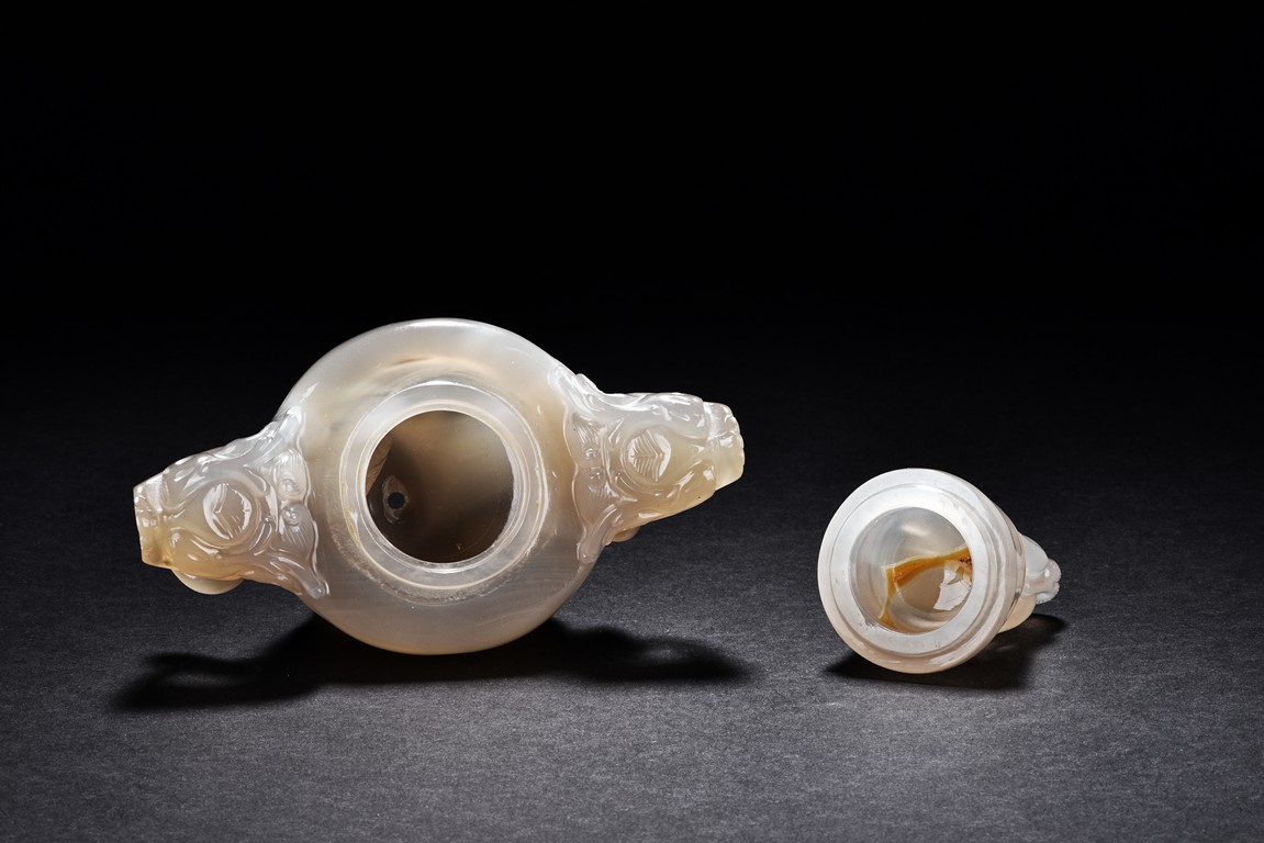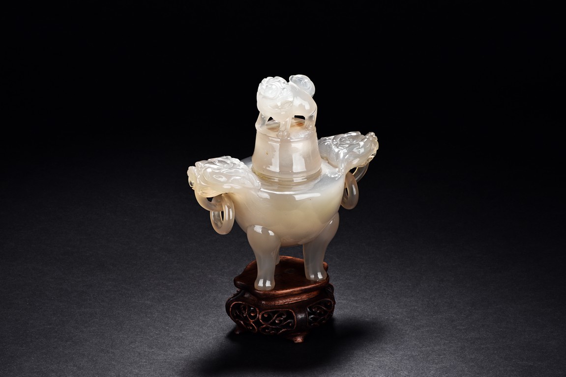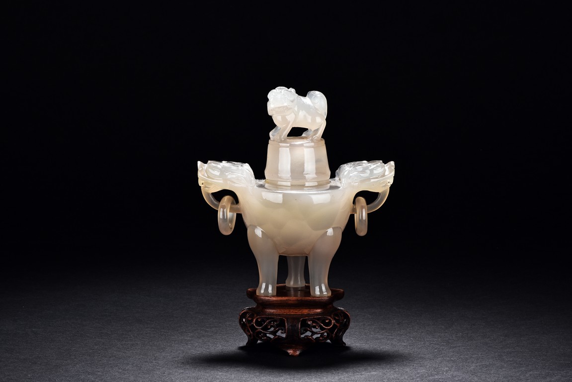 Supported on three long splayed feet, the exterior well polished, body flanked by two beast form handles suspended with rings, the cover with lion-form finial. The stone is of high translucency. Republic period.