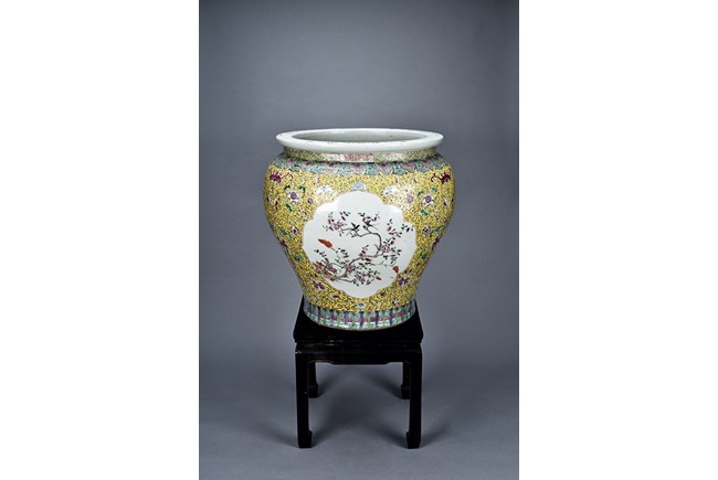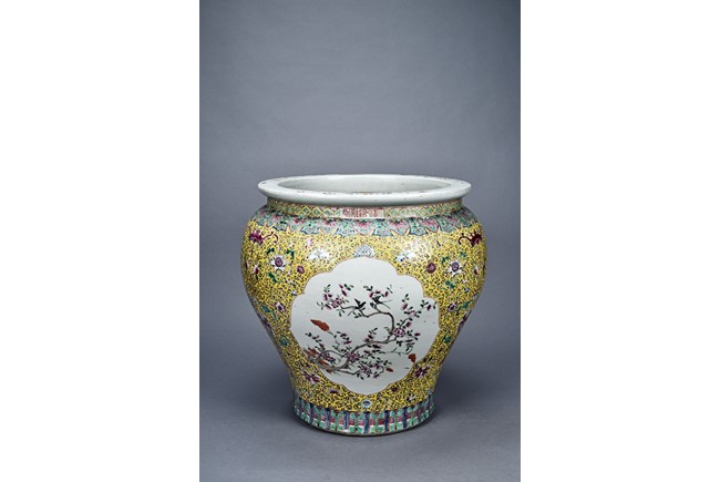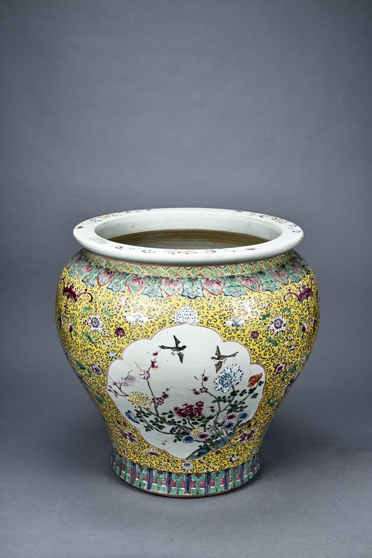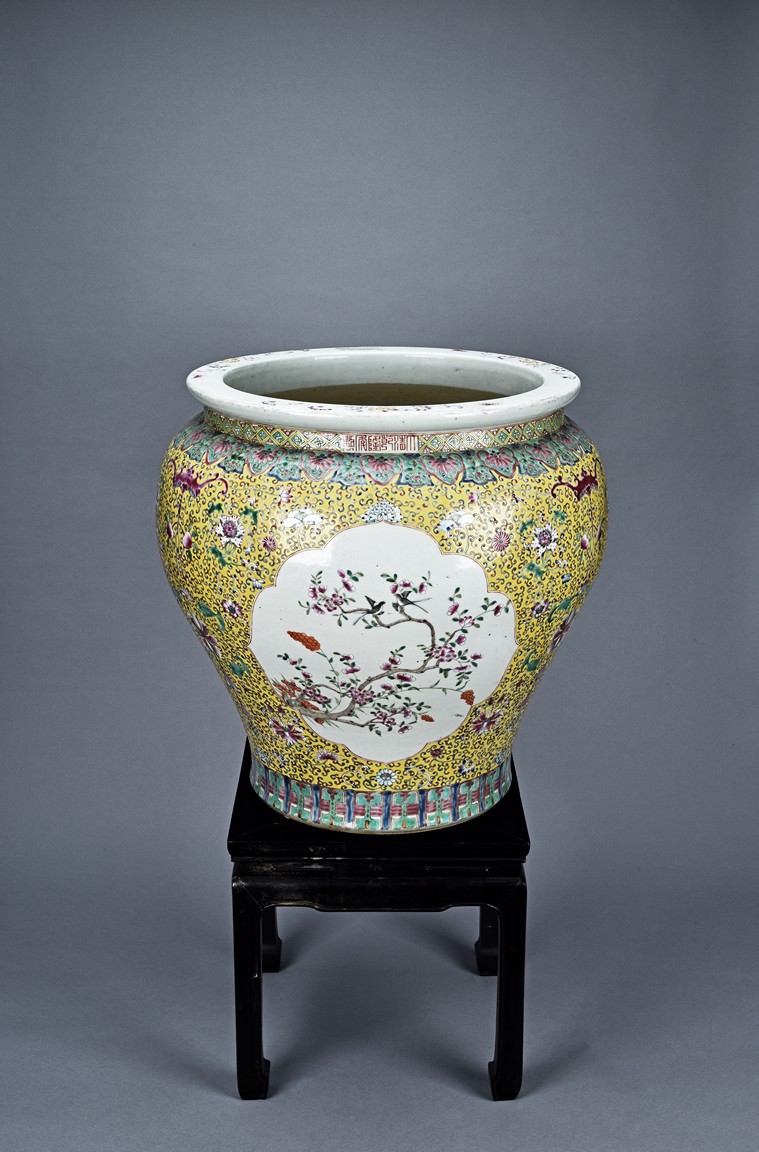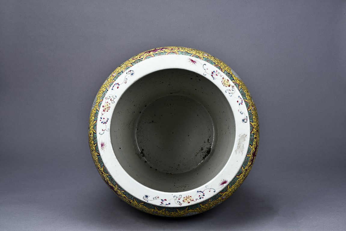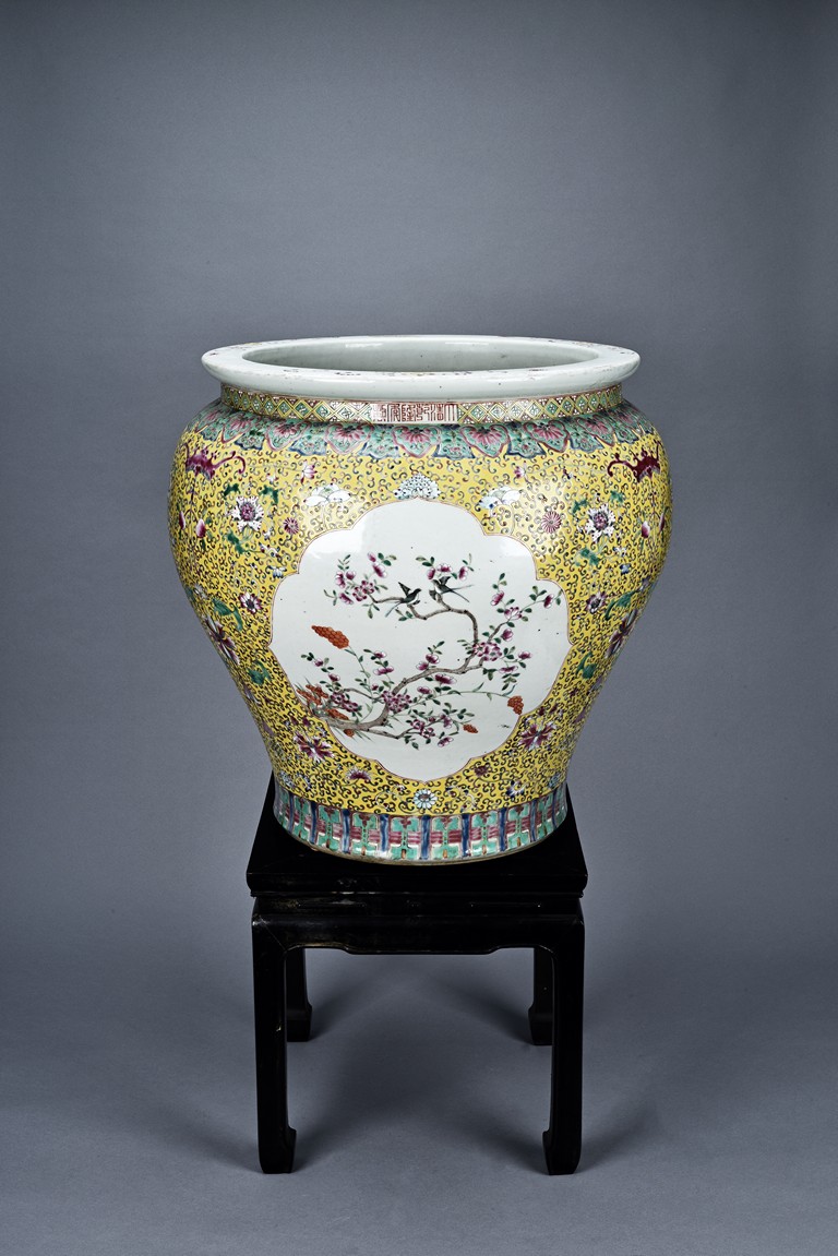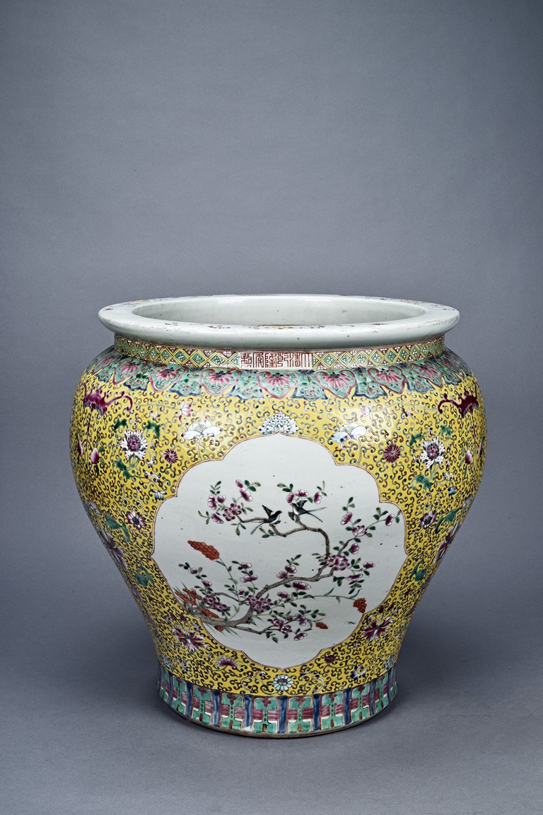 Potted with deep sides and rising to flared mouth rim, it is overall deocrated with repeated scrolling flowering pattern against yellow ground, and enamelled with roundel depicting magpies on plum. The neck bears six character mark 'QIANLONG'. Late Qing Dynasty period.