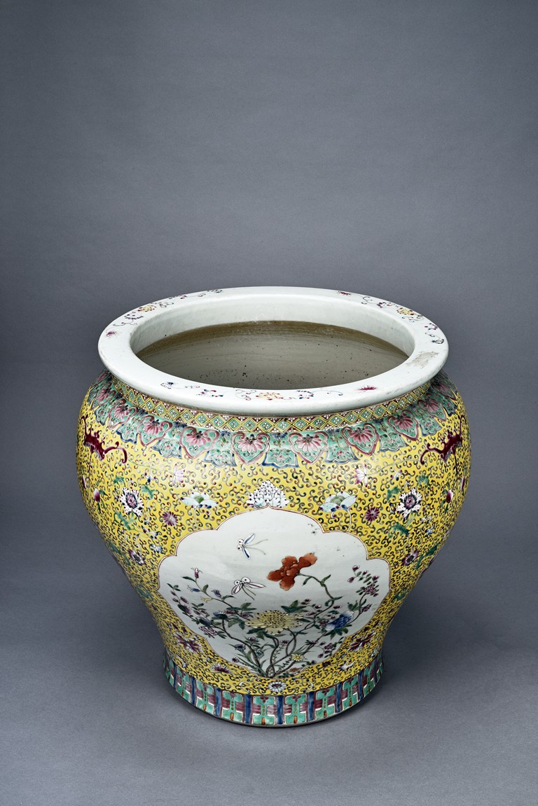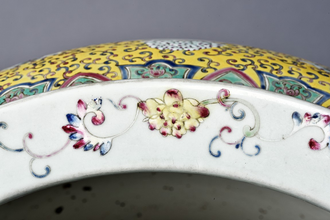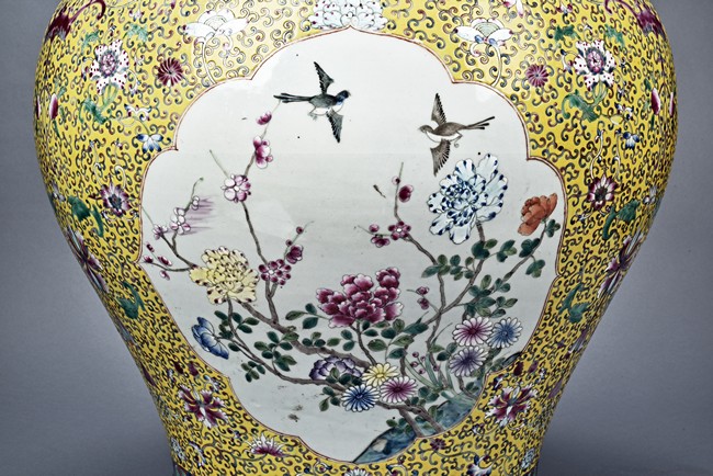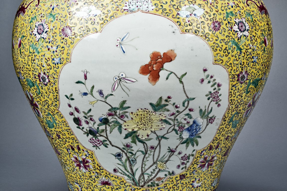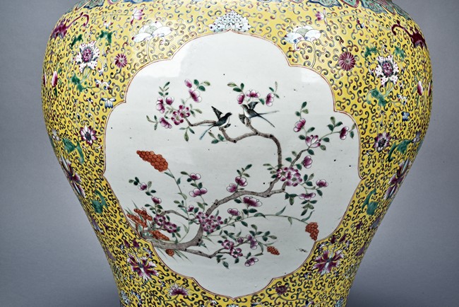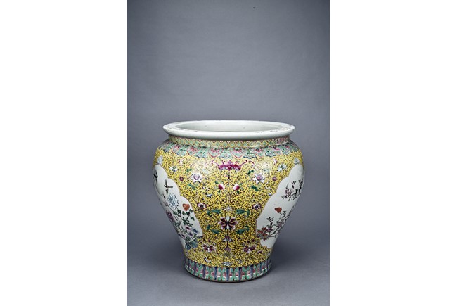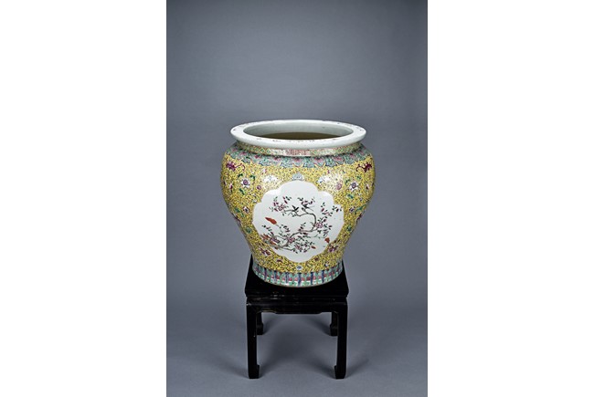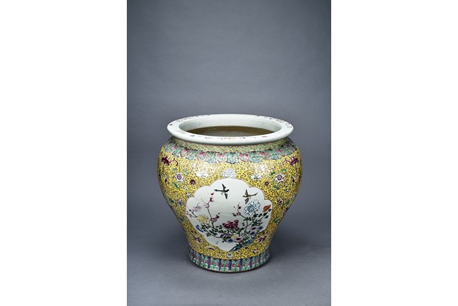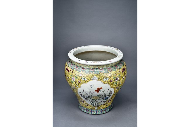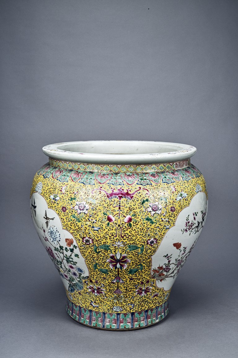 Potted with deep sides and rising to flared mouth rim, it is overall deocrated with repeated scrolling flowering pattern against yellow ground, and enamelled with roundel depicting magpies on plum. The neck bears six character mark 'QIANLONG'. Late Qing Dynasty period.