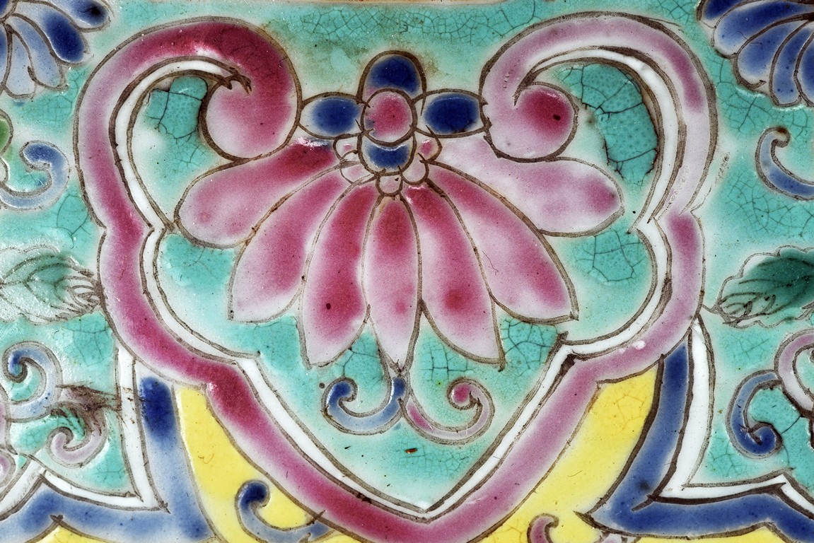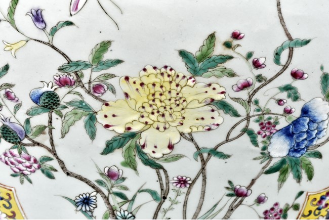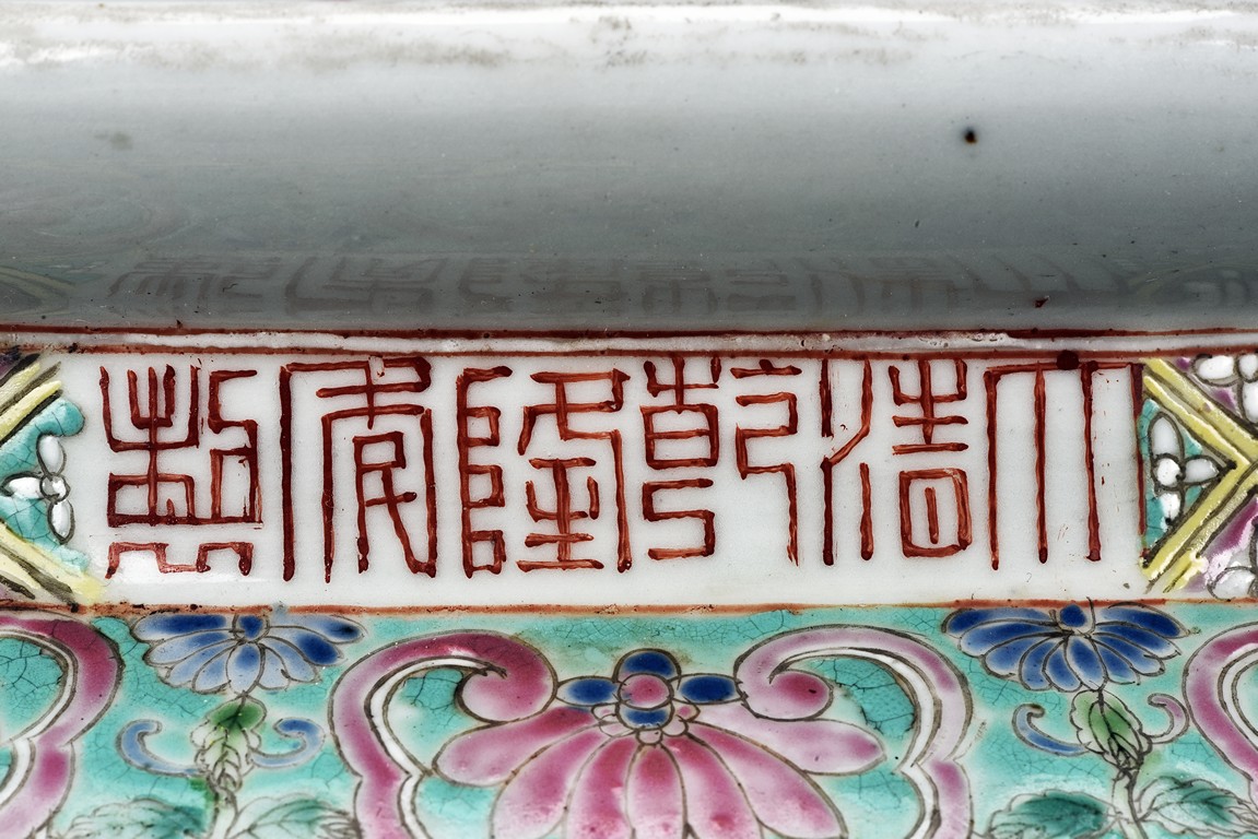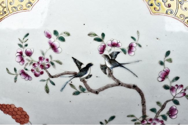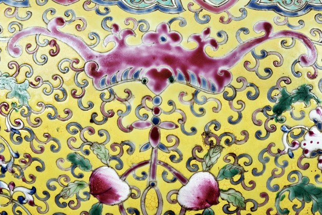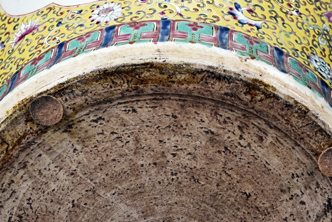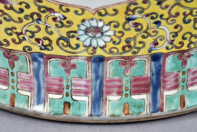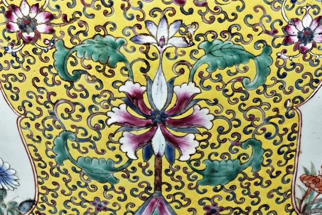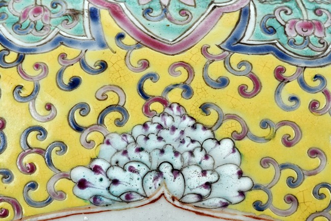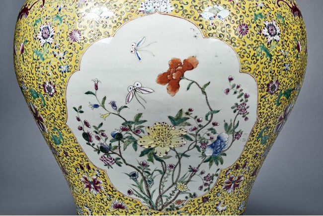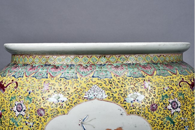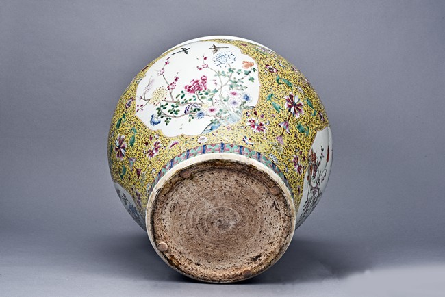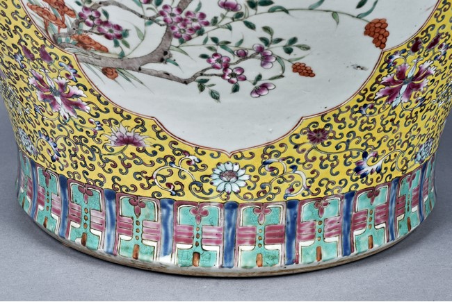 Potted with deep sides and rising to flared mouth rim, it is overall deocrated with repeated scrolling flowering pattern against yellow ground, and enamelled with roundel depicting magpies on plum. The neck bears six character mark 'QIANLONG'. Late Qing Dynasty period.