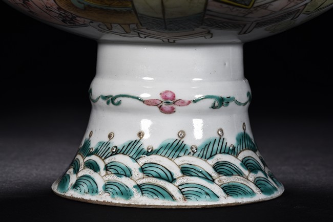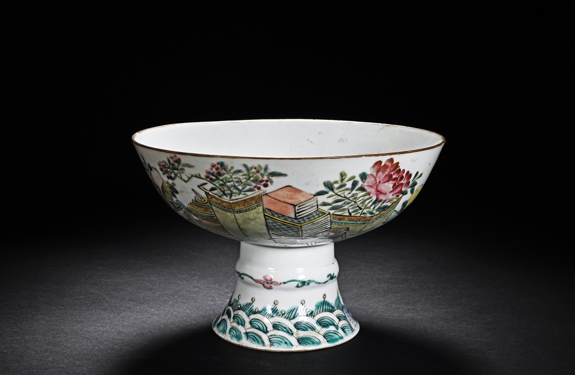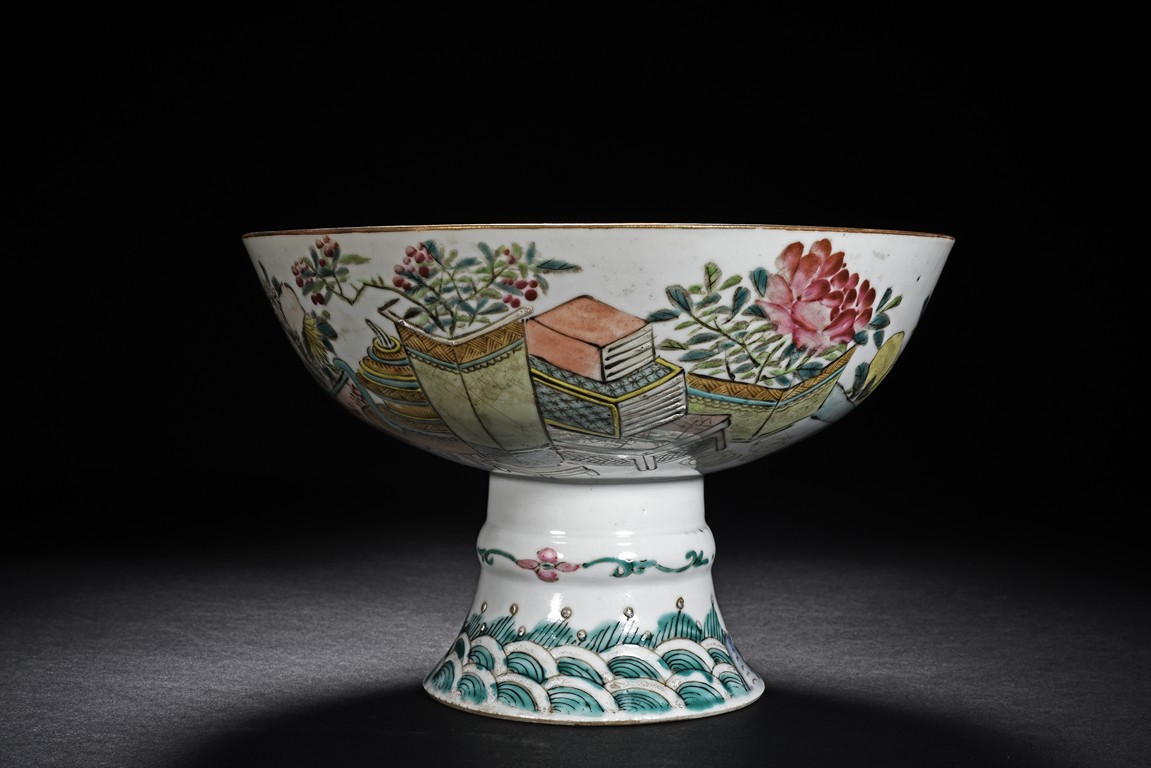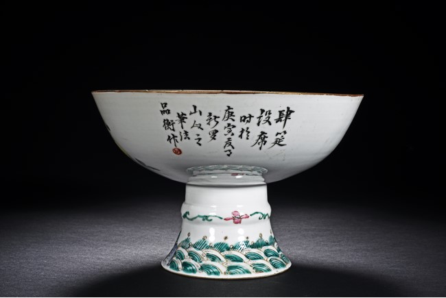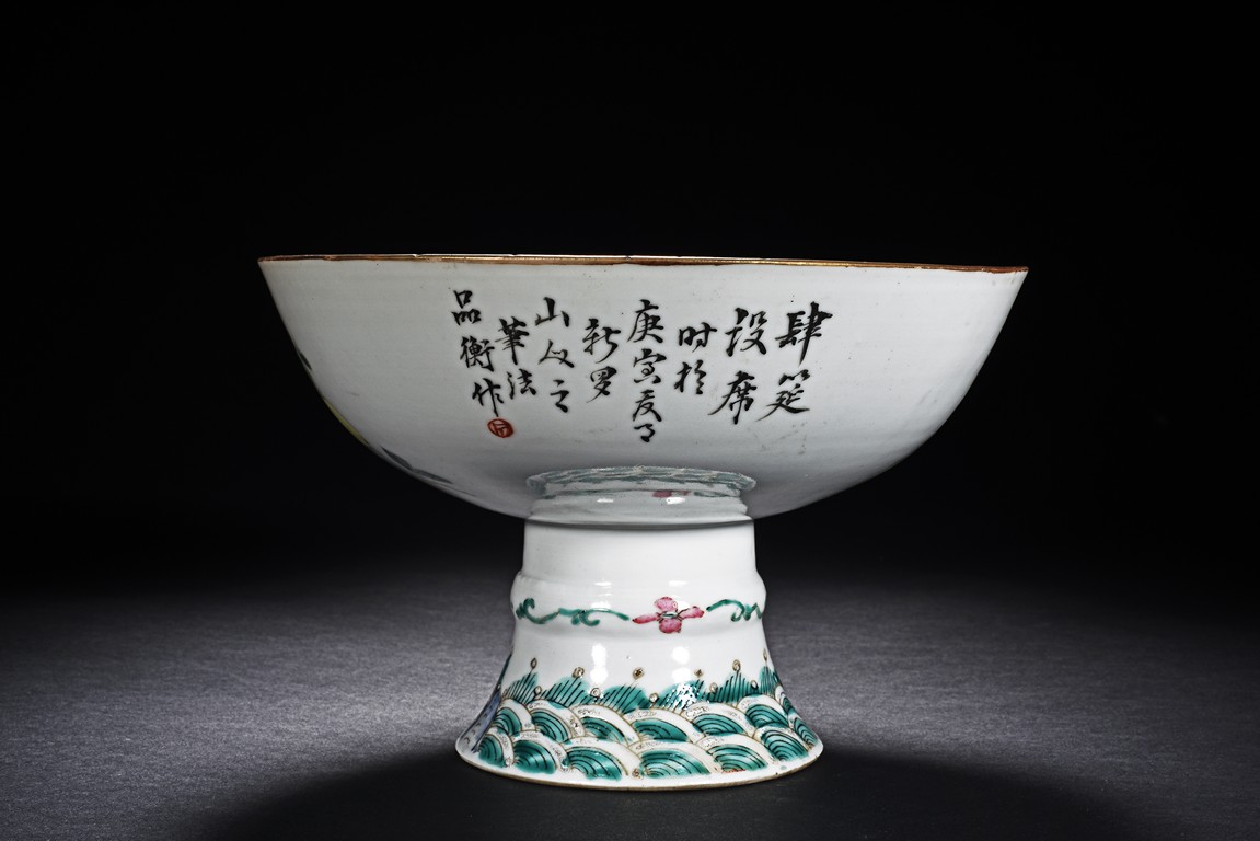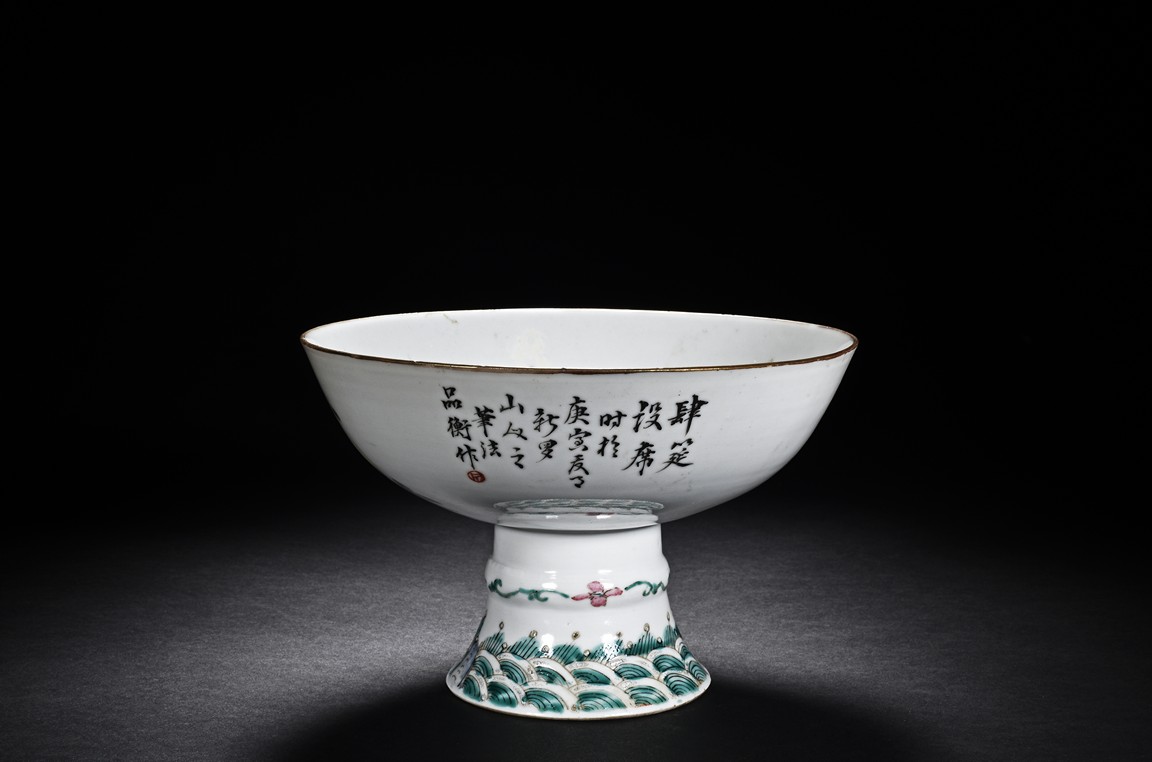 Supported on a spreading stem foot and the rounded sides of the bowl rising to rim, it is decorated in exterior with archaisitic scholar's objects and leafy flowers, the other side with poetic inscription and colophone, the stem foot painted with waves pattern. The interior of the foot painted with four characters ' Wu Tang Wang Zhi'. Late Qing Dynasty Period.