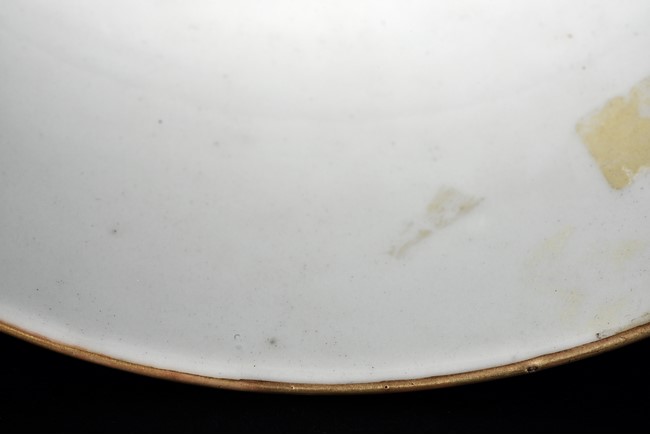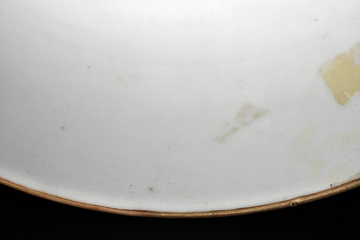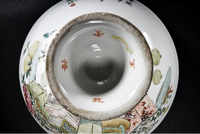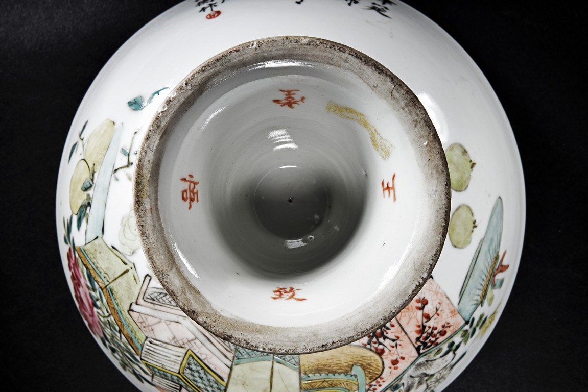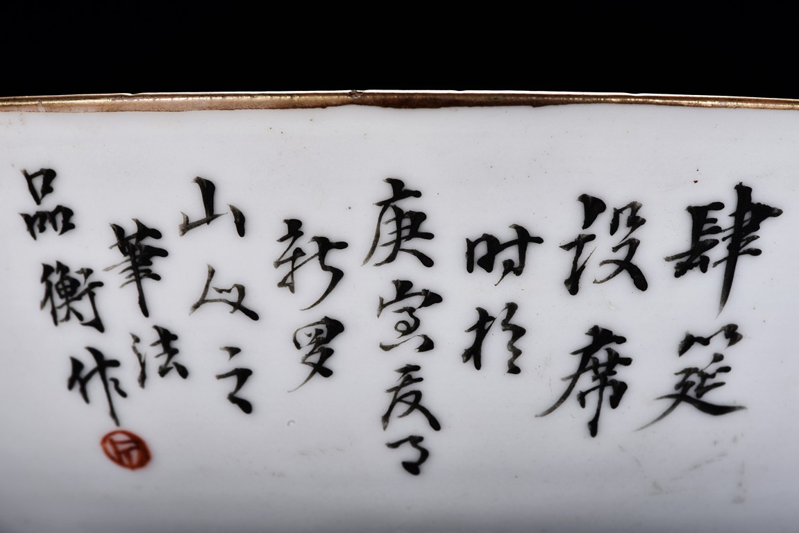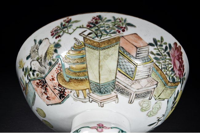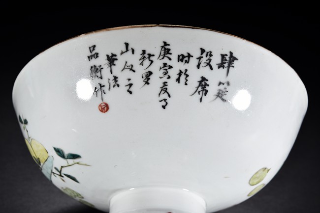 Supported on a spreading stem foot and the rounded sides of the bowl rising to rim, it is decorated in exterior with archaisitic scholar's objects and leafy flowers, the other side with poetic inscription and colophone, the stem foot painted with waves pattern. The interior of the foot painted with four characters ' Wu Tang Wang Zhi'. Late Qing Dynasty Period.