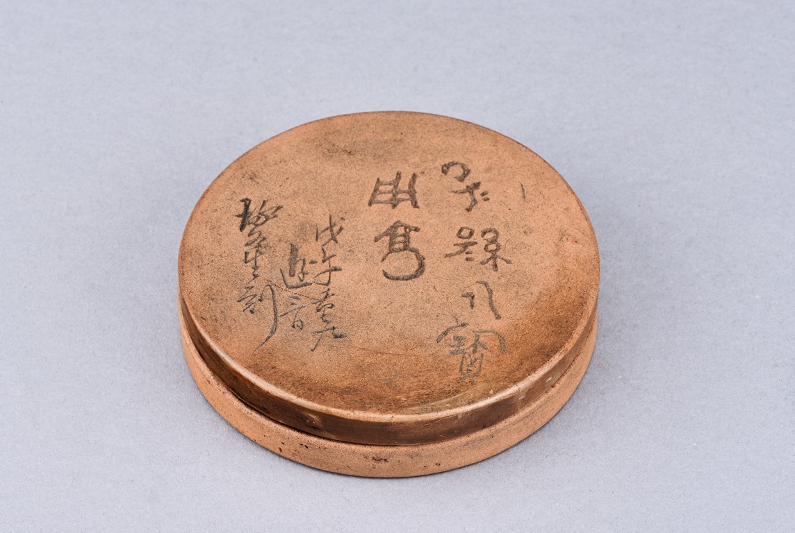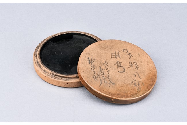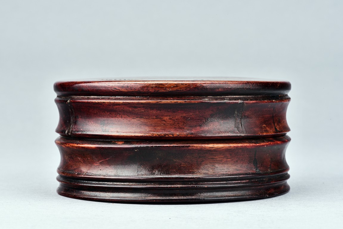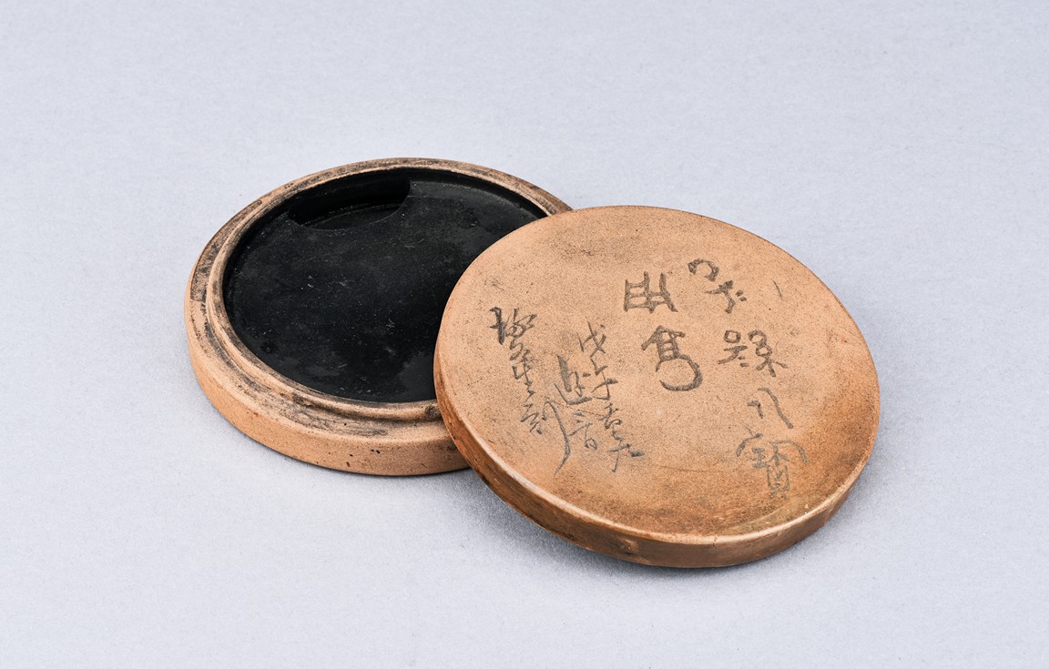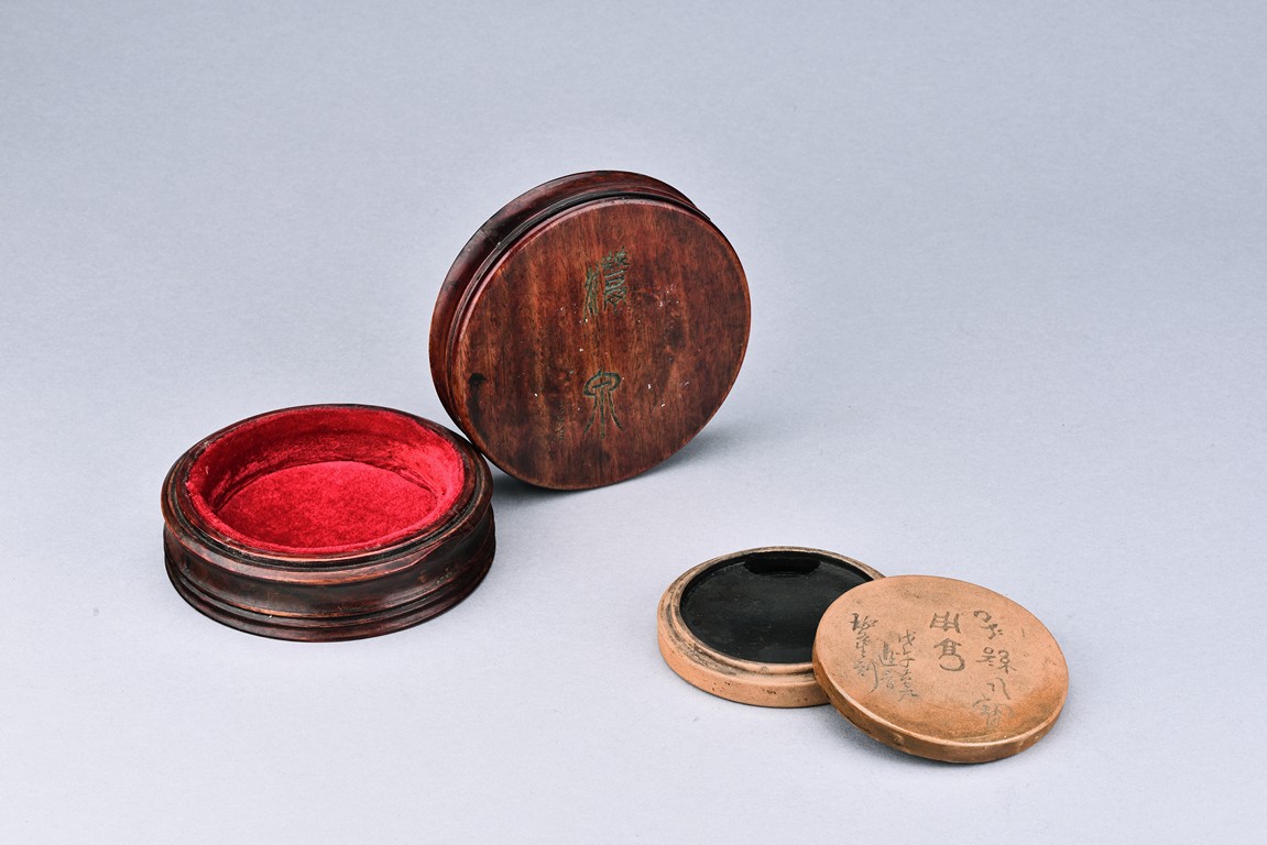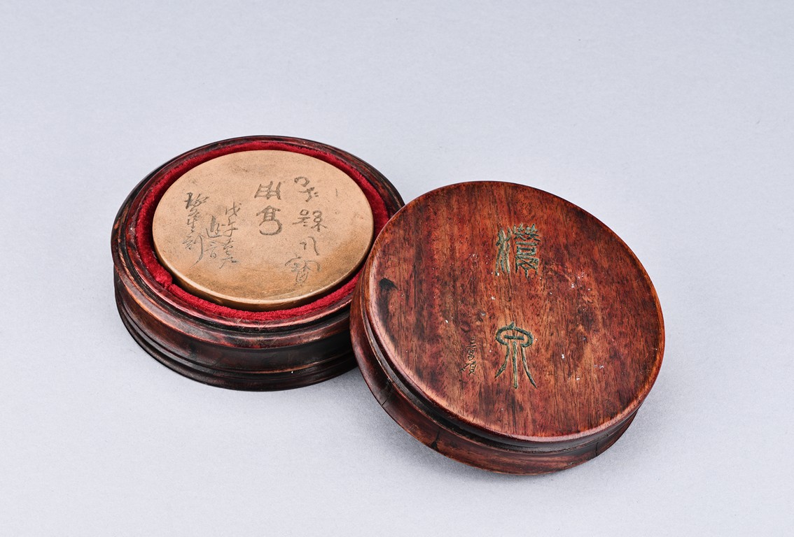 Of circular form, the duan-clay cover inscribed with characters. Accompanied with a wooden box with cover inscribed with two characters.