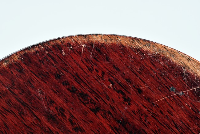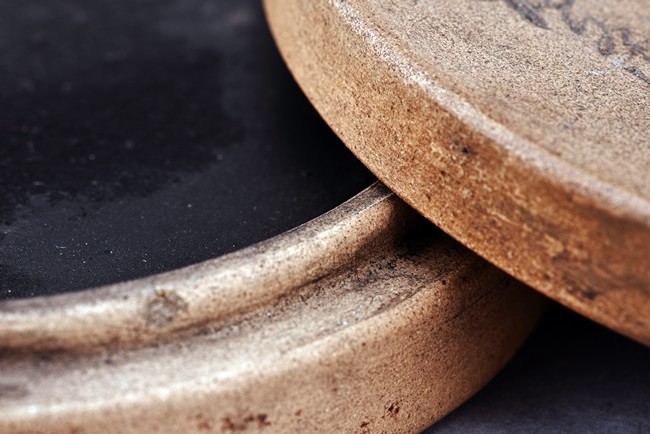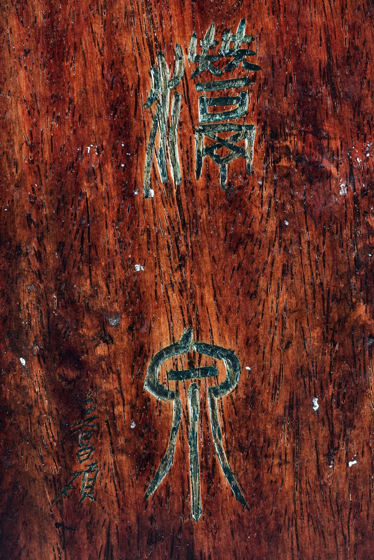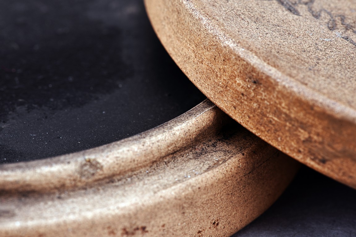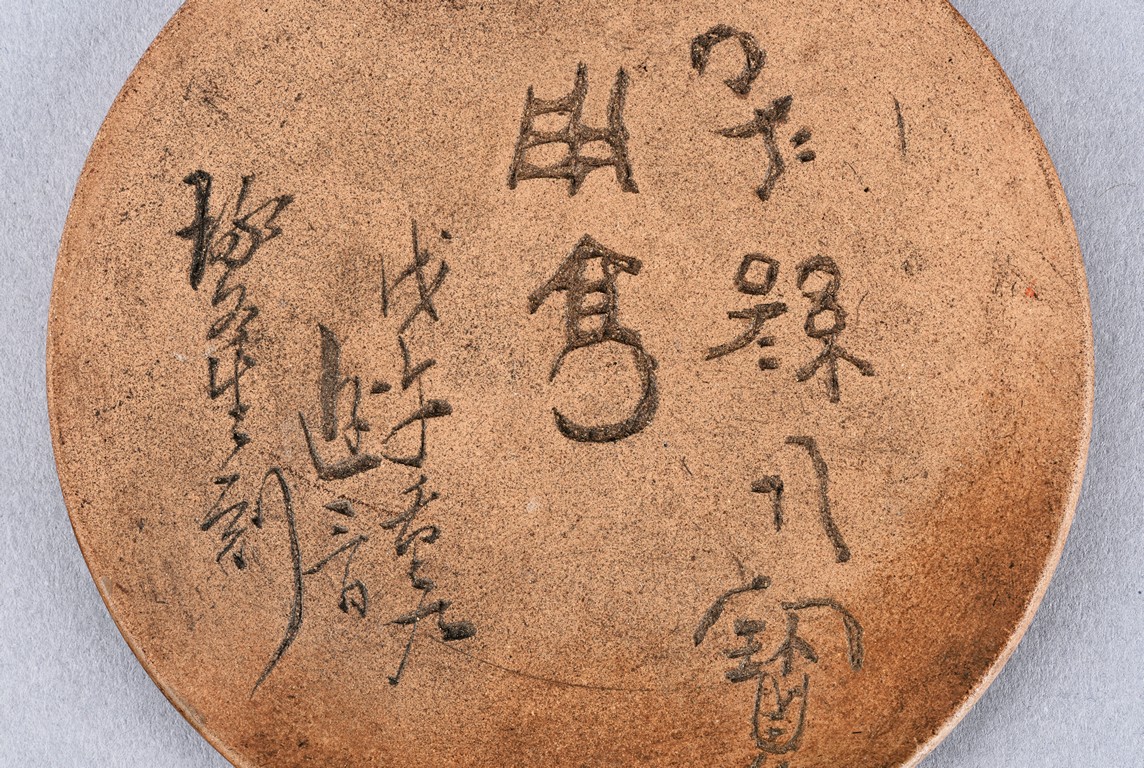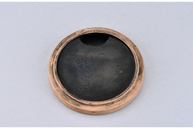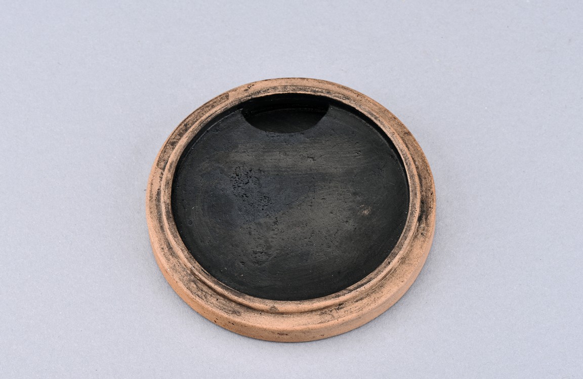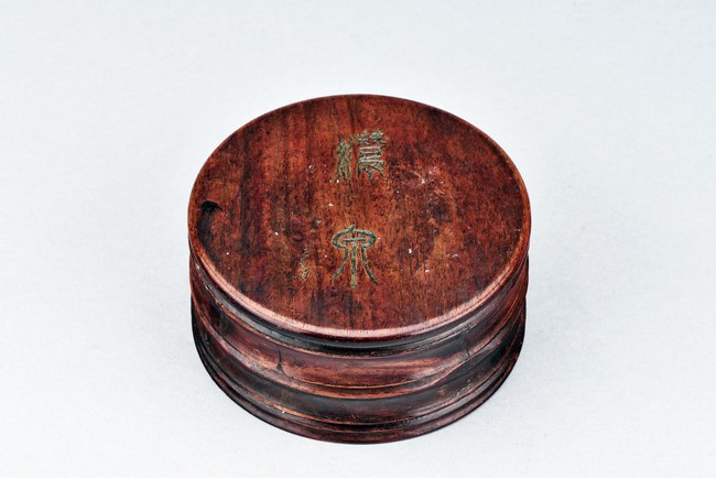 Of circular form, the duan-clay cover inscribed with characters. Accompanied with a wooden box with cover inscribed with two characters.