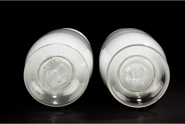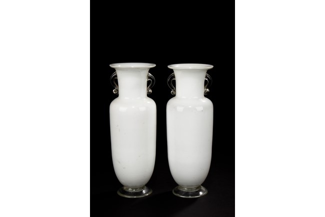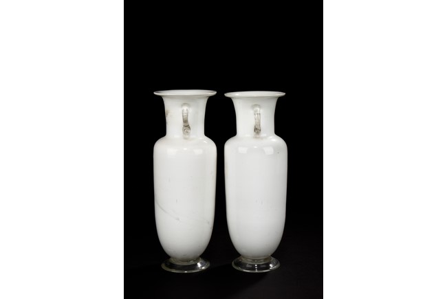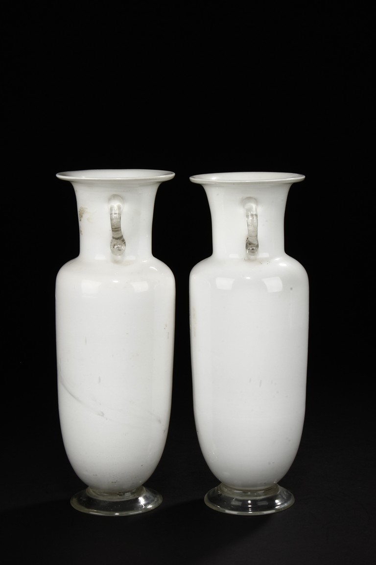 Of elegant and slender form, the body made from white glass, supported by clear glass splayed foot, with a pair of clear glass handles on the neck, below the flaring rims. Qing Dynasty period.