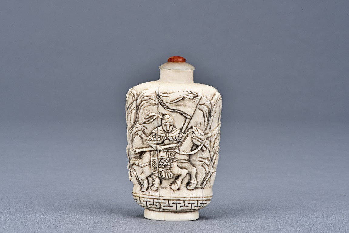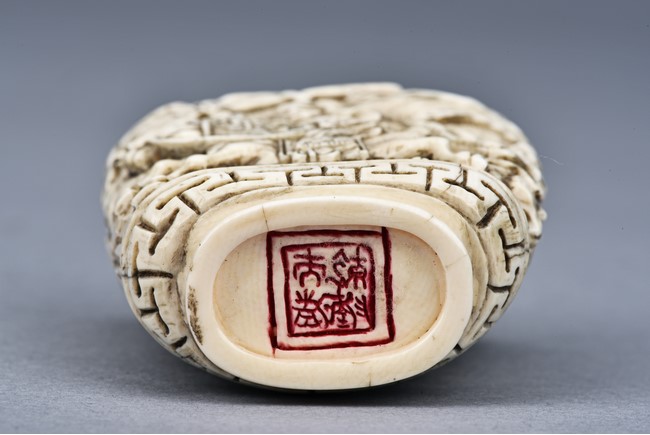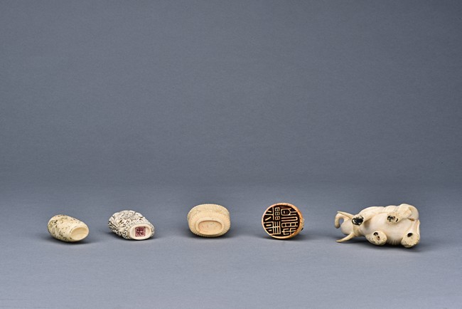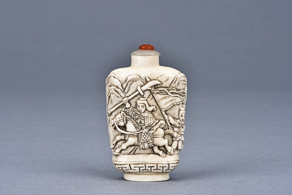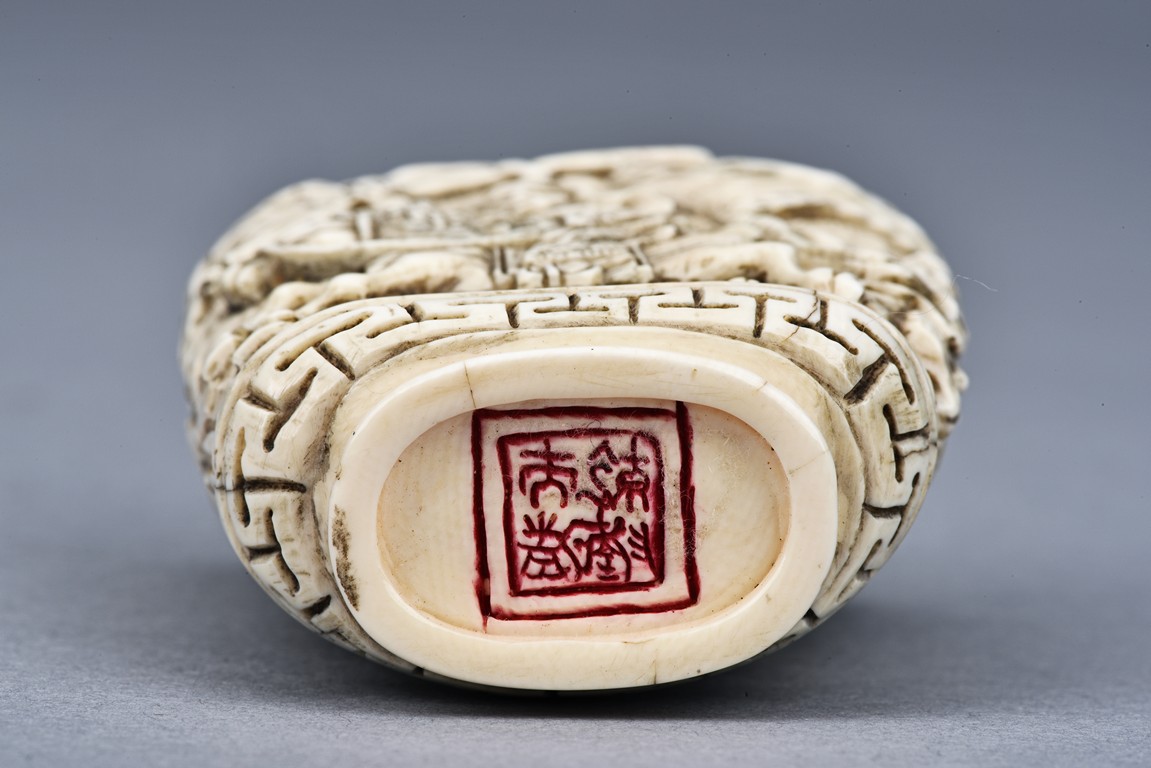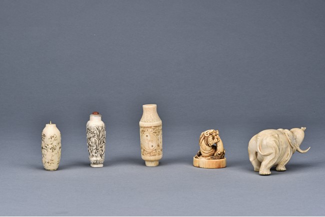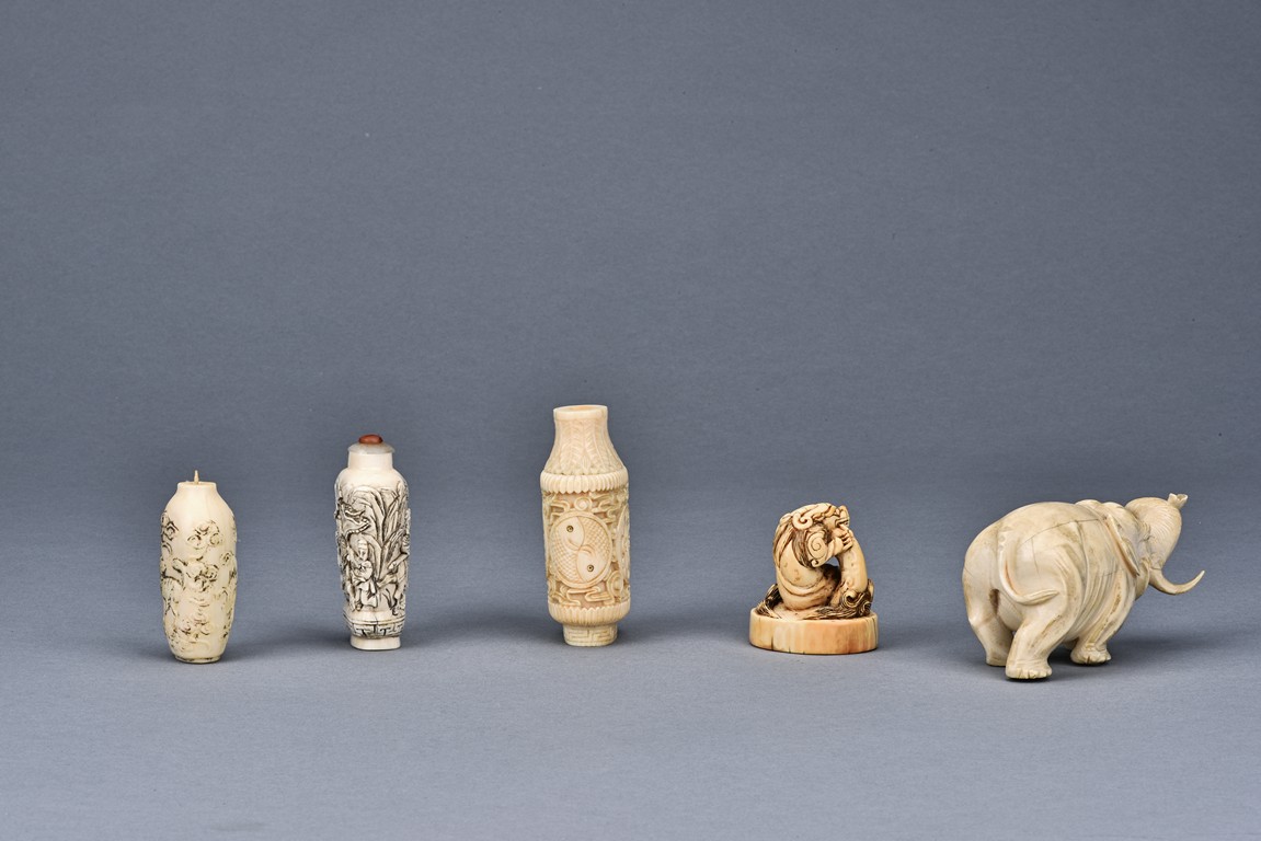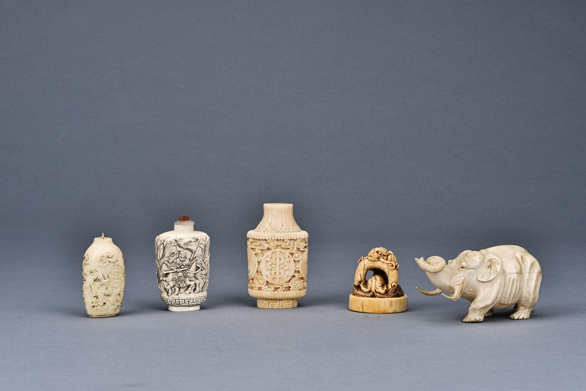 Comprised of three ivory snuff bottles carved in relief on the body, one ivory seal surmounted with mythical beast top, and one ivory elephant.