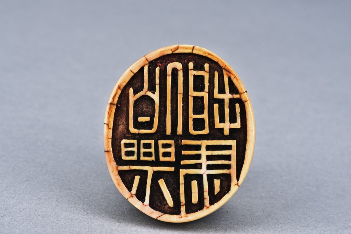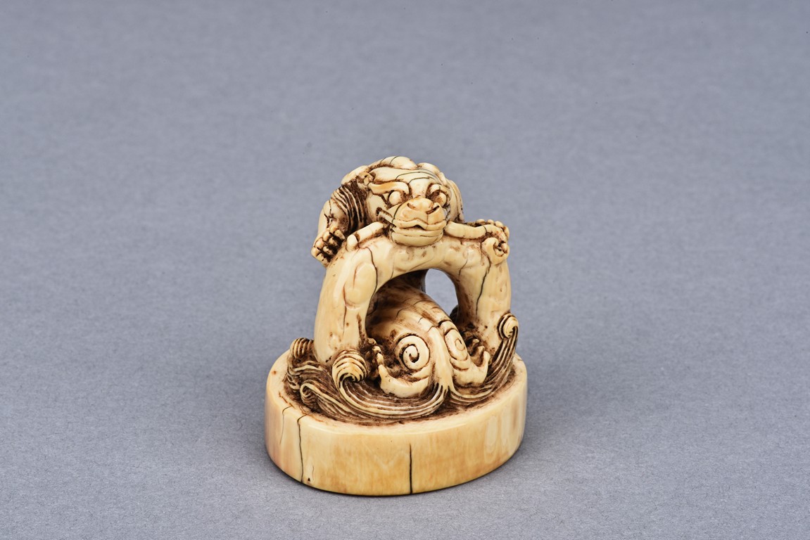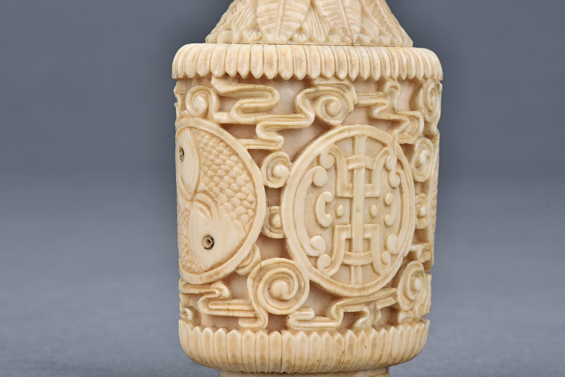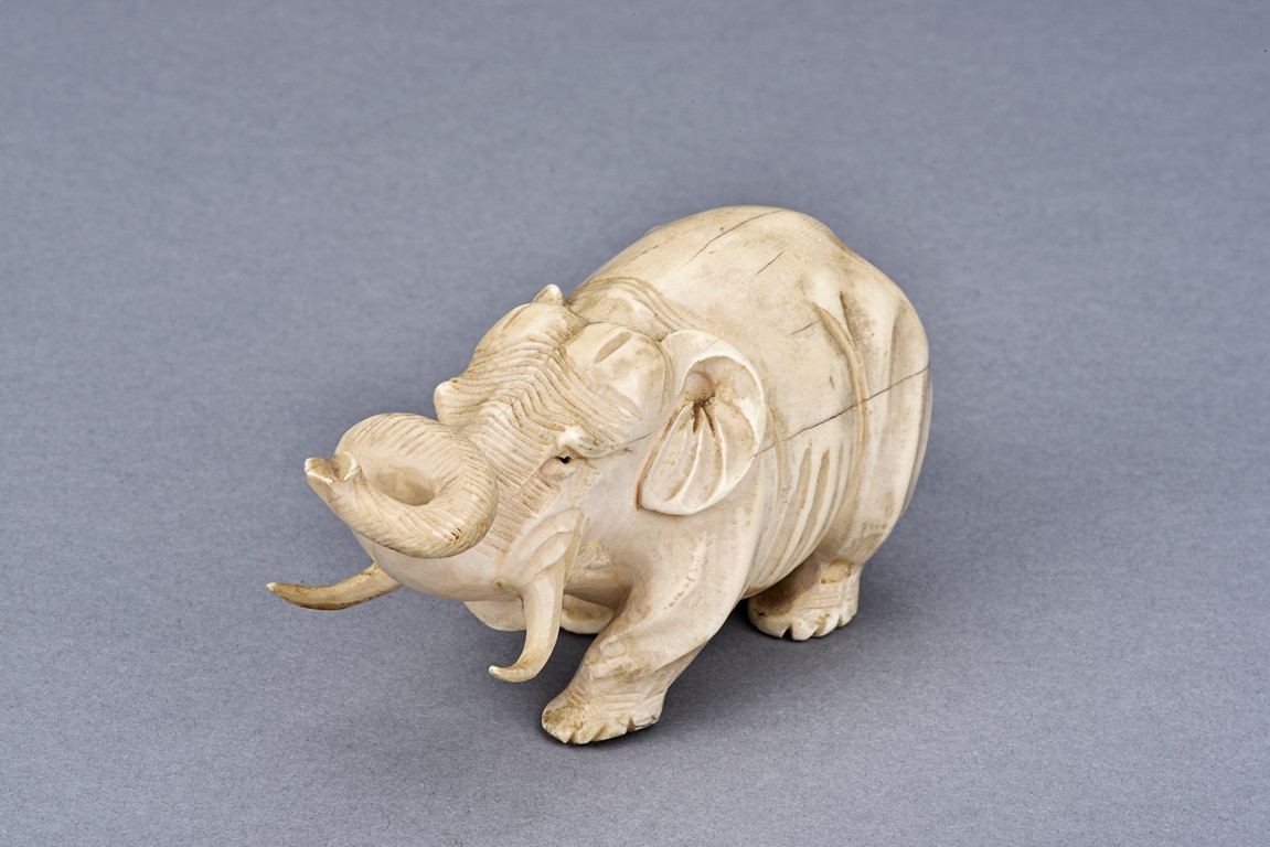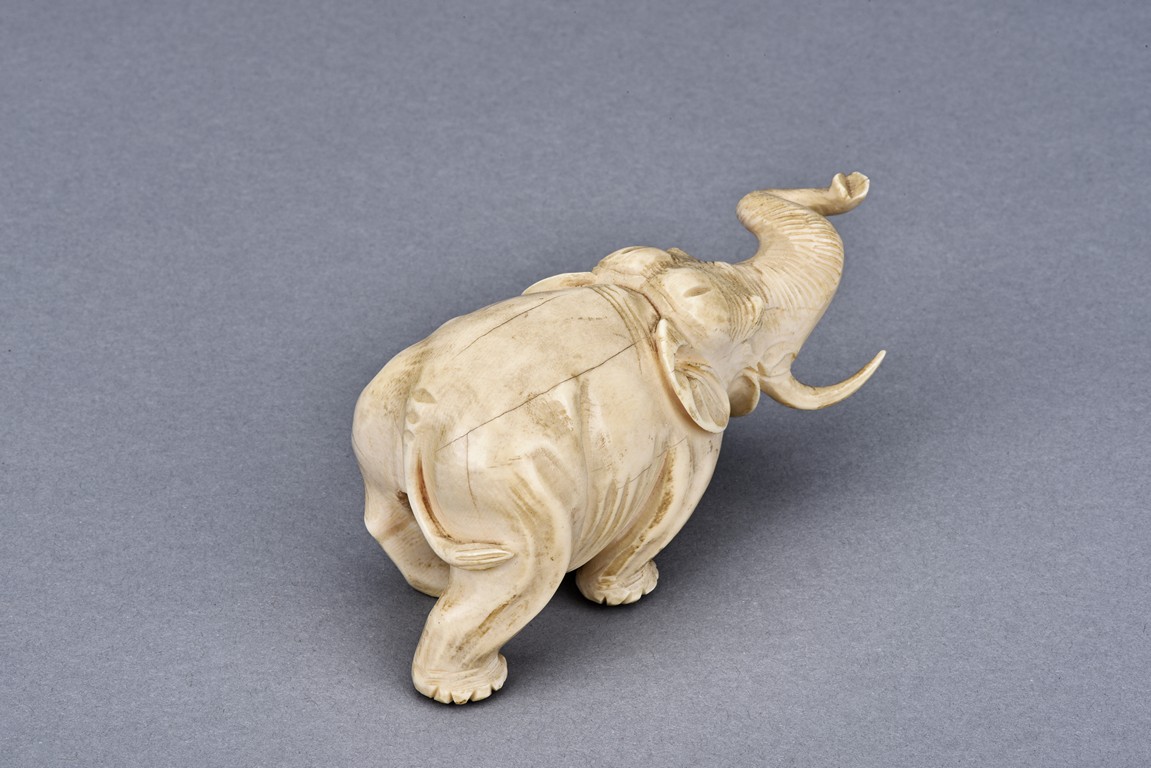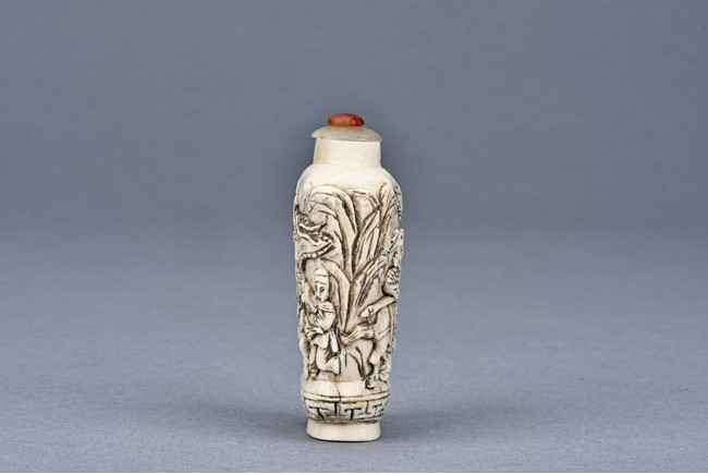 Comprised of three ivory snuff bottles carved in relief on the body, one ivory seal surmounted with mythical beast top, and one ivory elephant.