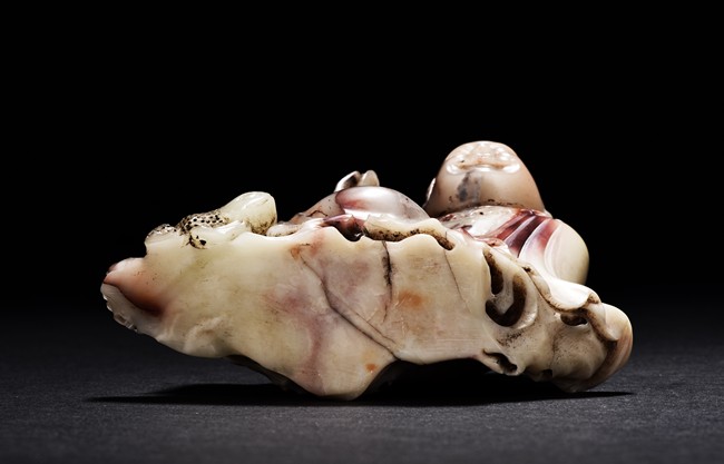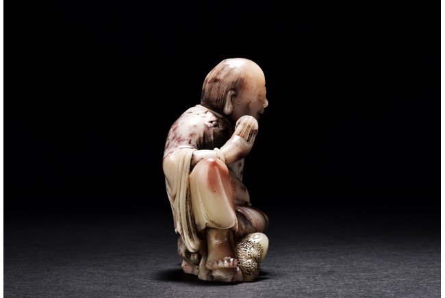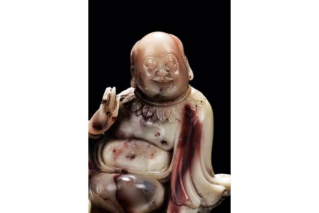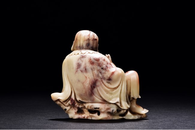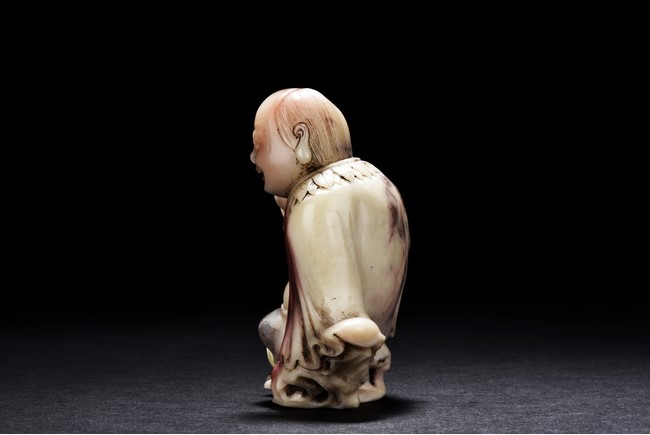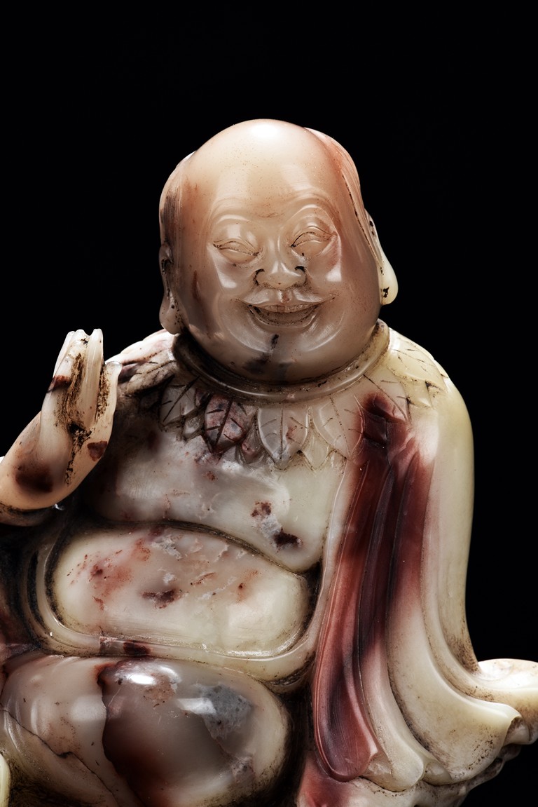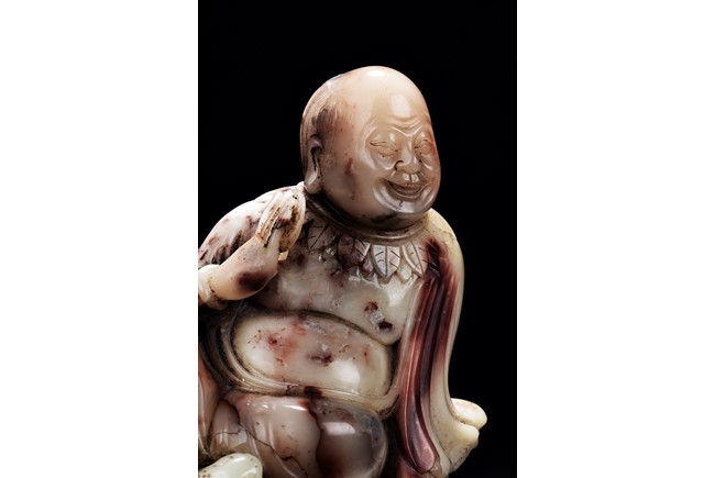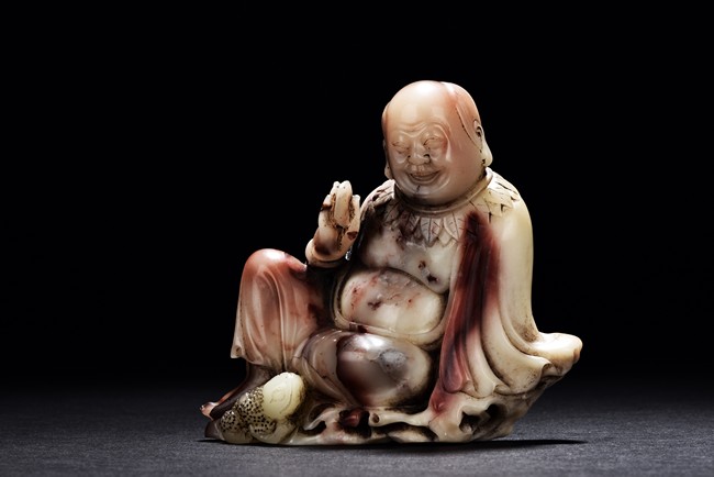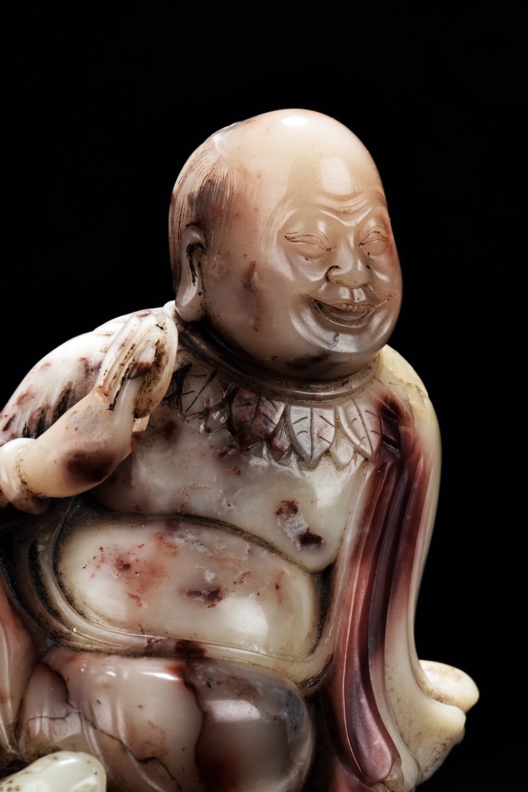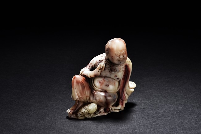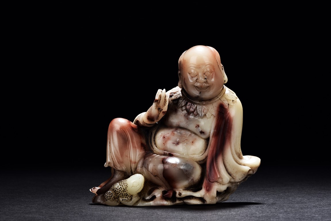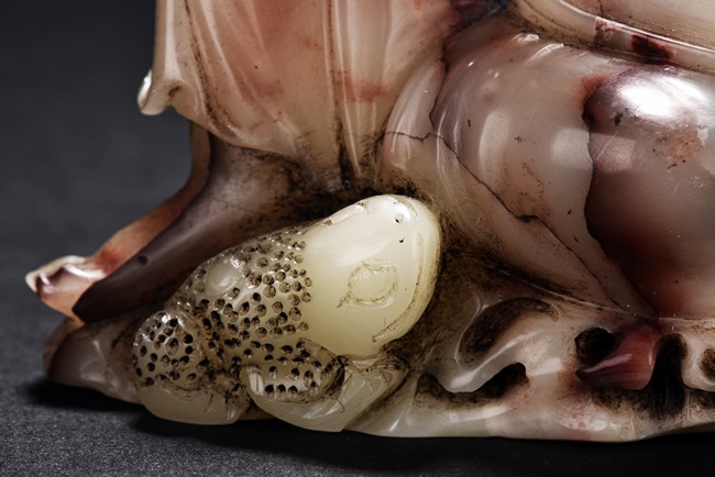 The figure carved seated on his left foot laying against rock with right foot stepping upon the golden toad, his right hand holding a coin, face with joyful expression, wearing loose robe exposing belly.