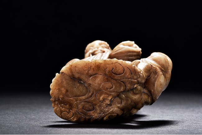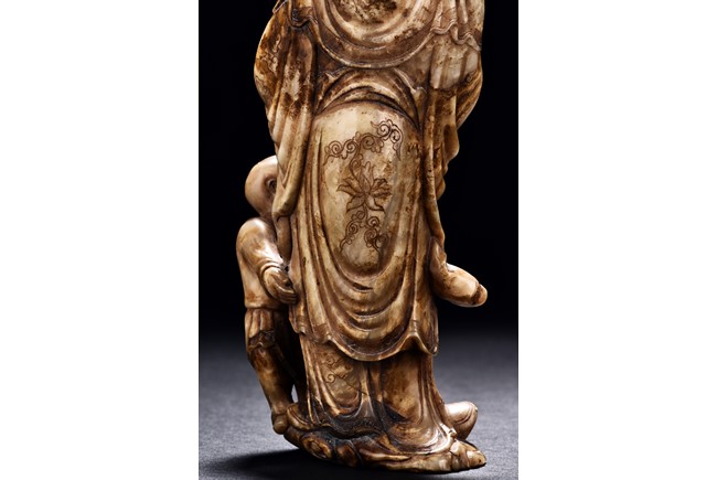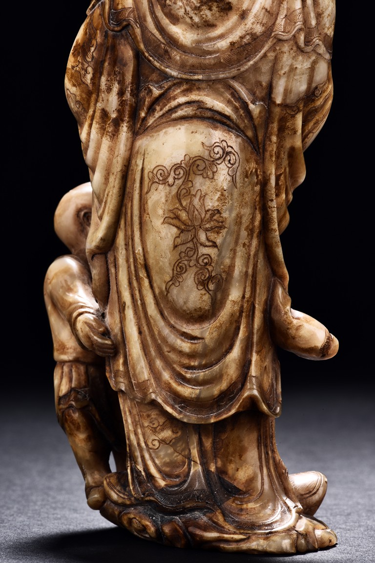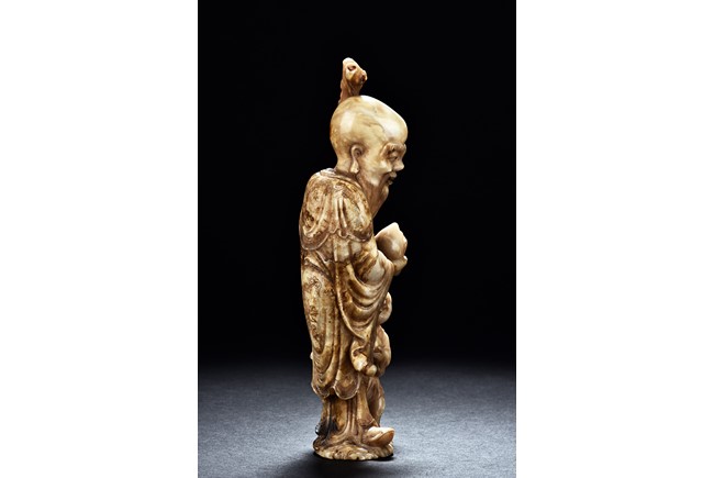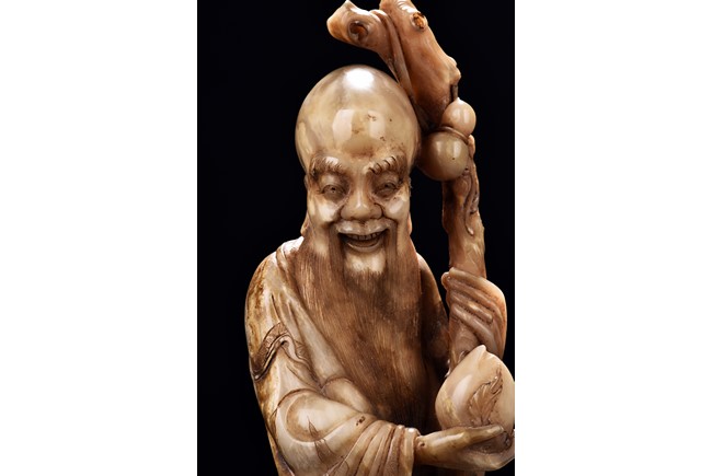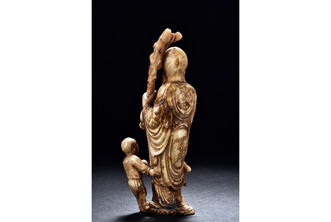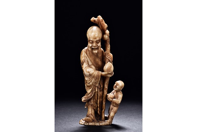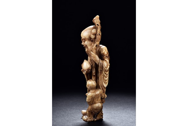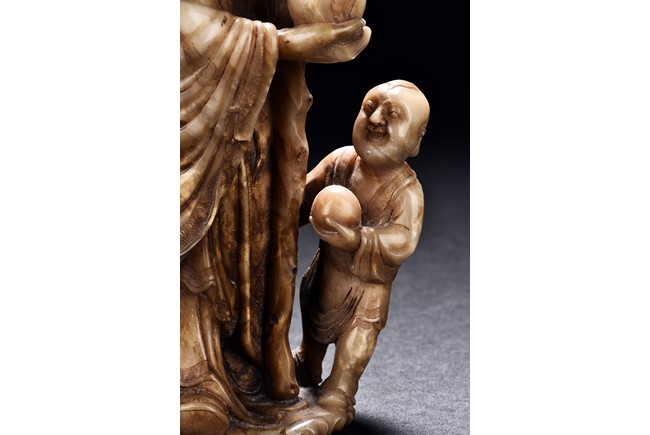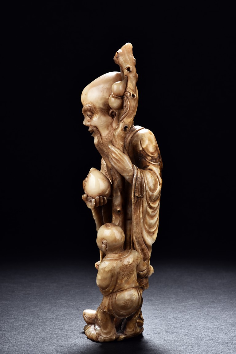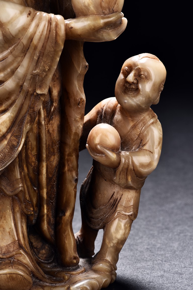 Carved as a standing shou immortal holding a peach on right hand and staff hanging with a double gourd on left hand, the long beard finely incised, with large and bold head, the face with joyful expression, accompanied by a boy attendant.