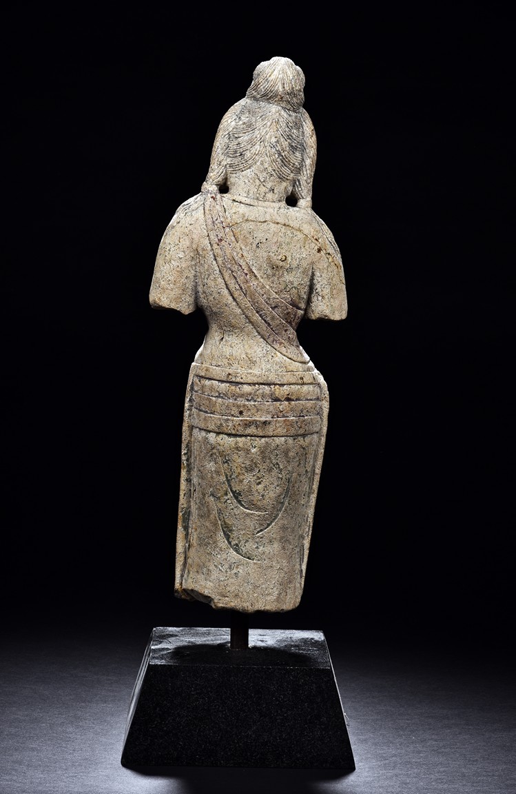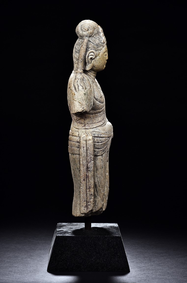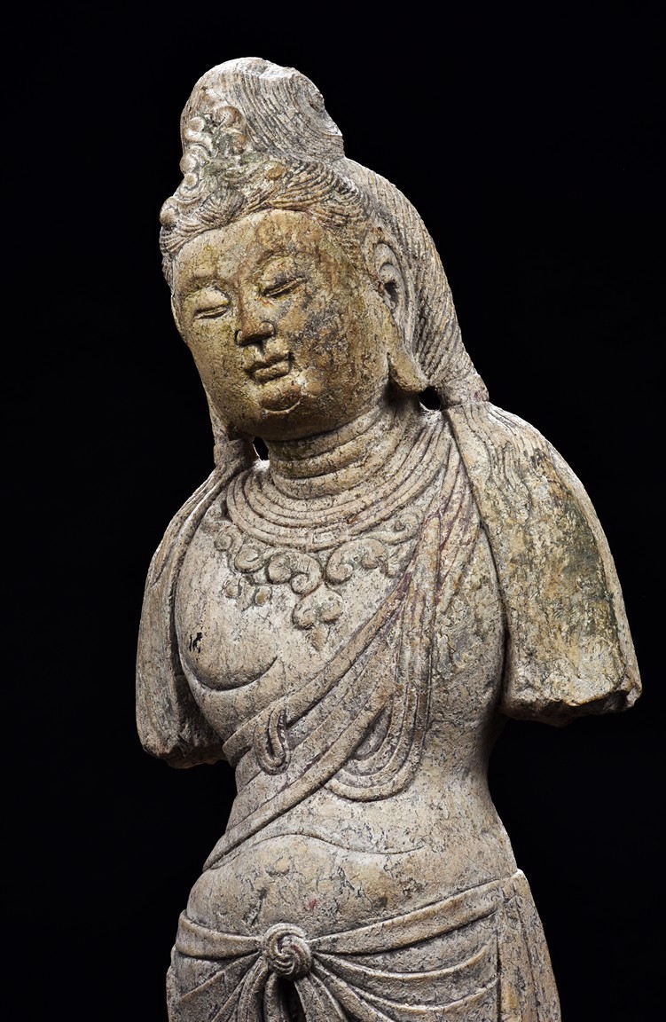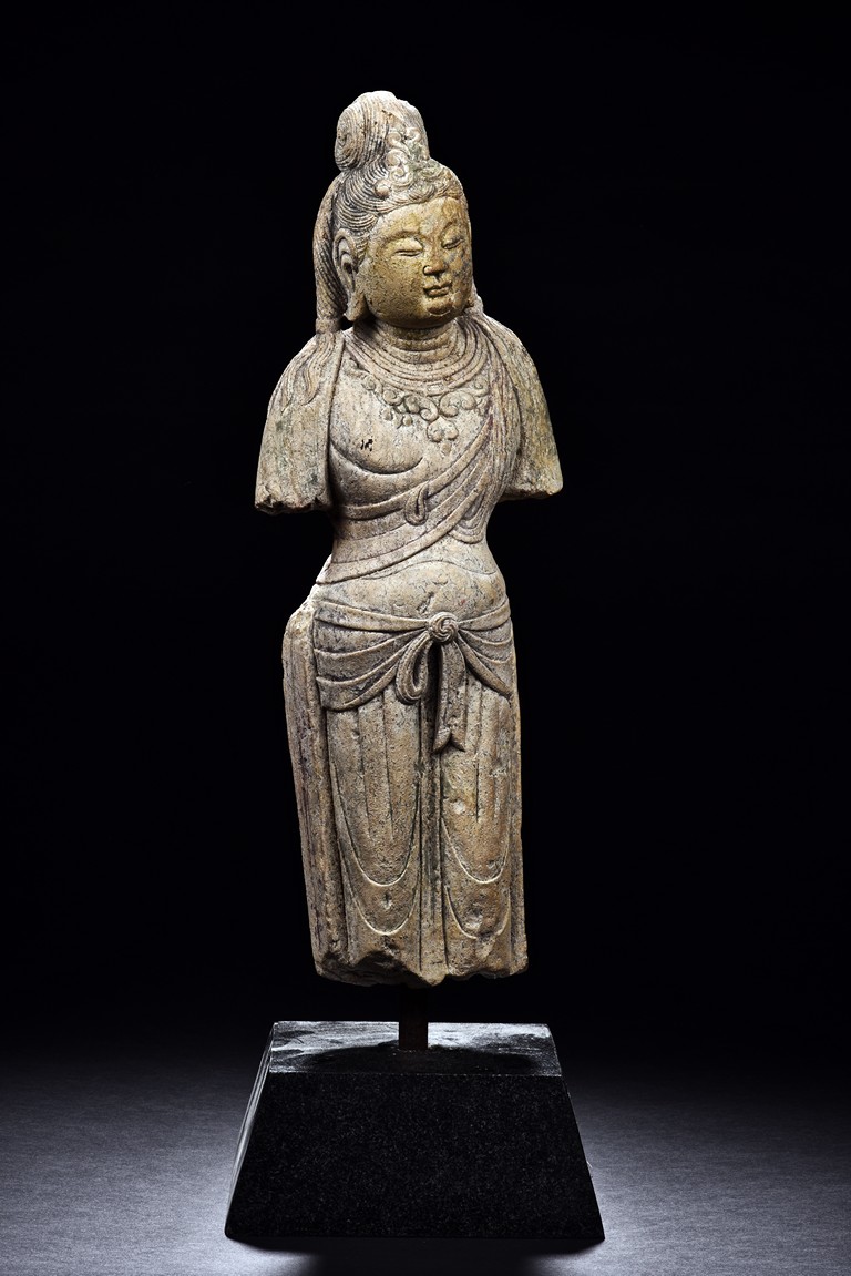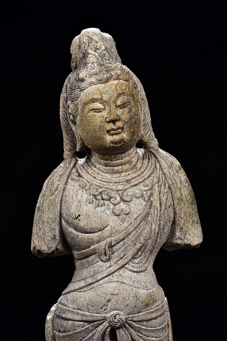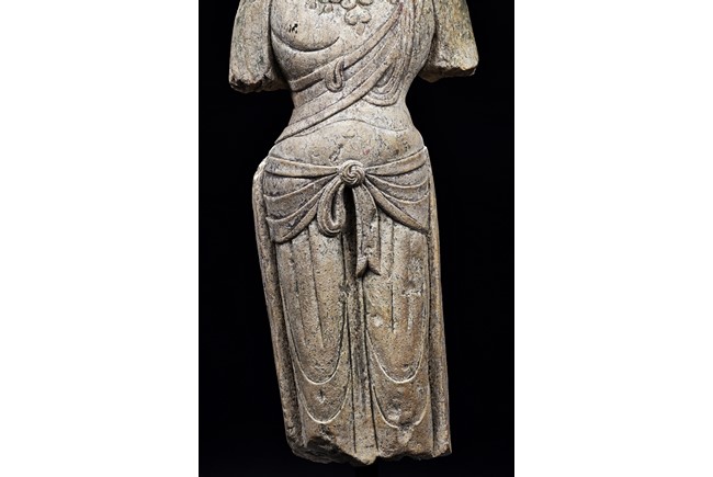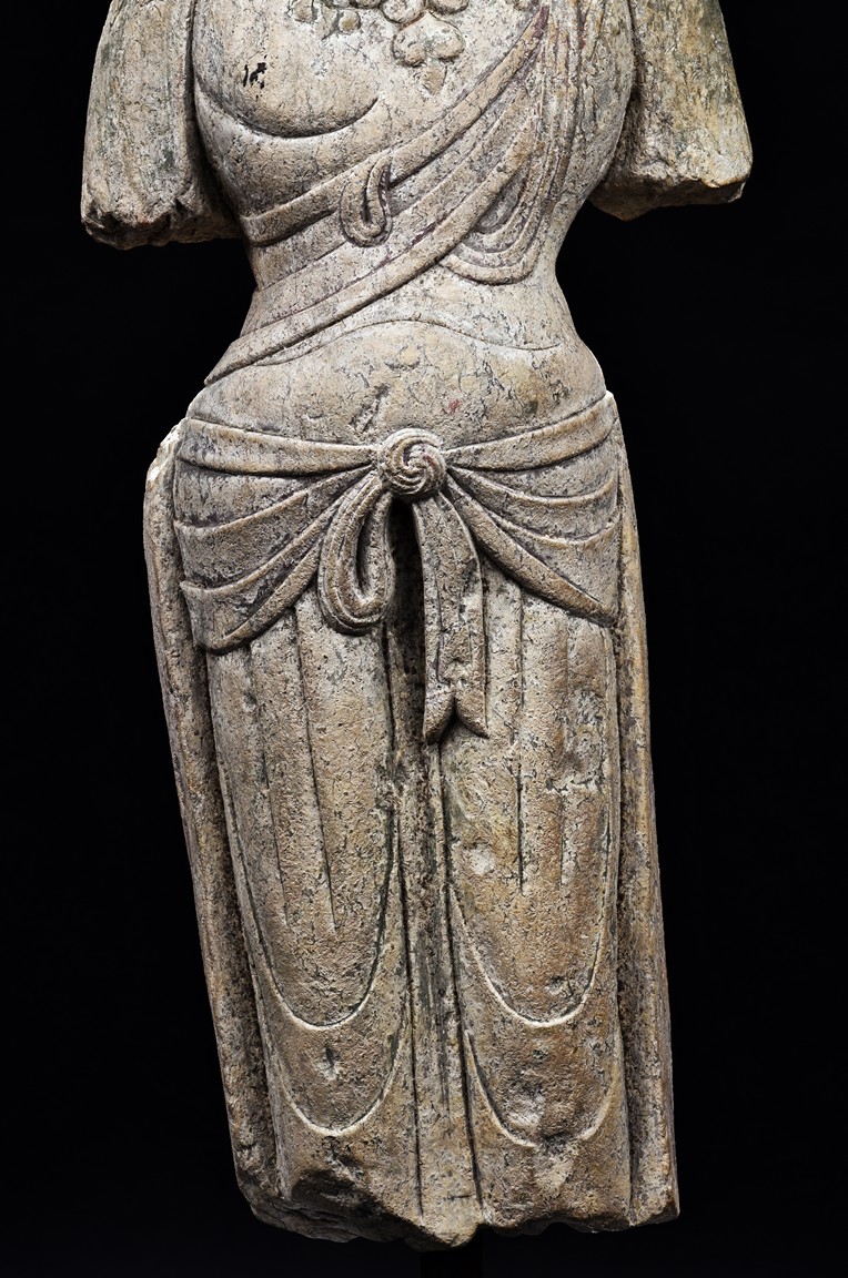 The bodhisattva is shown wearing robe elegantly draped over left shoulder, revealing the adorned chest, the tight fitting dhoti falling towards feet, the face shown with benevolent expression, the head surmounted with topknot, hands and feets missing. Tang Dynasty or later.