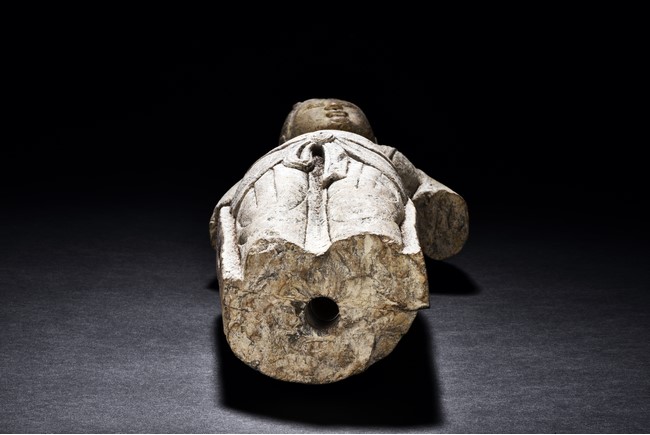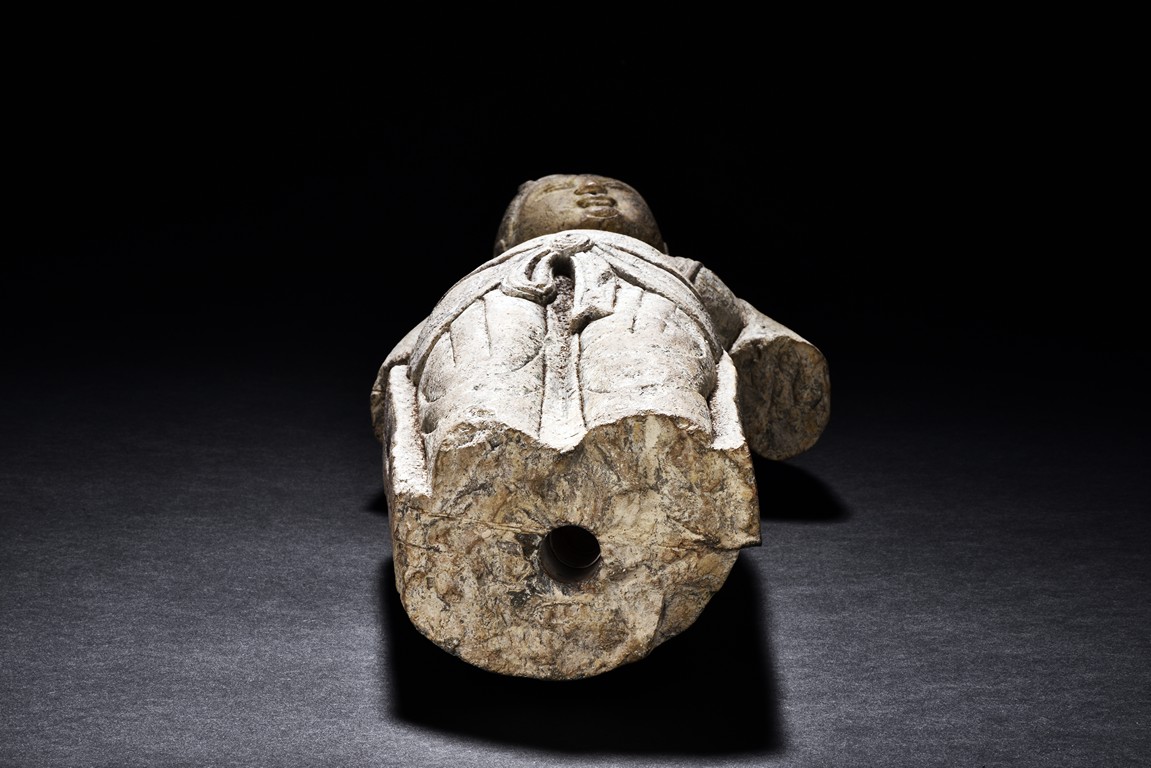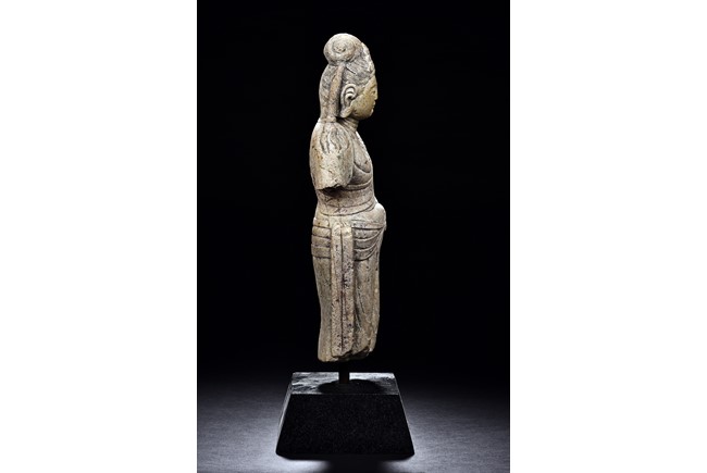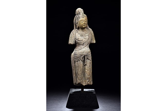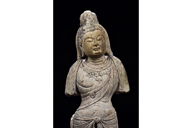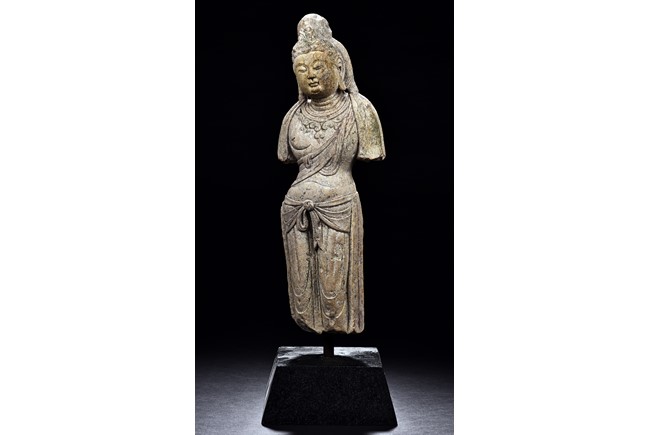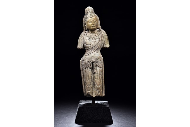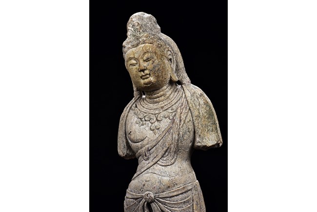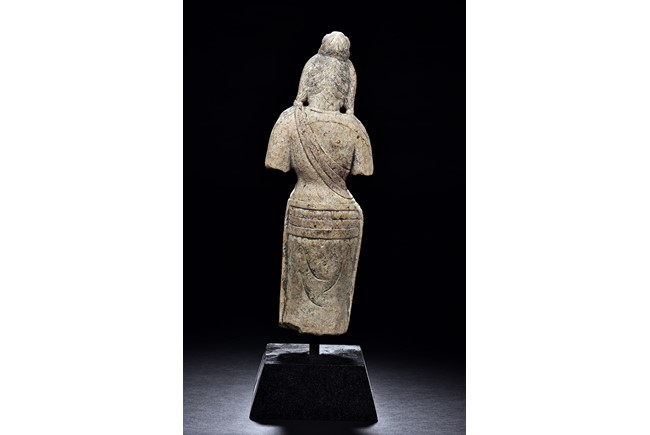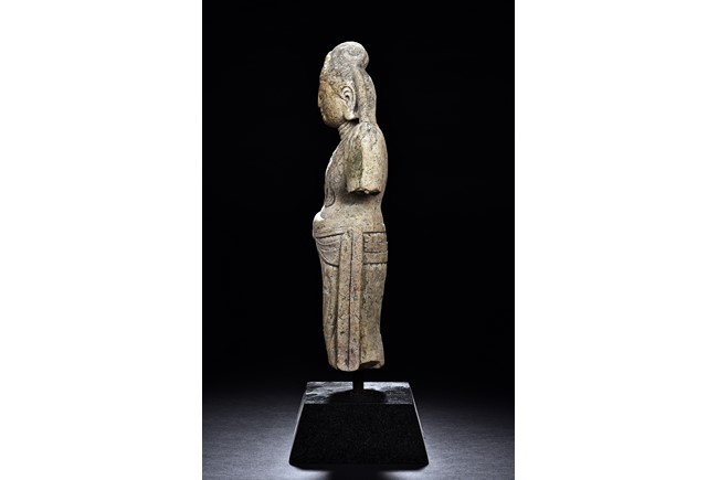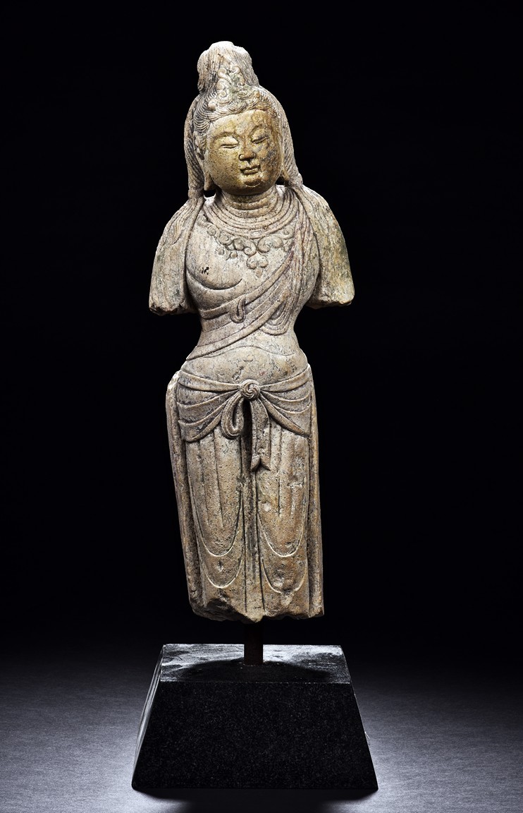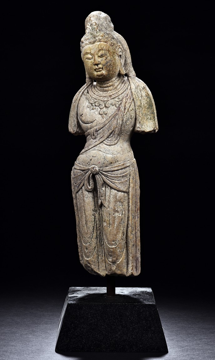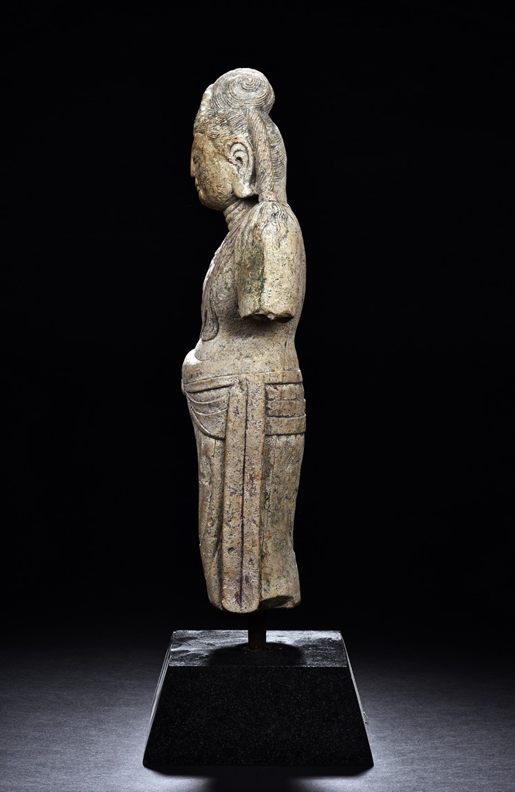The bodhisattva is shown wearing robe elegantly draped over left shoulder, revealing the adorned chest, the tight fitting dhoti falling towards feet, the face shown with benevolent expression, the head surmounted with topknot, hands and feets missing. Tang Dynasty or later.