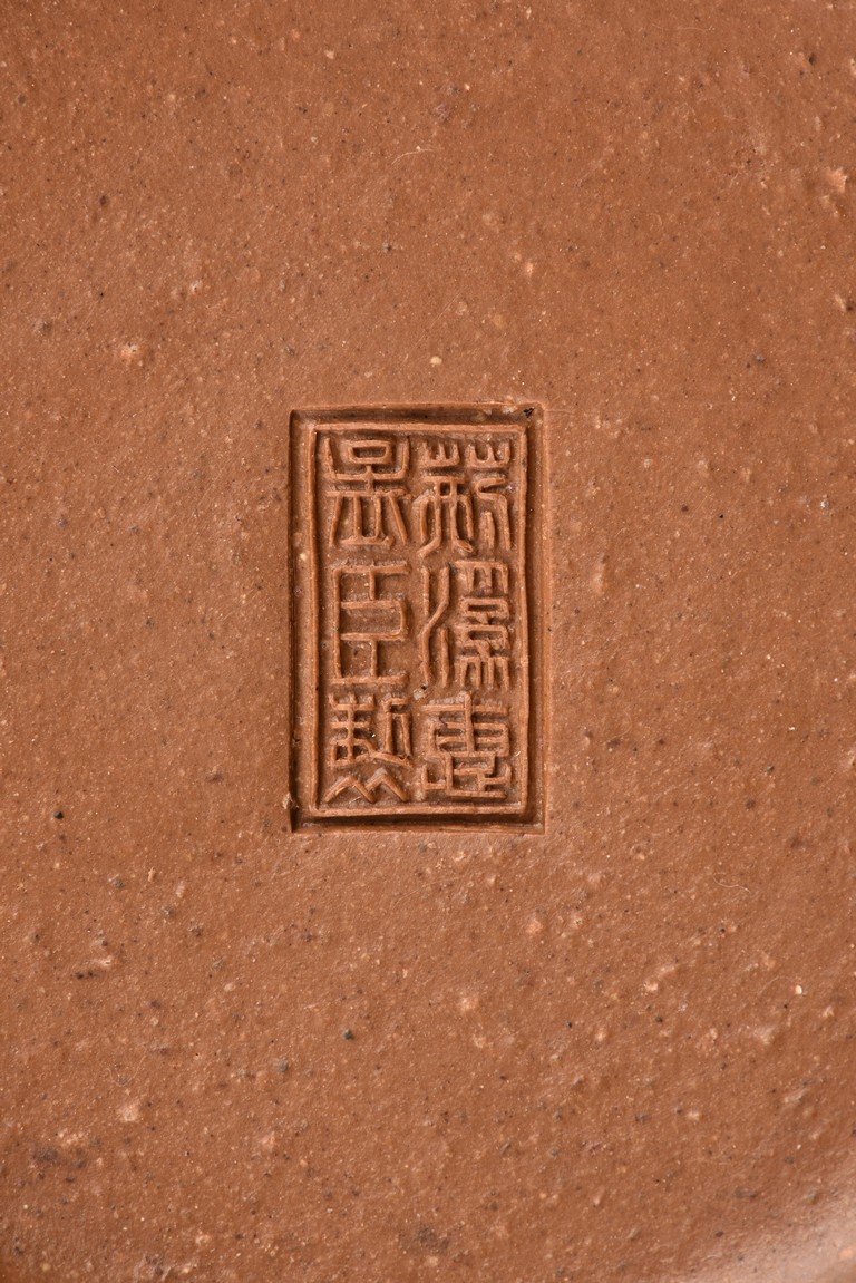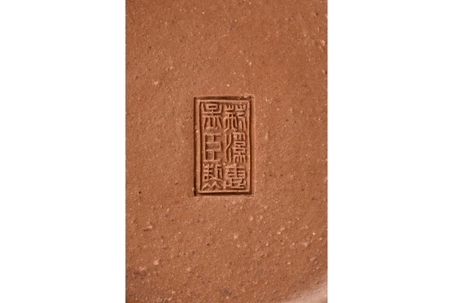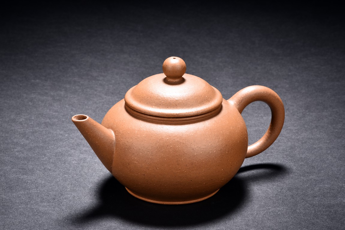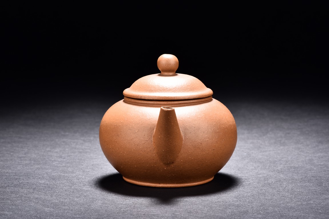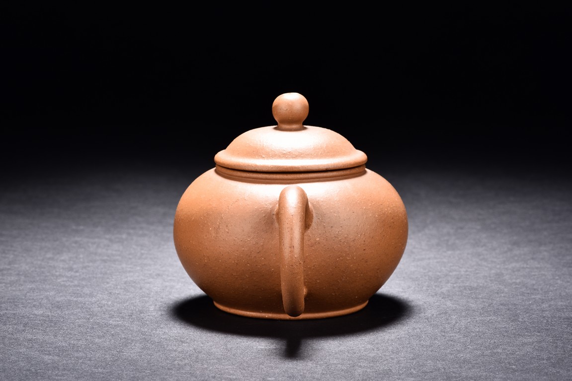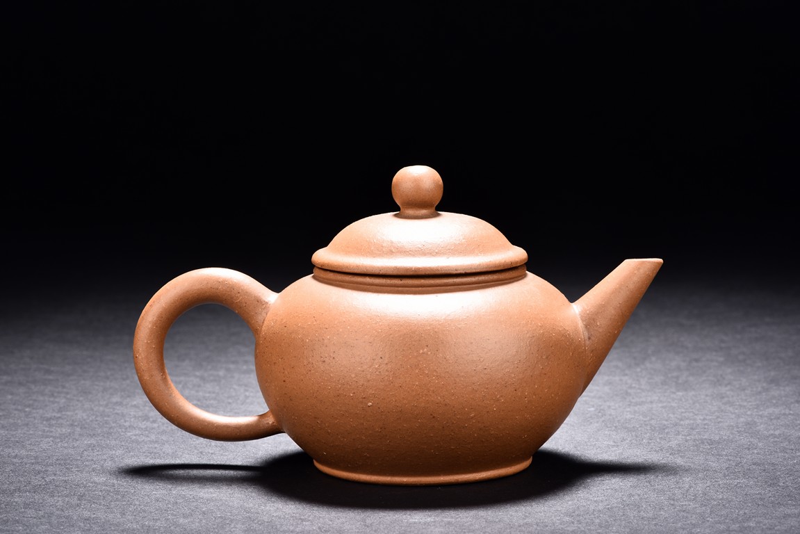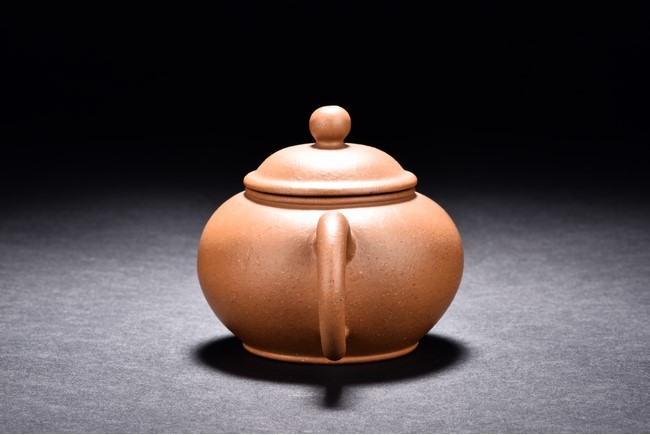 Rising from a ring foot, the teapot is of straight spout, ear-shaped handle, and domed cover surmounted with bead finial. The bottom bears a six character mark 'Jin Xi Meng Hui Chen Zhi'.
