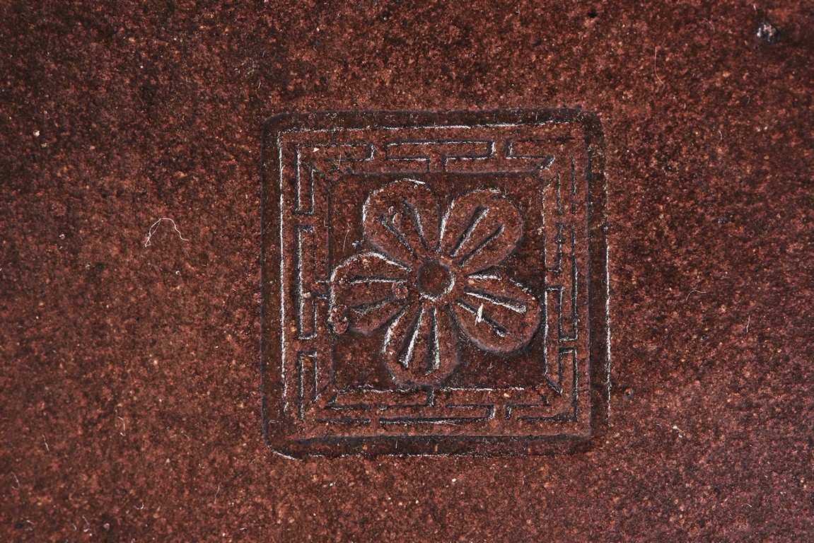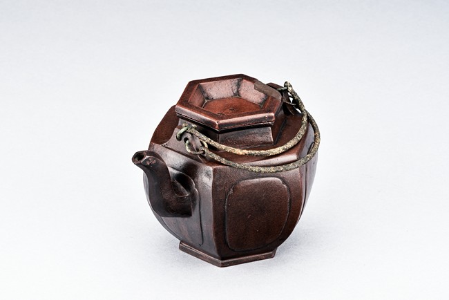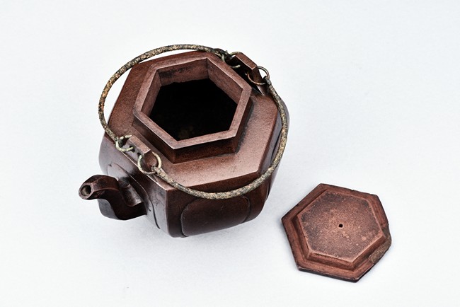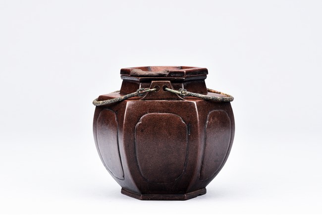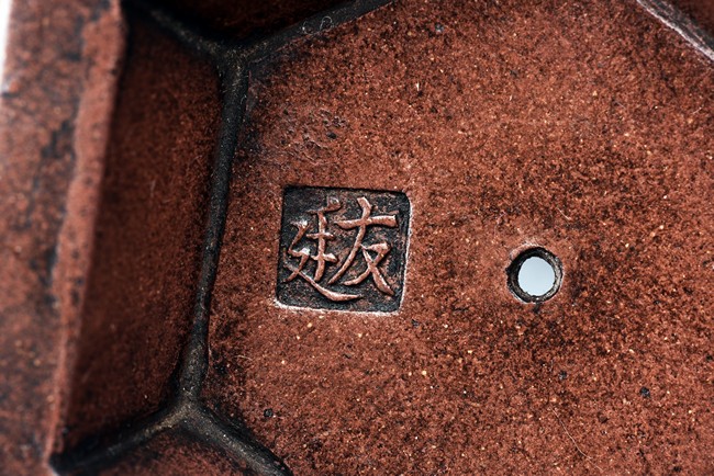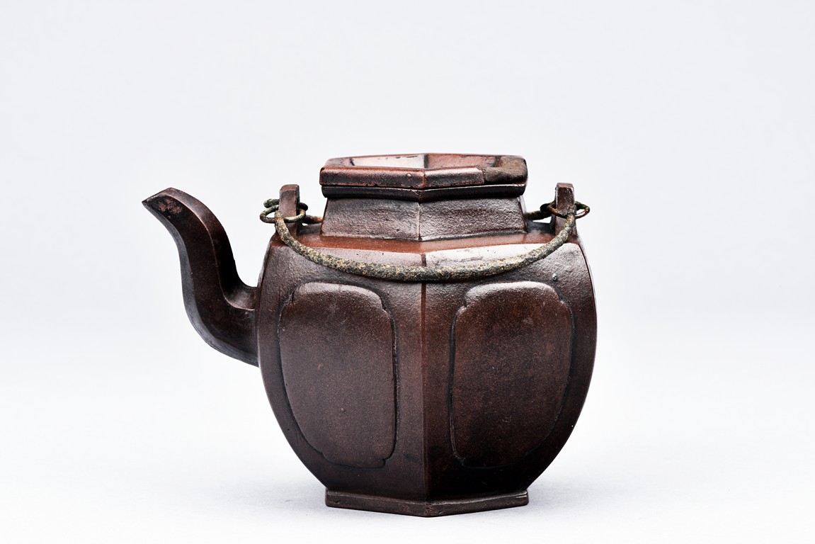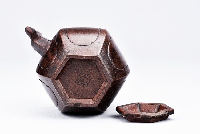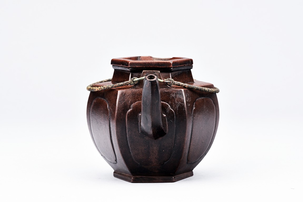 Of hexogonal baluster form, each section of bulging lobed form, the spout in S-shape, the waisted neck with arched bronze handles. The bottom with a flower mark and the cover with a two-character 'You Ting' mark.