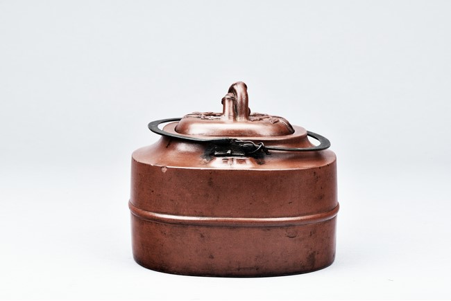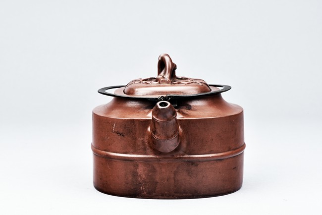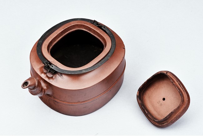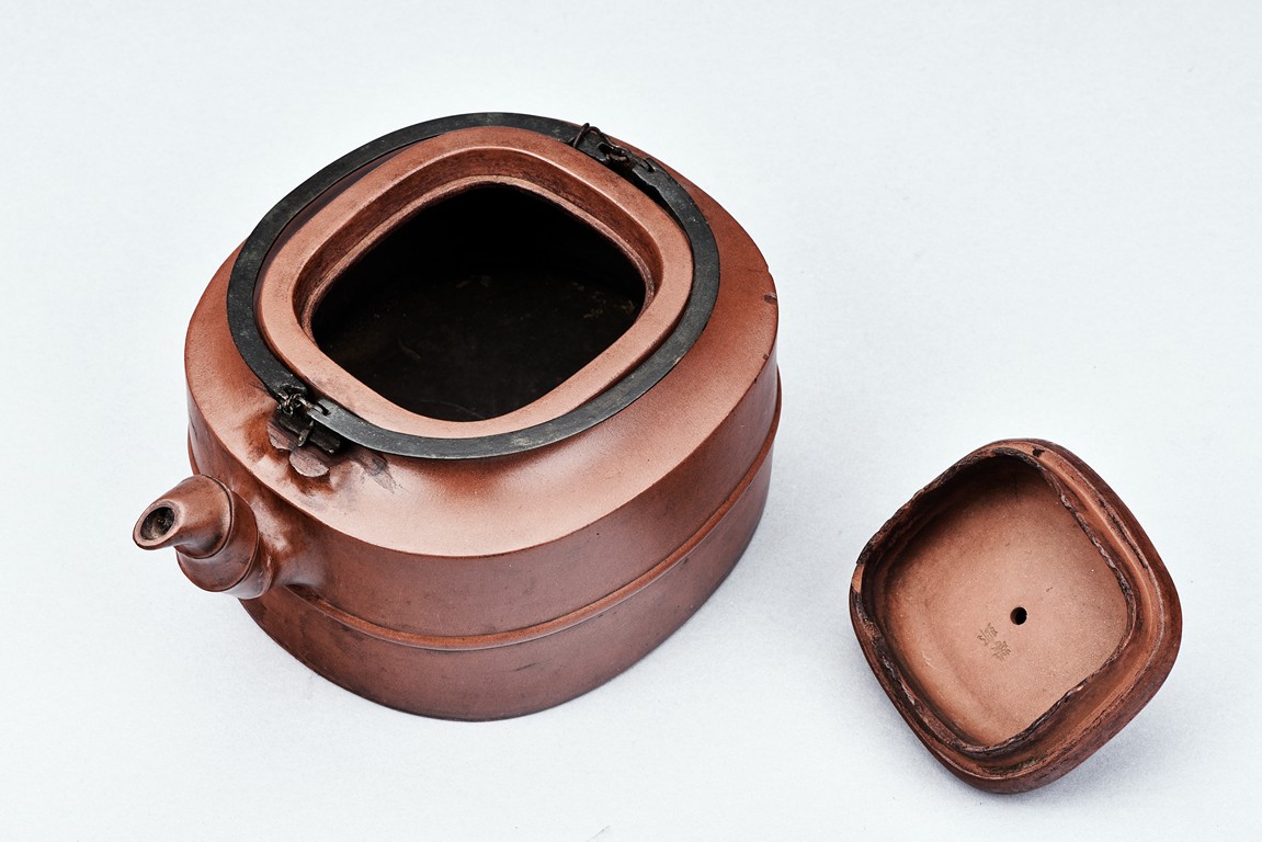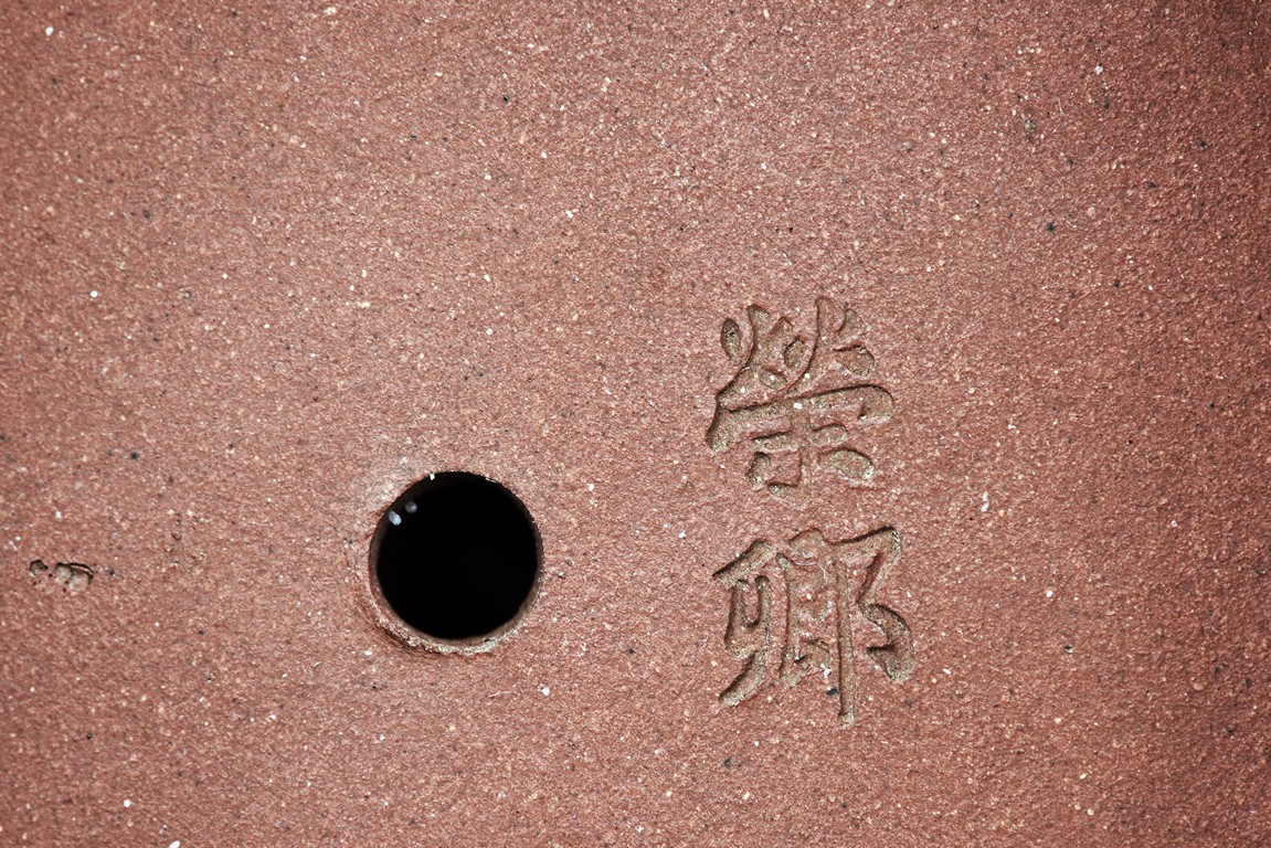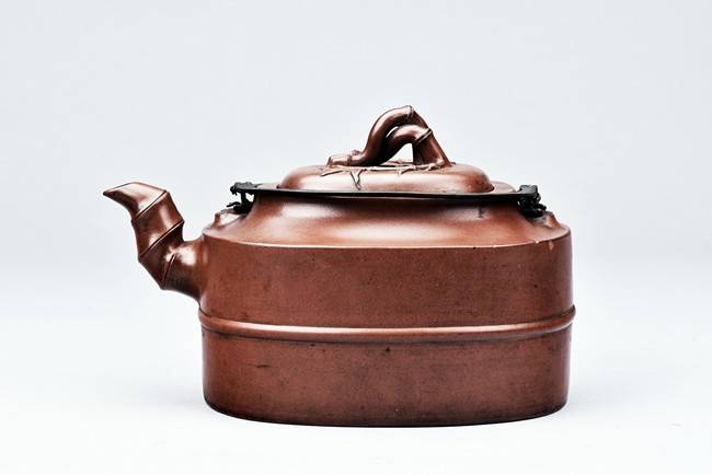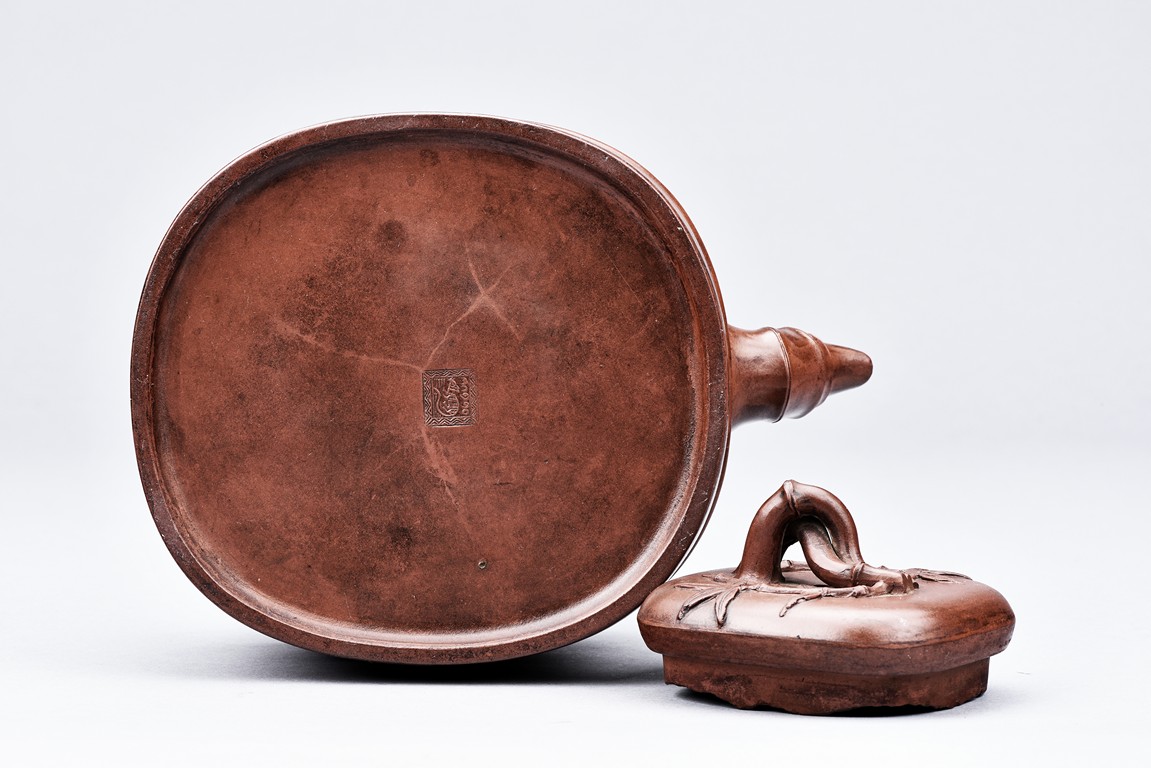 Of bamboo section, the spout also in curved bamboo section, the cover surmounted with bamboo stem finial, the shoulder with arched handle. The bottom bears a mouse mark, the inside of cover with 'Rong Qing' mark.