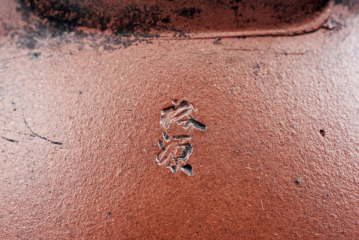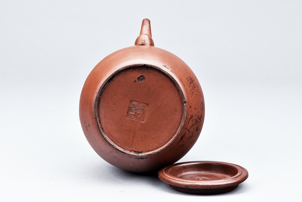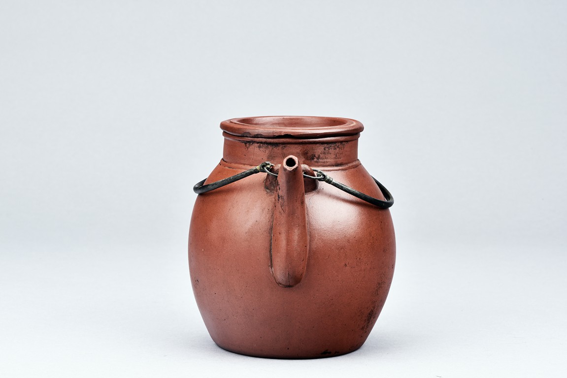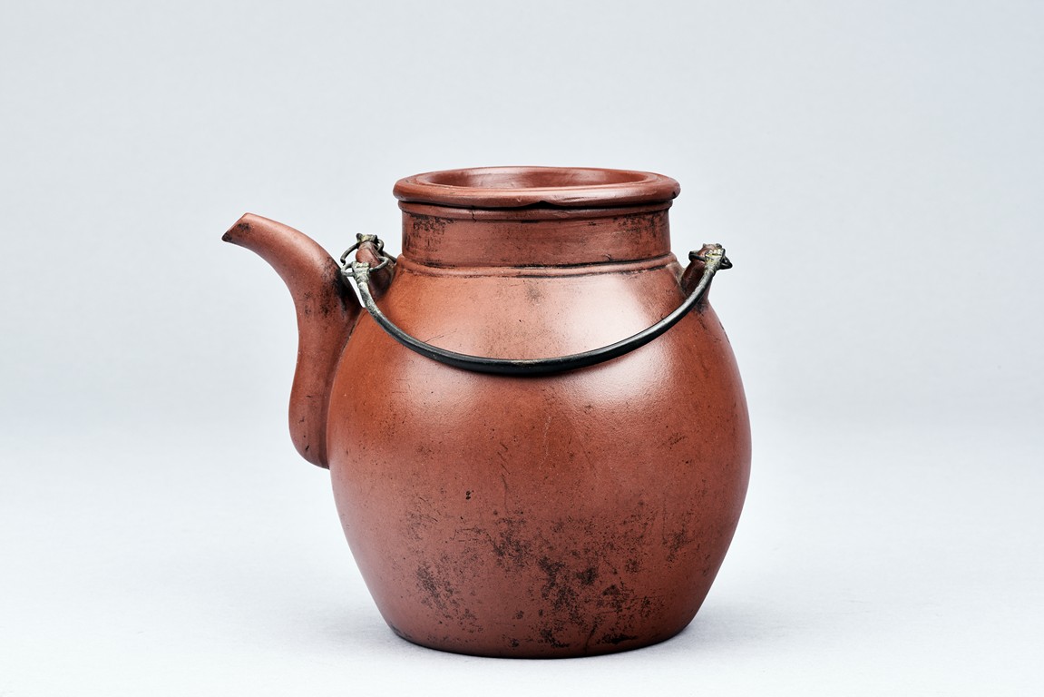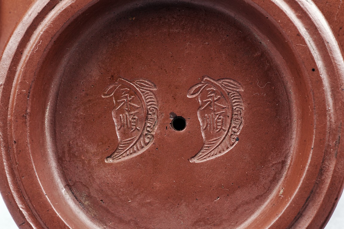 Of well-potted baluster form, the spout curved, rising to a straight mouth rim, with two arched bronze handles, the cover impressed with two 'Yong Shun' mark, with a two character 'Yu Yuan' mark under the handle, and a six character 'Yi Xing Shi Da Bin Zhi' mark on the bottom.