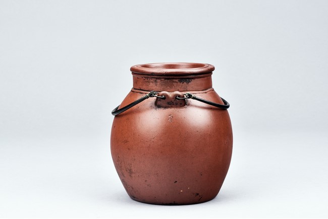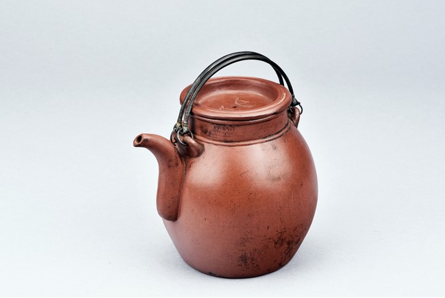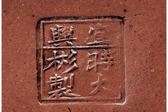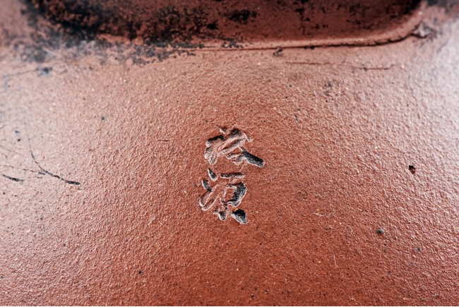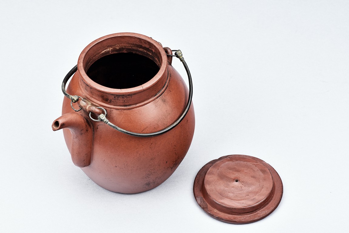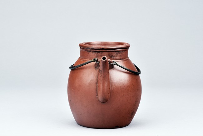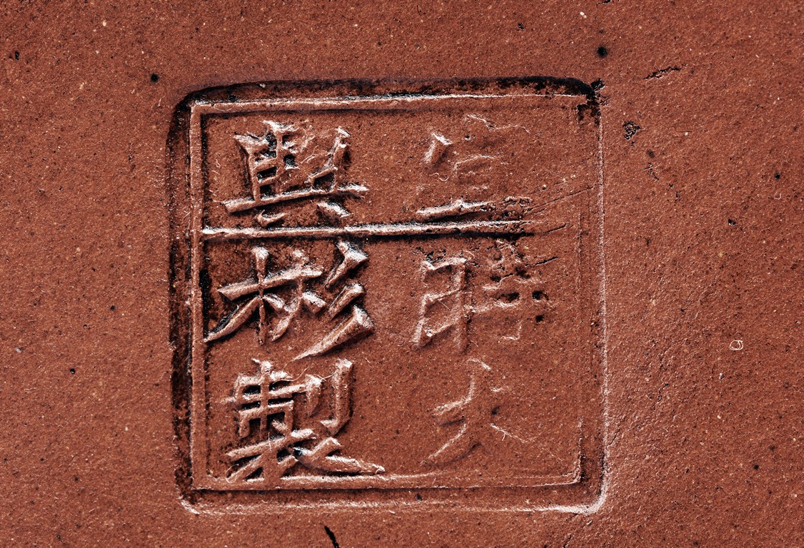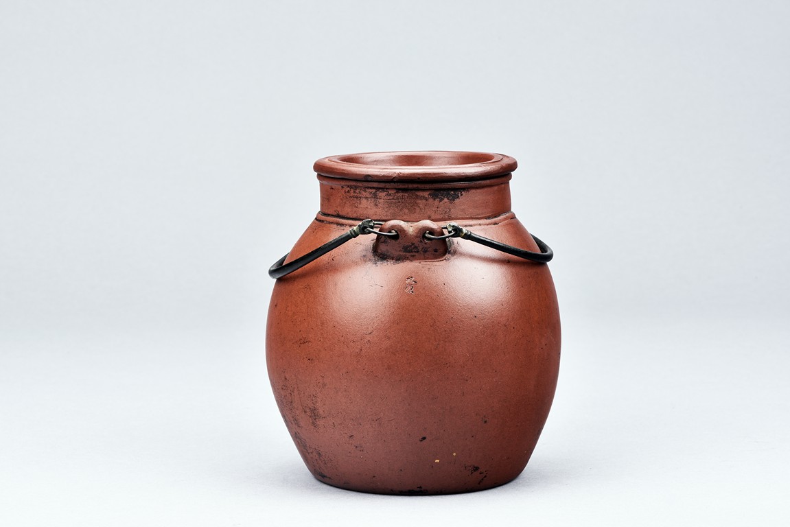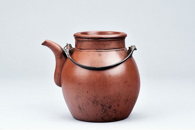 Of well-potted baluster form, the spout curved, rising to a straight mouth rim, with two arched bronze handles, the cover impressed with two 'Yong Shun' mark, with a two character 'Yu Yuan' mark under the handle, and a six character 'Yi Xing Shi Da Bin Zhi' mark on the bottom.