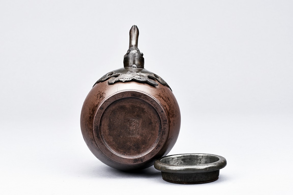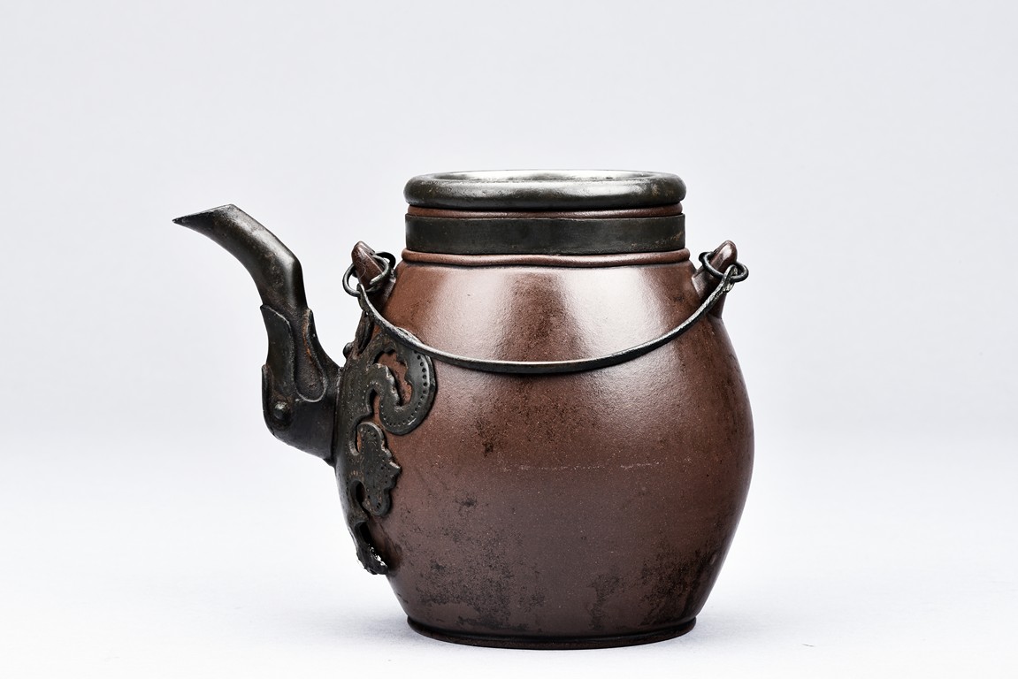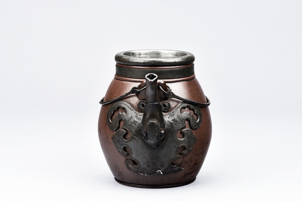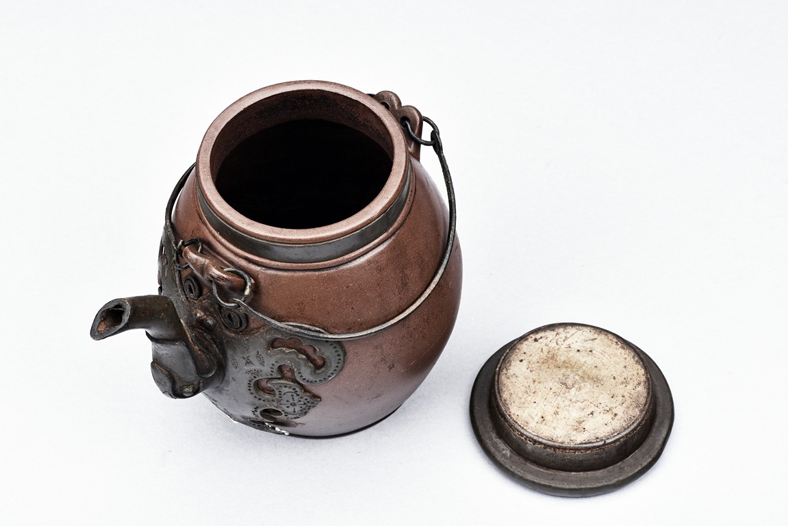 Of well-potted baluster form,the spout curved, rising to a straight mouth rim, the spout, mouth rim, cover are all tin-mounted, with two mark 'Rong Ji' under the handle, and one mark 'Yi Xing Zi Sha' on the bottom.