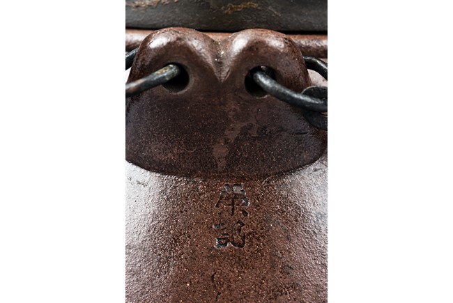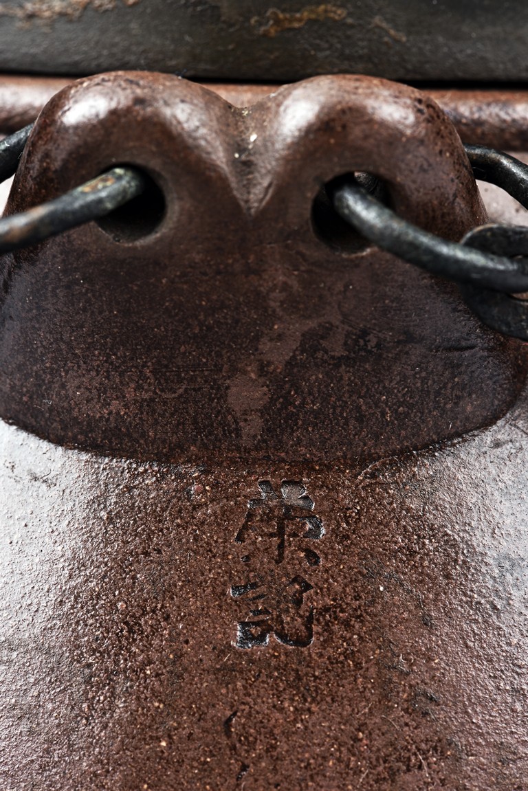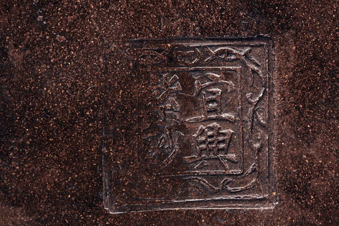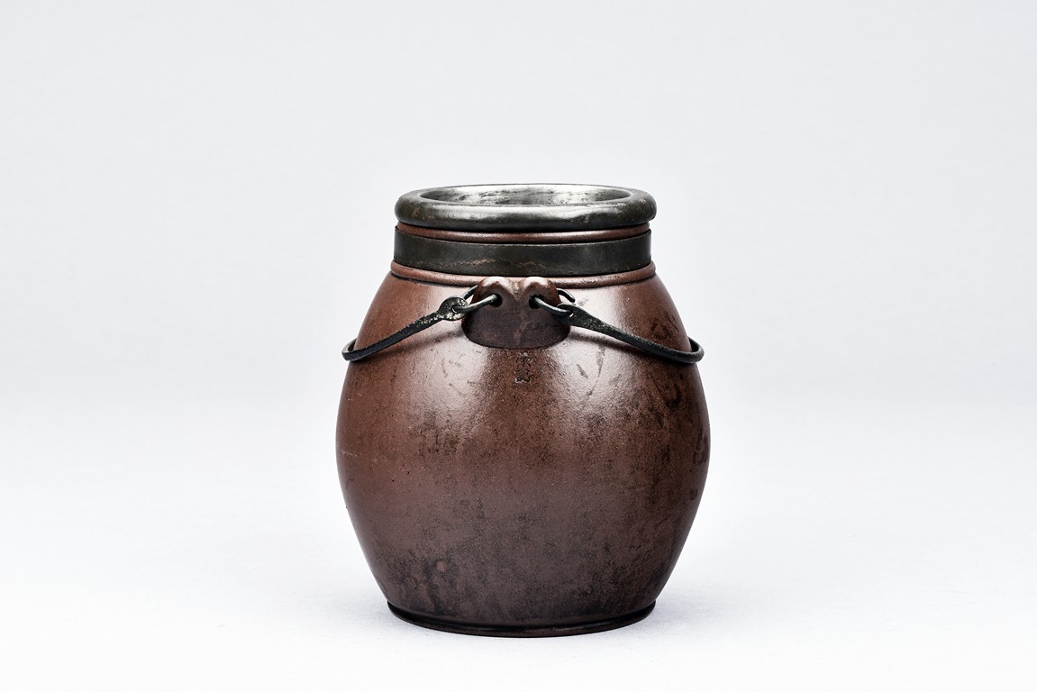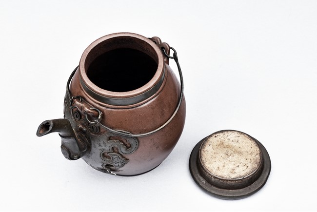 Of well-potted baluster form,the spout curved, rising to a straight mouth rim, the spout, mouth rim, cover are all tin-mounted, with two mark 'Rong Ji' under the handle, and one mark 'Yi Xing Zi Sha' on the bottom.