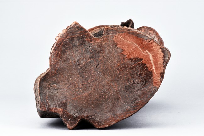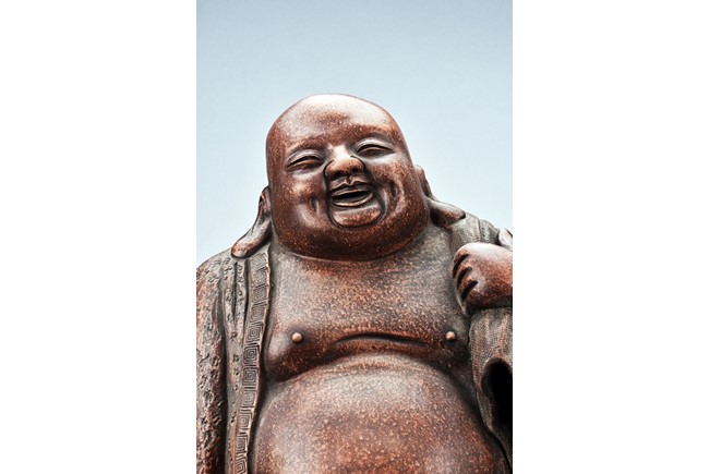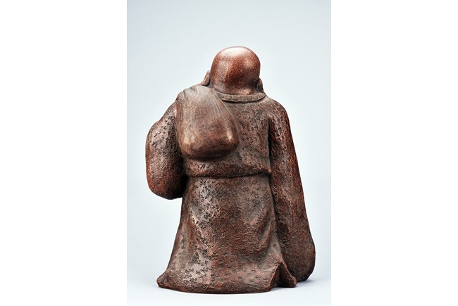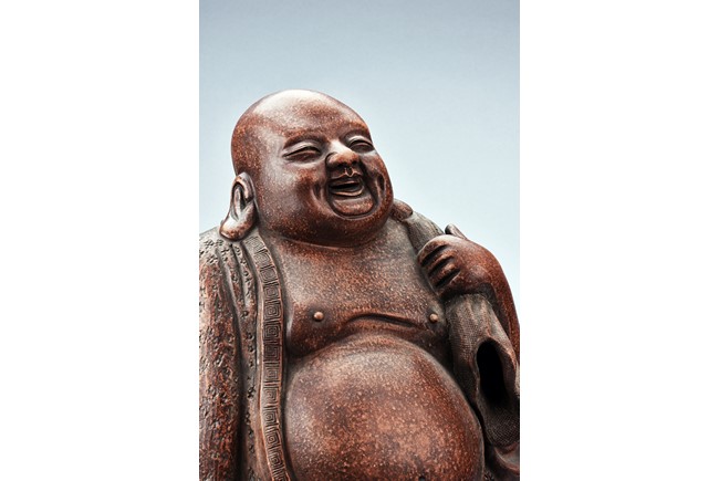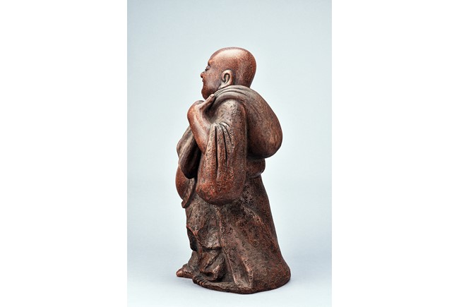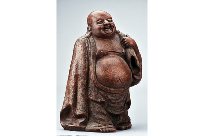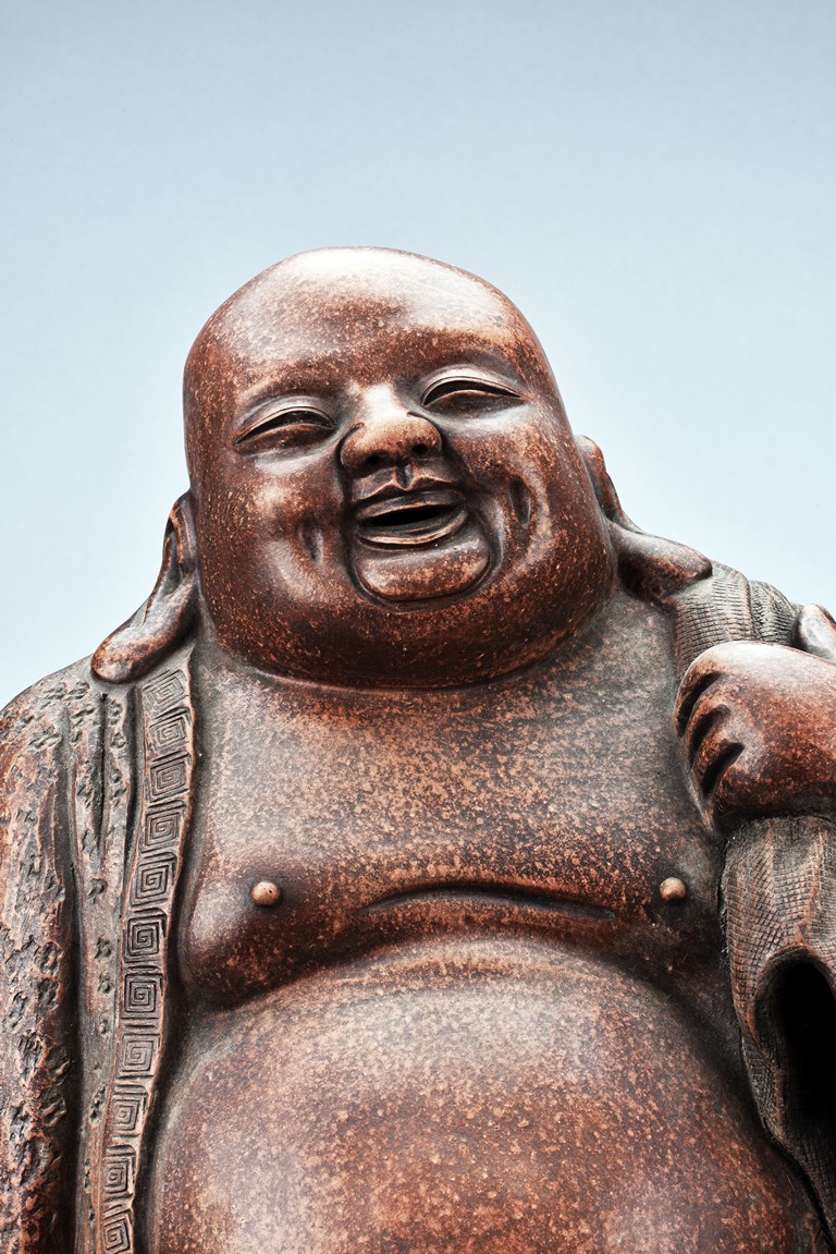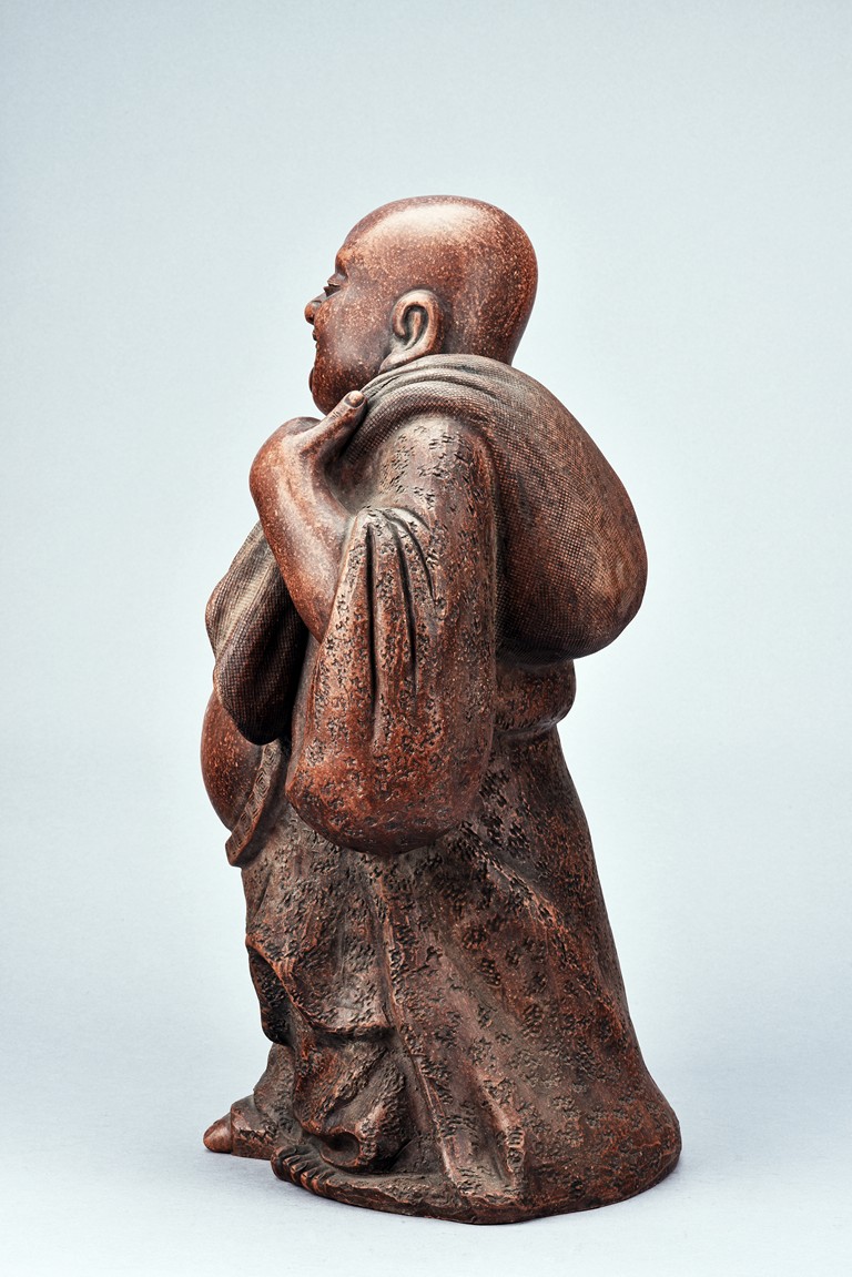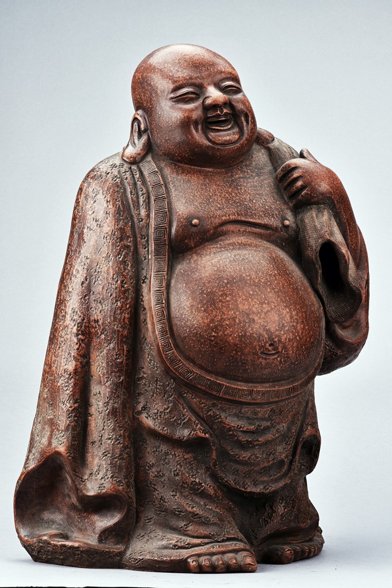 The figure is shown standing wearing long and voluminous robe, revealing chest and large belly, the hem incised with key-fret pattern, left hand holding a bag over shoulder, the face with laughing expression, flanked by long earlobes, Qing Dynasty period.