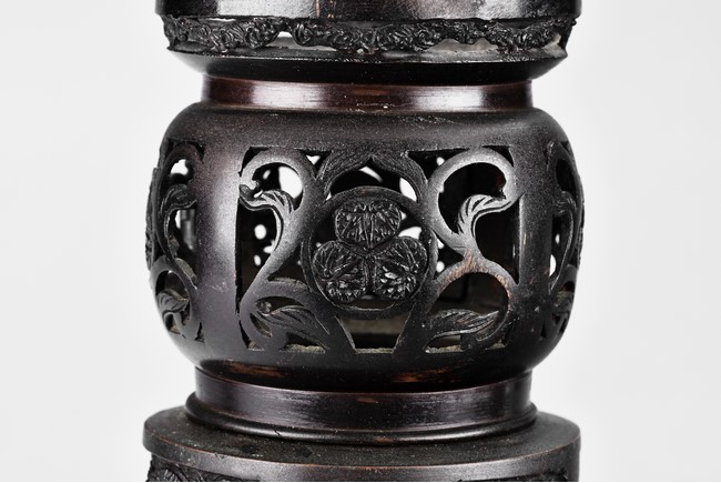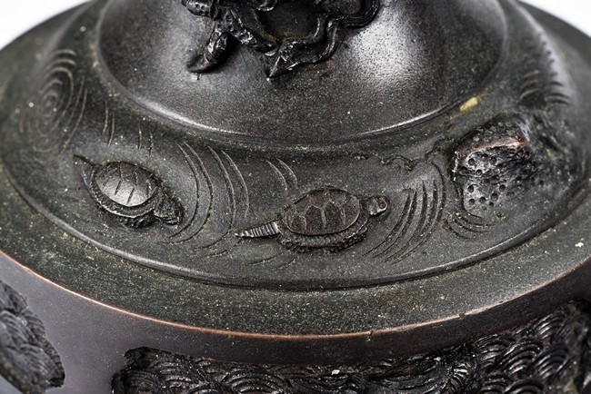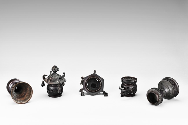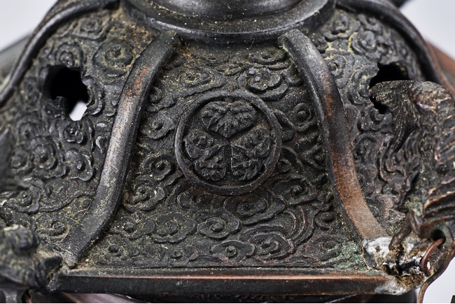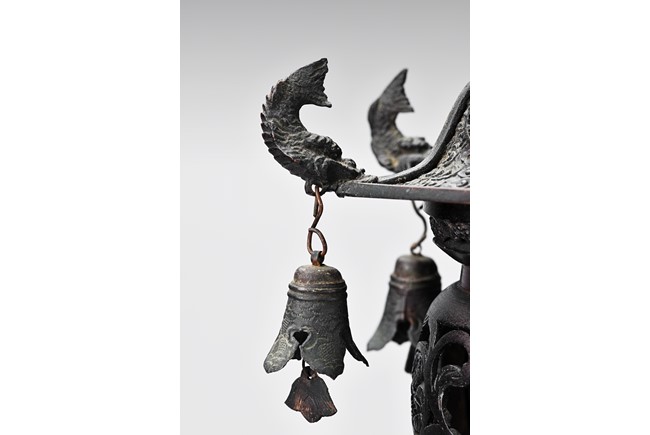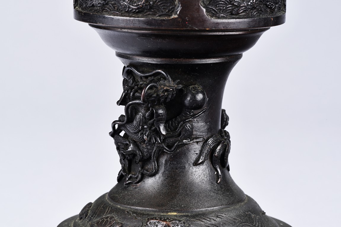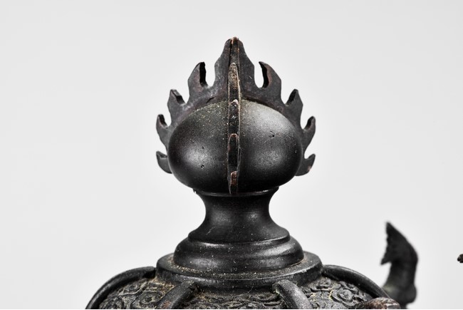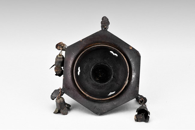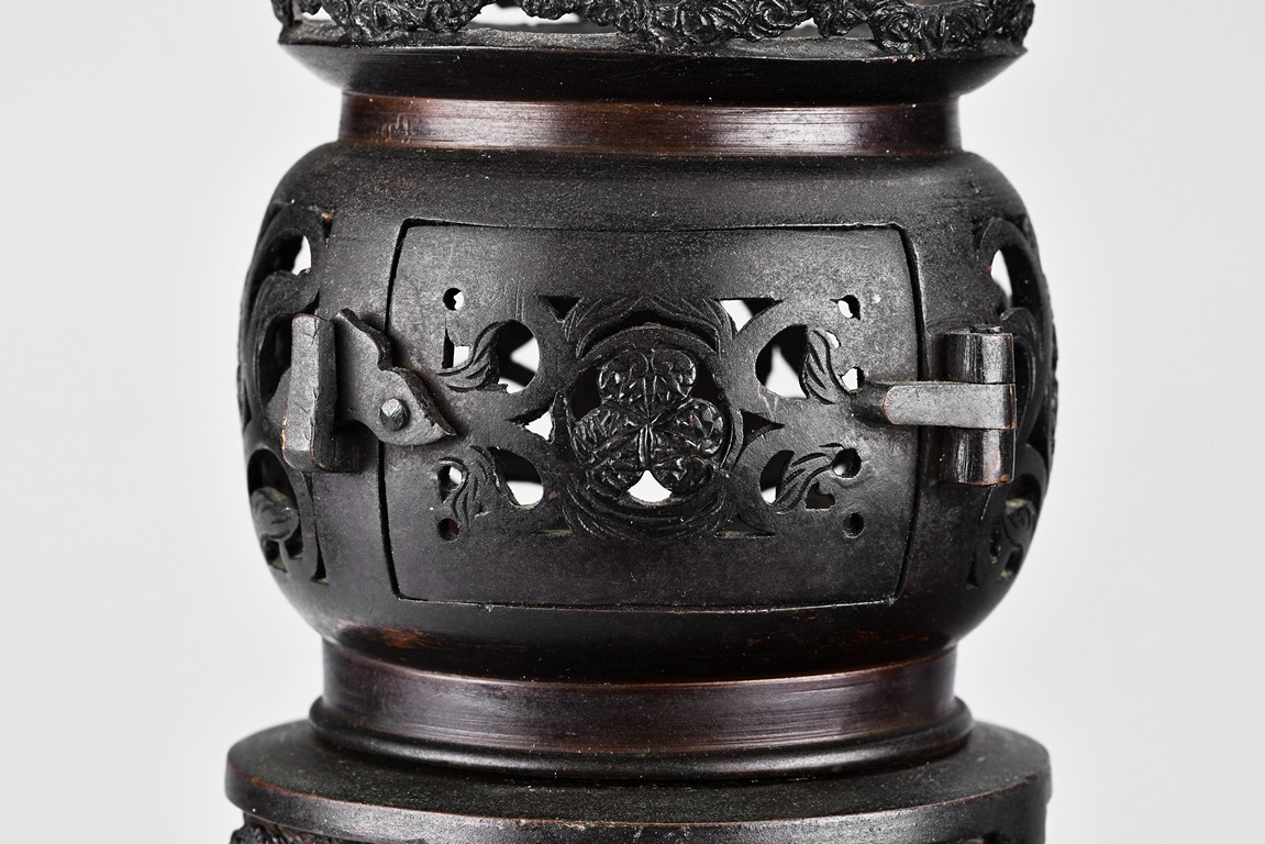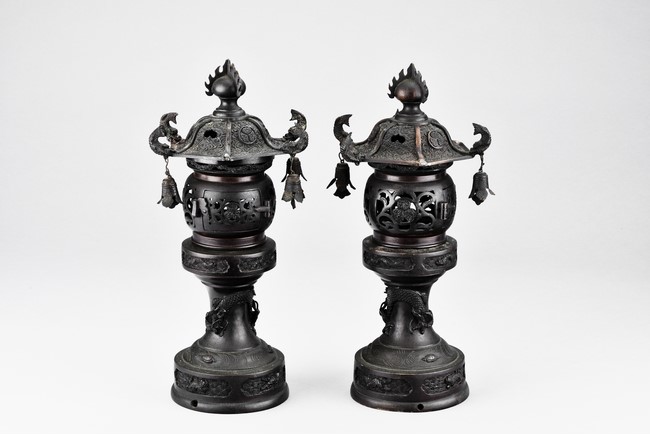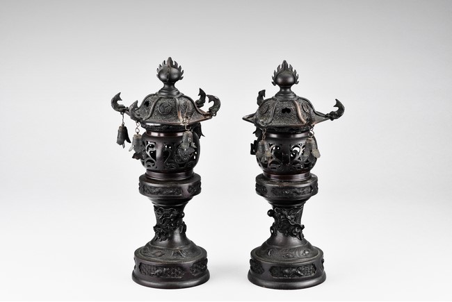 Each censer is finely cast with twisting dragon around body, the upper body with openwork design, the cover of pavillion hexogonal form with hanging bells, the top surmounted with flaming ball finial.