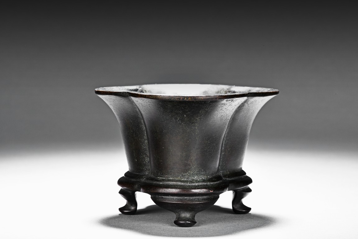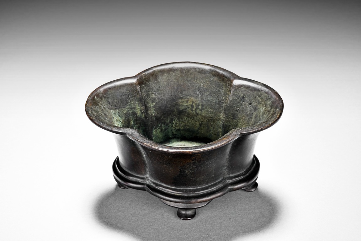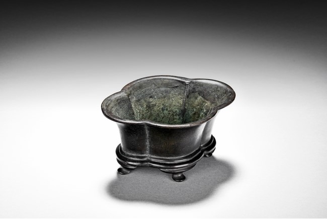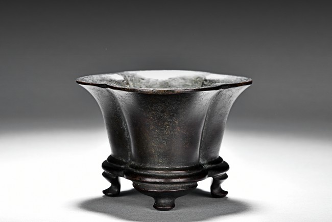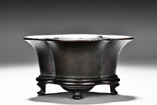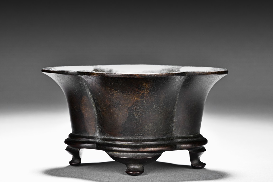 Of narcissus shape with four leaves, the censer is supported with four feet, the bottom bears four character 'Jia Bao Zhen Cang'. Qing Dynasty period.