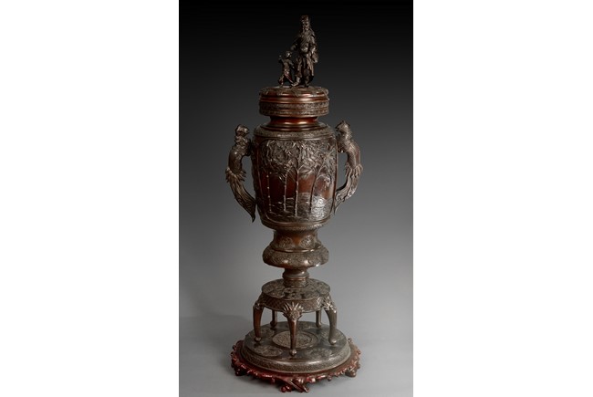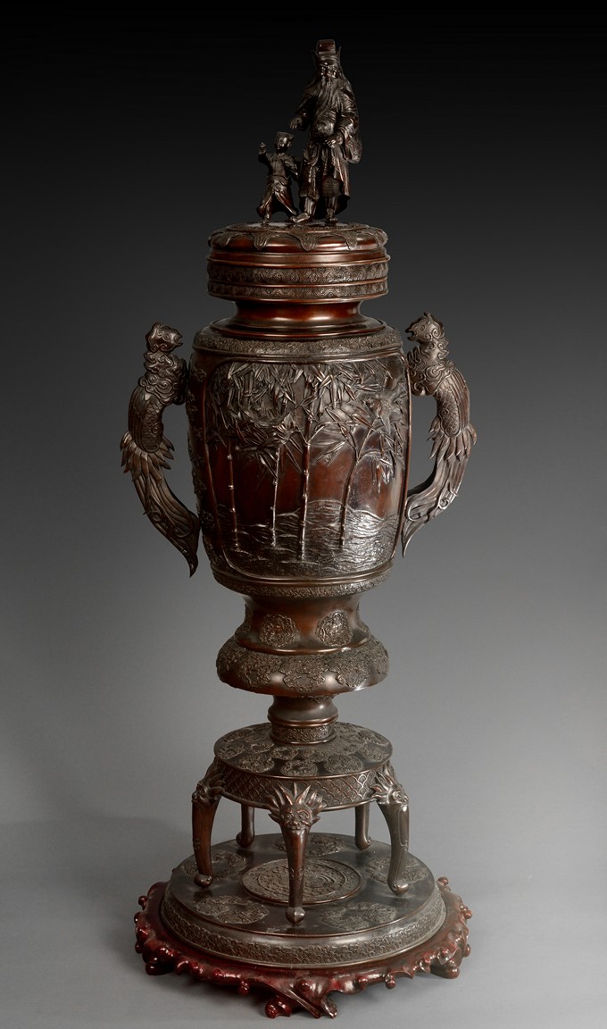 A massive Japanese cast bronze censer consisting of four separate sections, with two tiers of base, each casted with an intricate detailed dragon design. The front and the back of the censer depicts a bird in a bamboo grove scene, and another scene of bird in a chrysanthemum bloom, with two phoenix handles, and the cover is cast with an elder with a child. The base is casted with the mark of the makers. The censer also comes with an original wood base. Showa period, Empire of Japan.