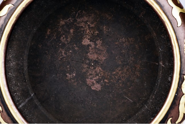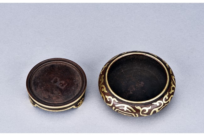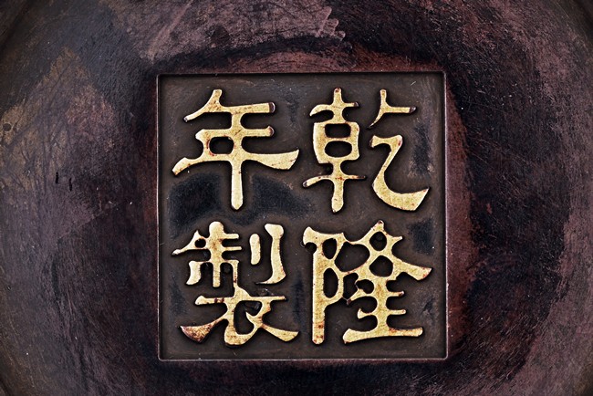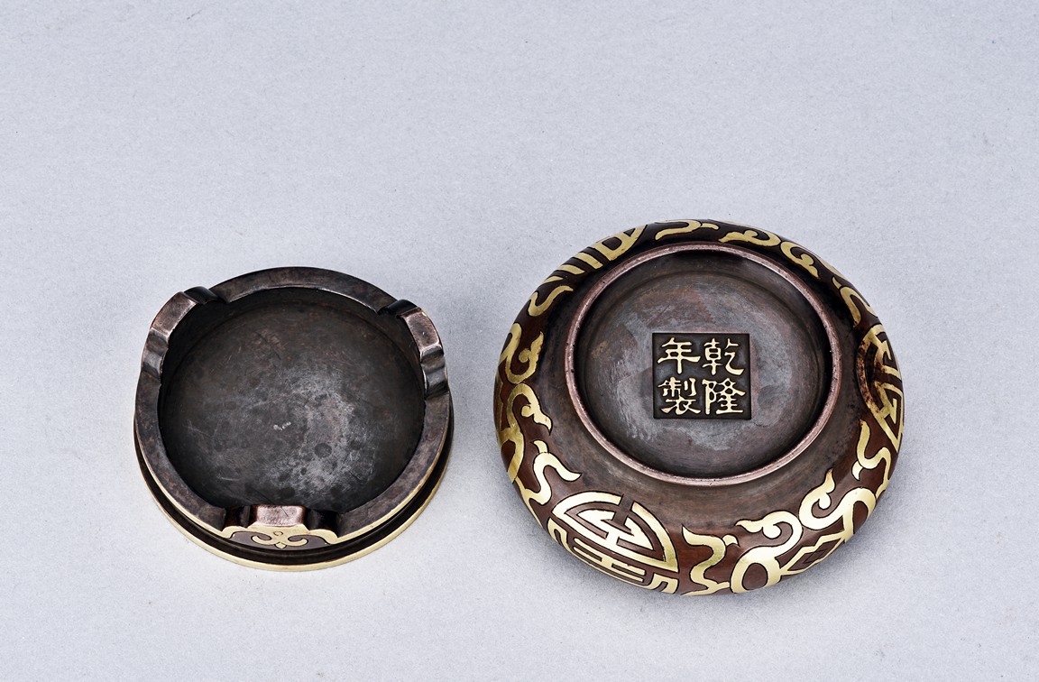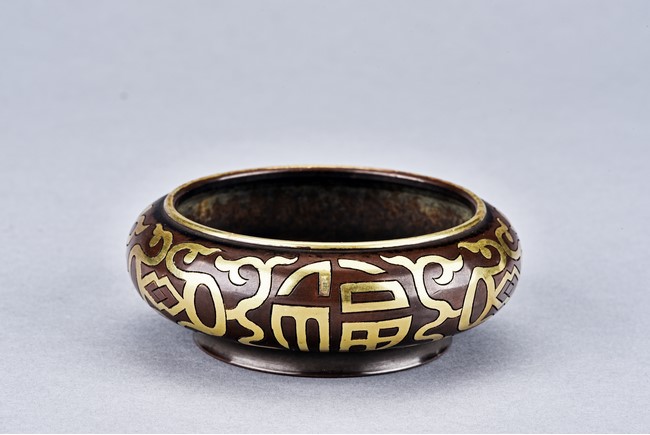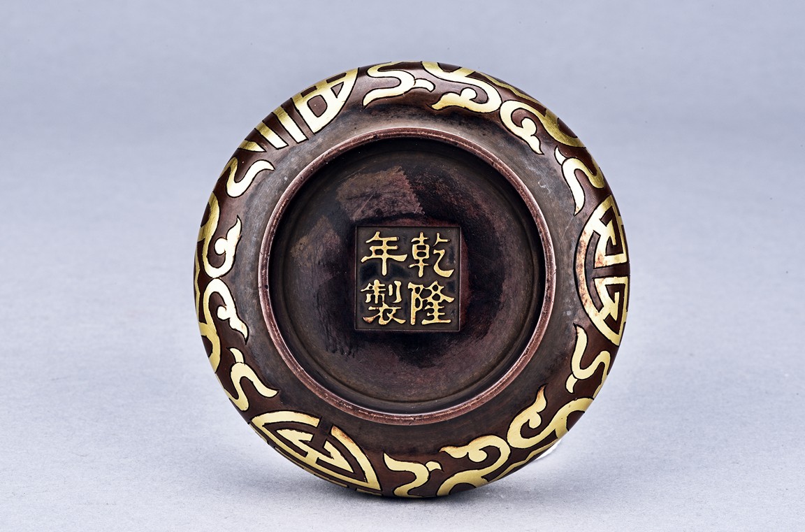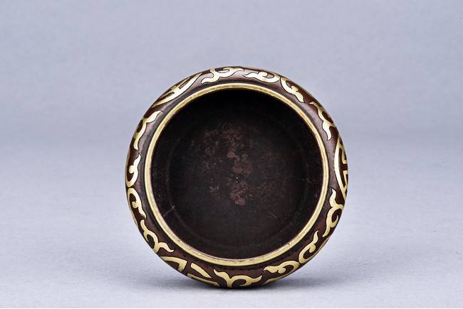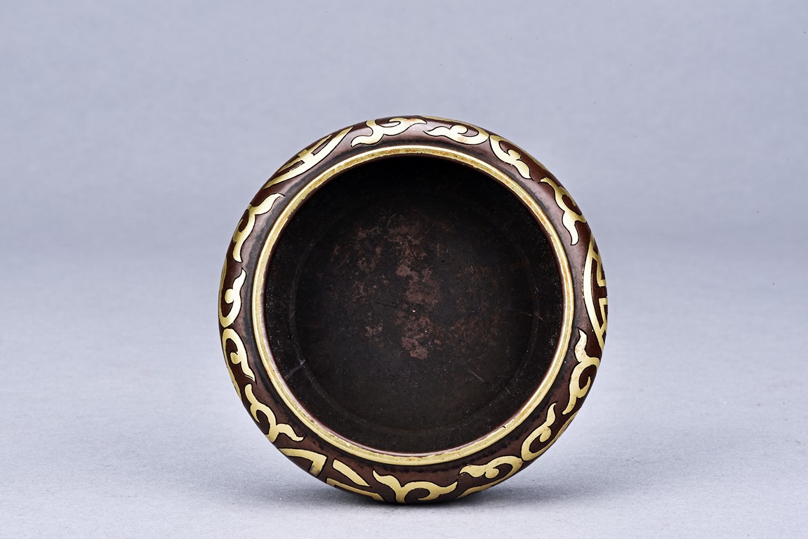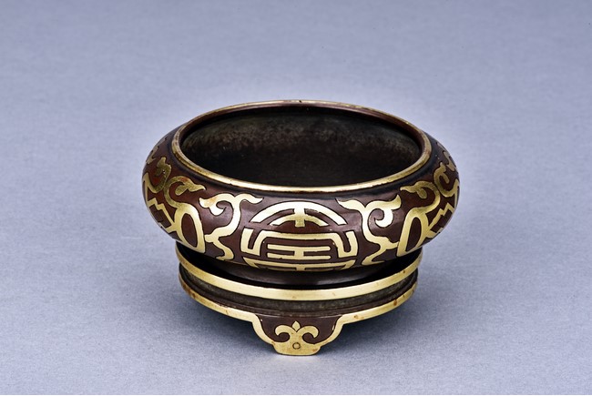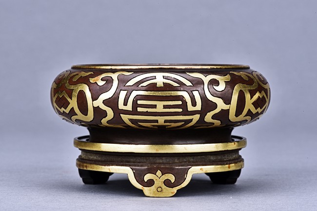 Of compressed globular form, the body with gilt-decorated stylized fu, lu, and shou character, with auspicious motif in between. The bottom bears four character 'Qianlong' mark; accompanied with a tripod stand with gilt rim and feet. Qing Dynasty period.
