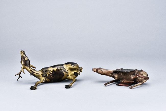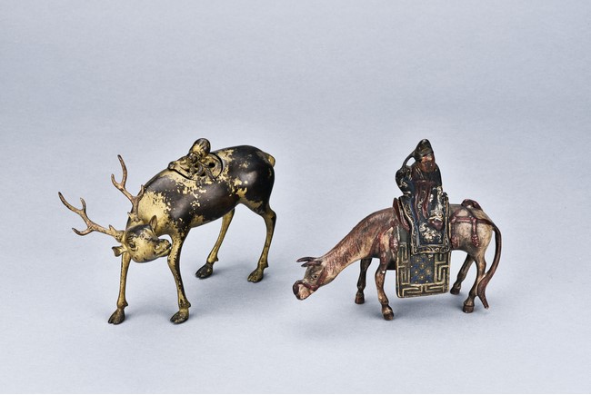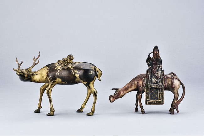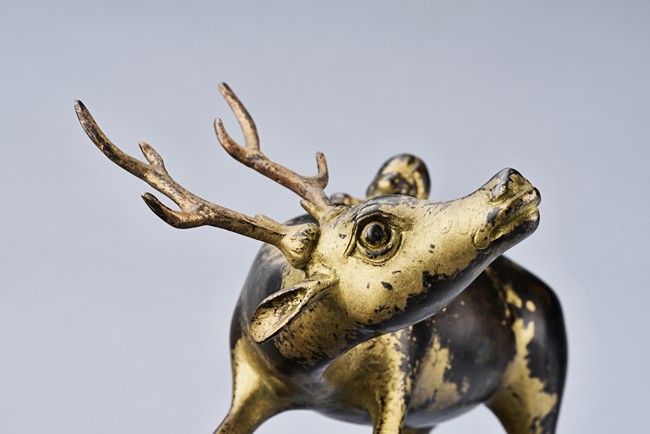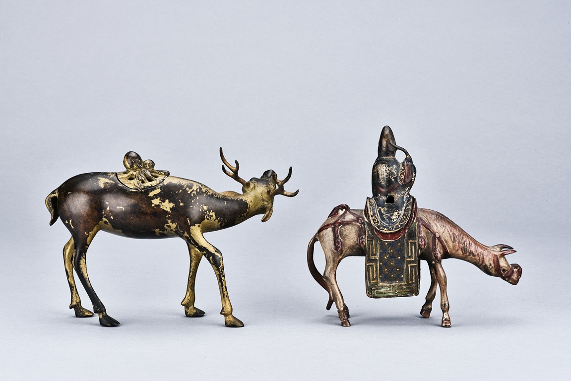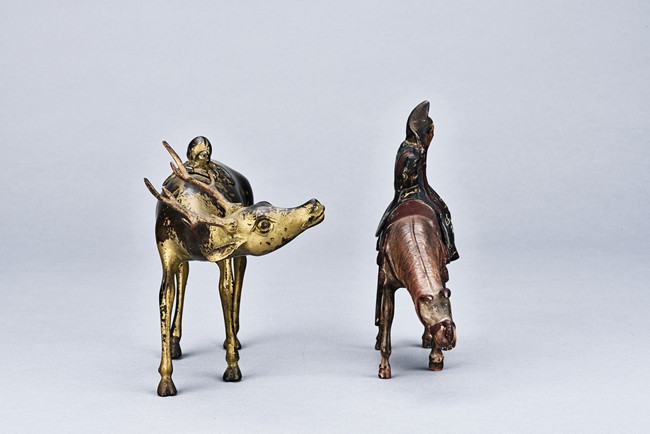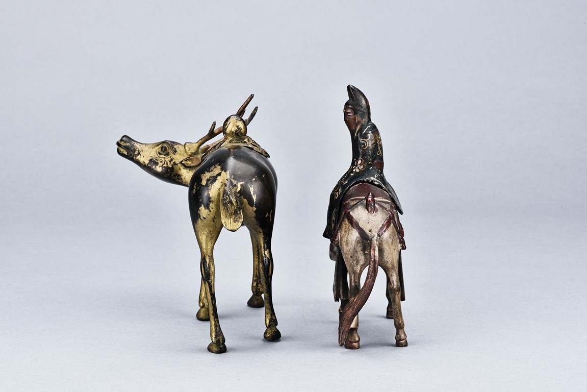 Comprising of a parcel gilt deer, standing foursquare, head tilted, the back with a cover; and a bronze horse figural group, painted and gilt decorated. Qing Dynasty period.