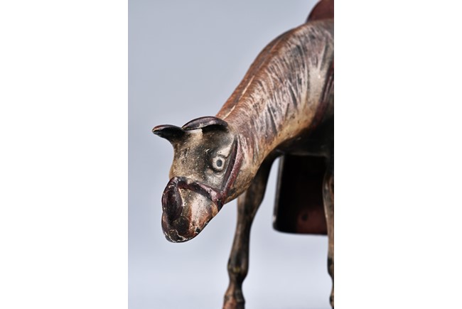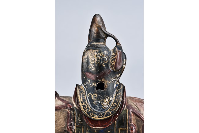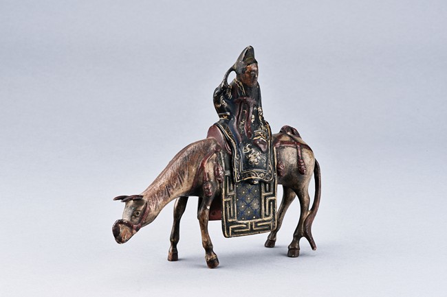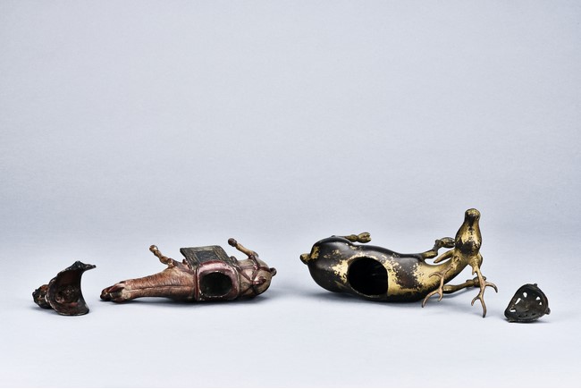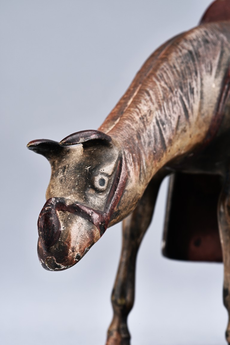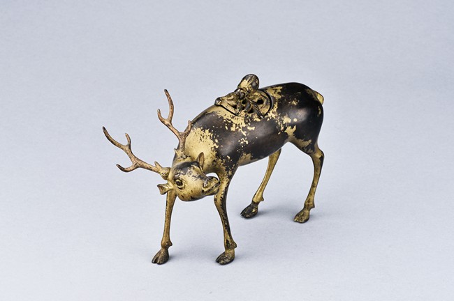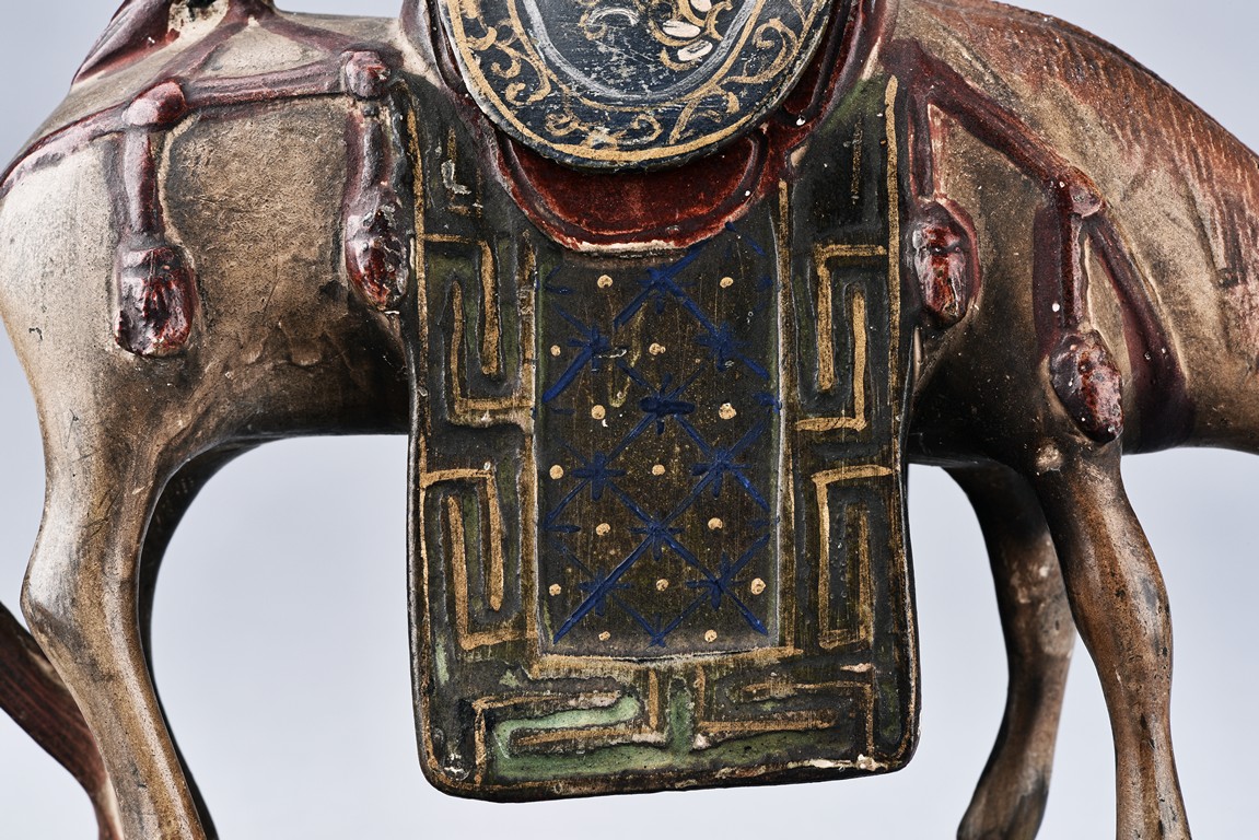Comprising of a parcel gilt deer, standing foursquare, head tilted, the back with a cover; and a bronze horse figural group, painted and gilt decorated. Qing Dynasty period.