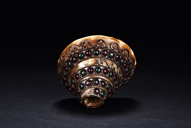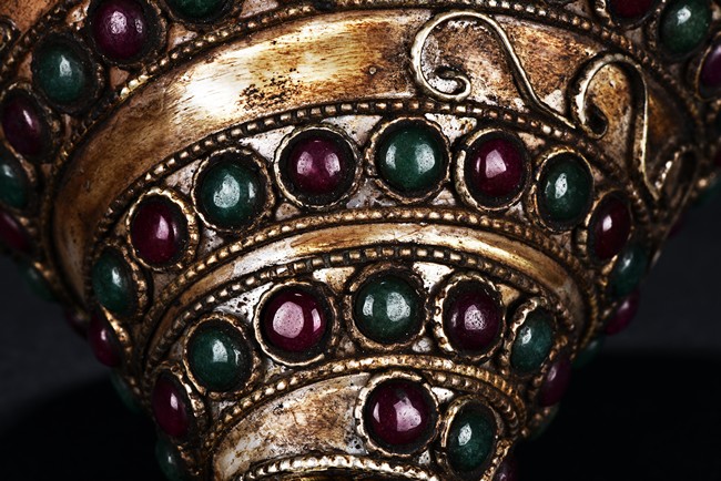 Finely inlaid with bands of semi-precious gem beads and bronze decoration, spiraling upwards toward the end. 19th Century.