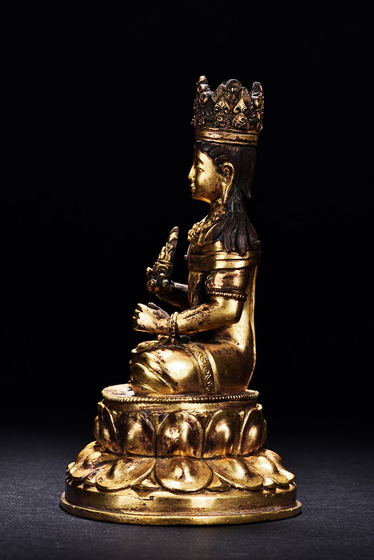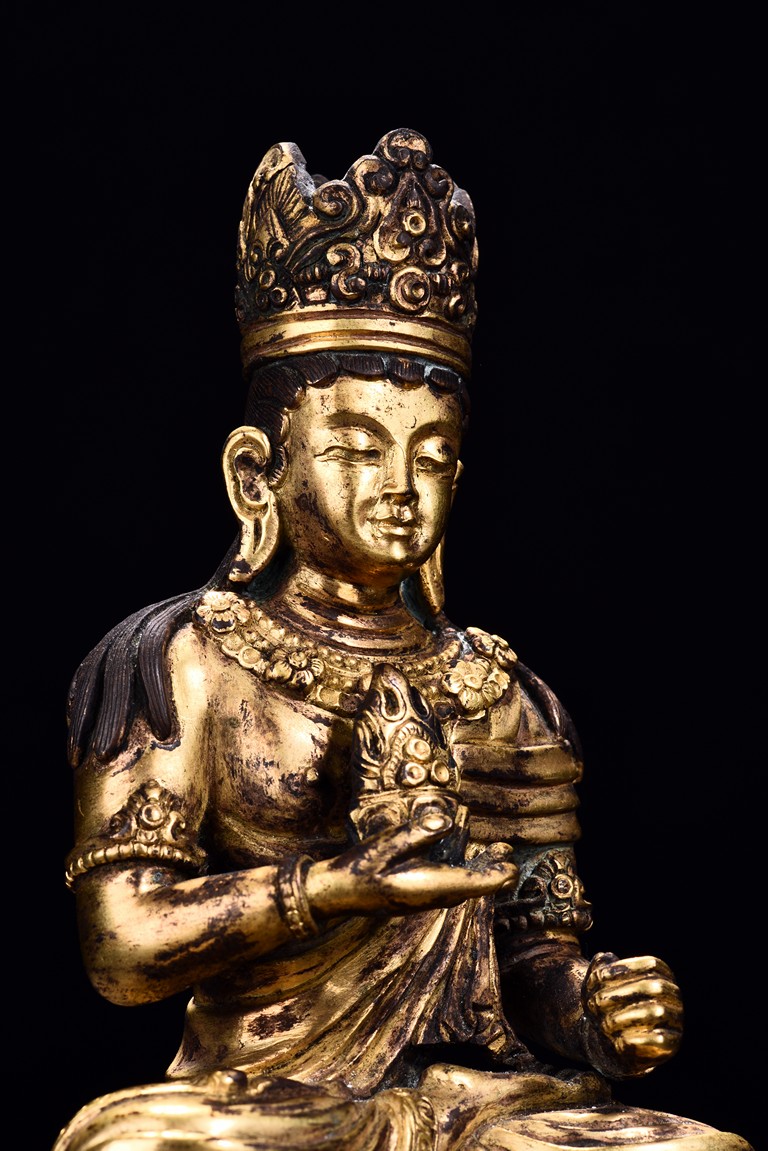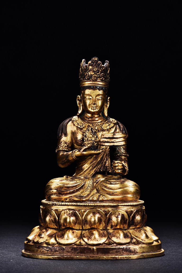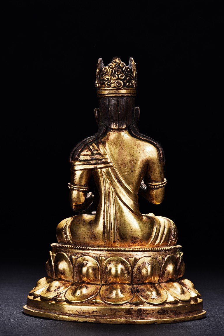 The bodhisattva is shown seated on a double lotus throne in dhyanasana mutra, wearing a voluminous sanghati with folds and adorned with beaded flower necklace, the left hand holding an alm bowl with flame, his face with serene and benevolent expression flanked by with two pendulous earlobes, the hair surmounted with a crown. Qing Dynasty period.