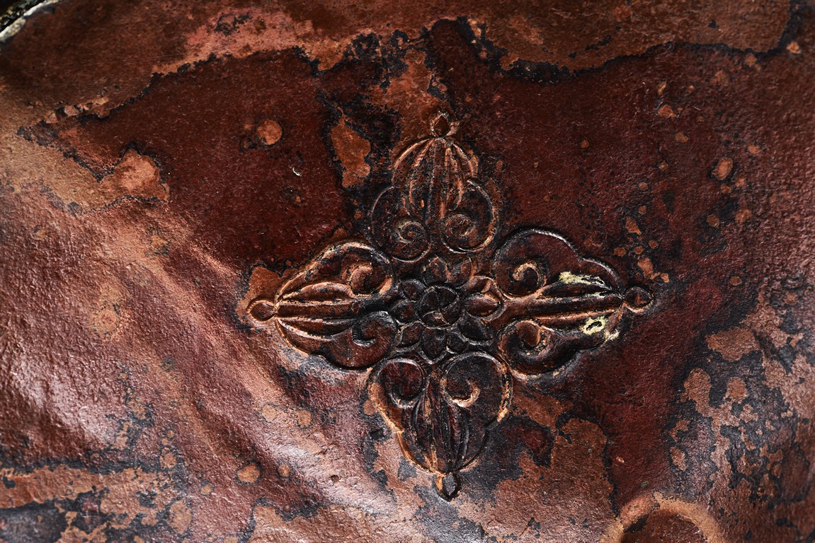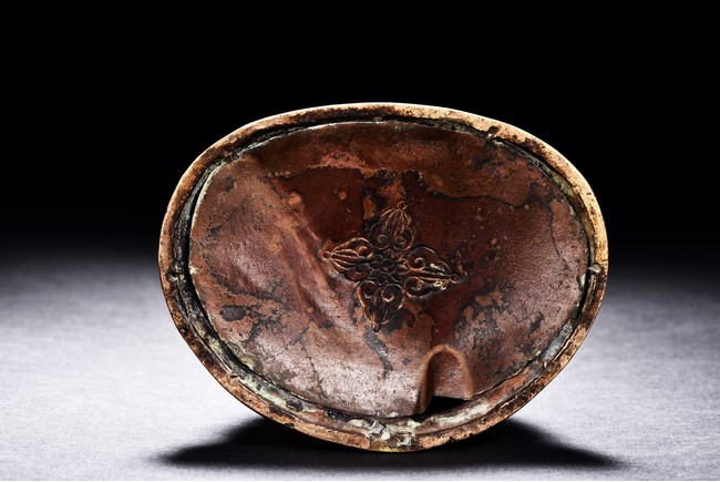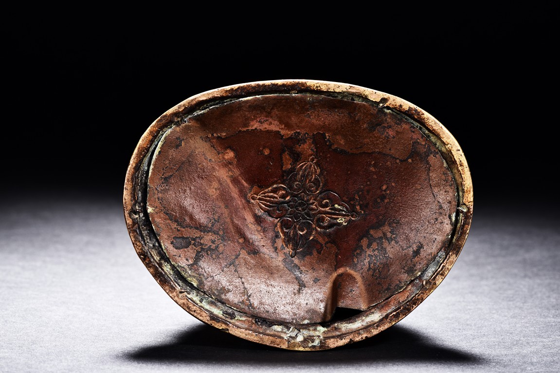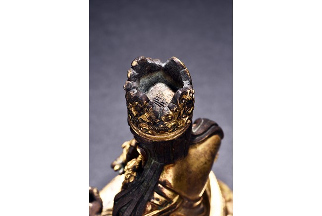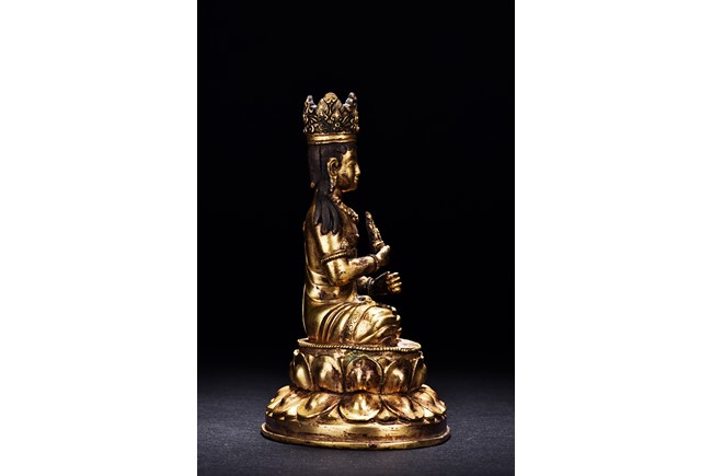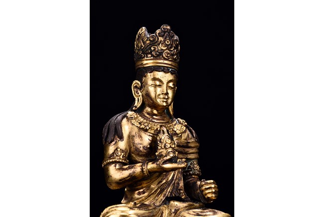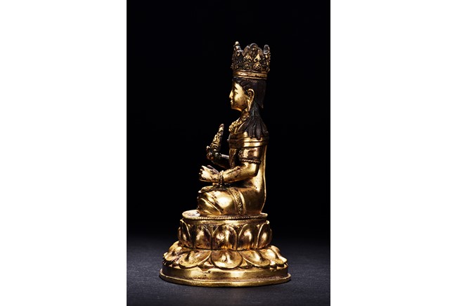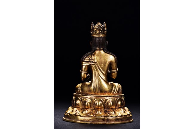 The bodhisattva is shown seated on a double lotus throne in dhyanasana mutra, wearing a voluminous sanghati with folds and adorned with beaded flower necklace, the left hand holding an alm bowl with flame, his face with serene and benevolent expression flanked by with two pendulous earlobes, the hair surmounted with a crown. Qing Dynasty period.