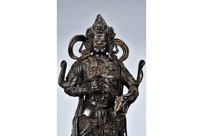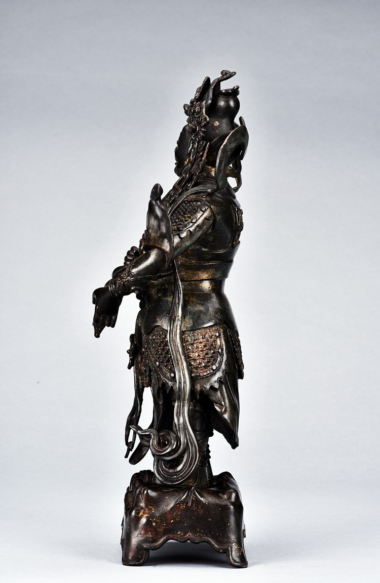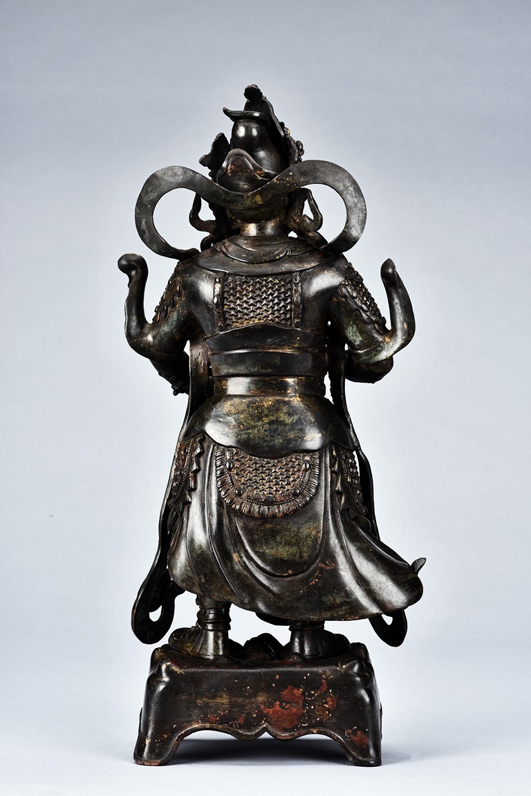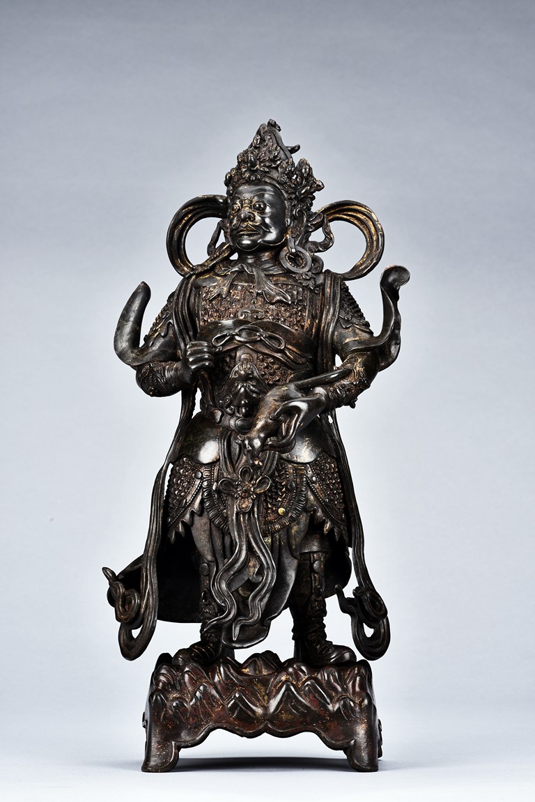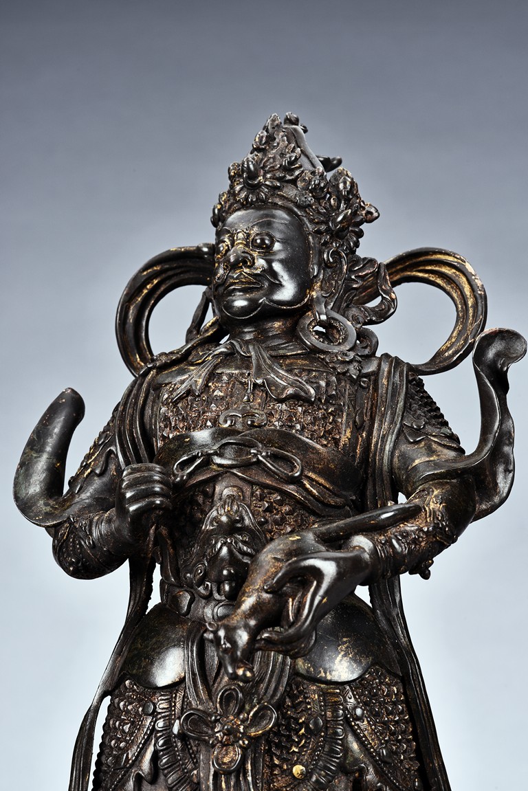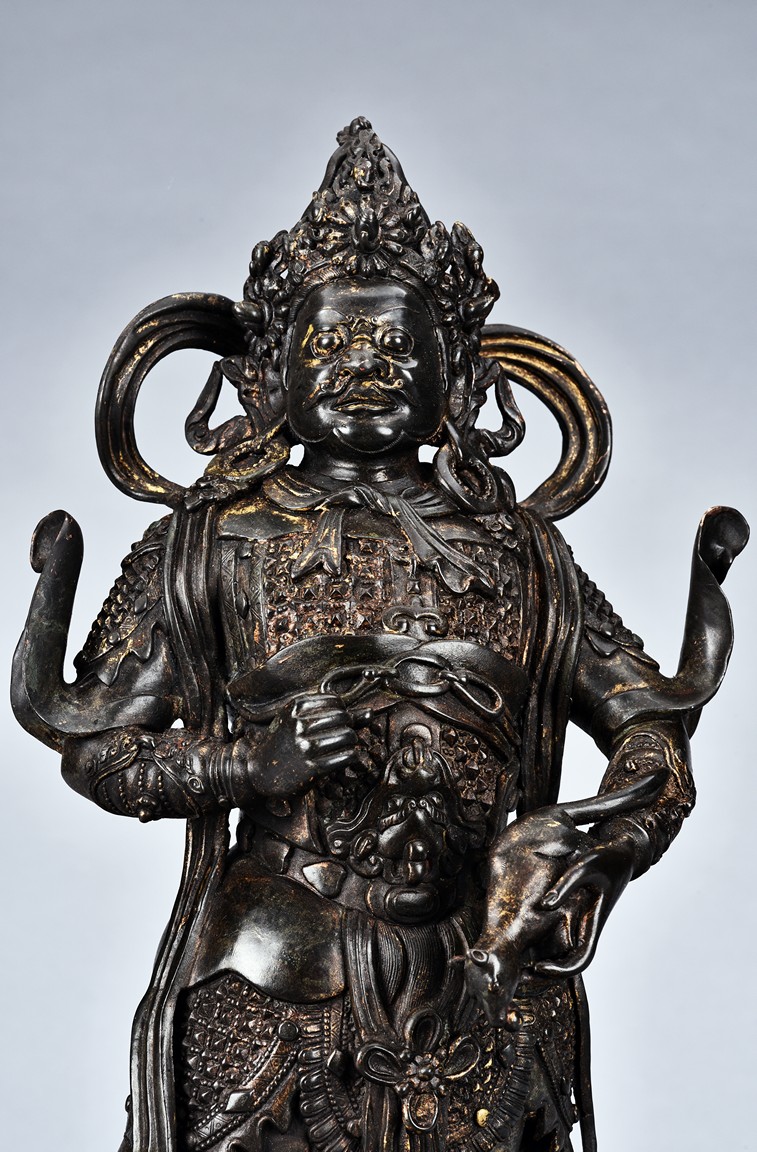 Cast standing upon a rockwork base, the figure is shown wearing elaborate chainmail completely covering the body and extending down to boots, left hand holding a mongoose, the right raised as if to hold an attribute,, with a celestial scarf billowing up behind the head and trailing down to the base of each, with further knotted ribbons at the waist, the face with stern expression, surmounted by elaborate crowns. 18th Century.