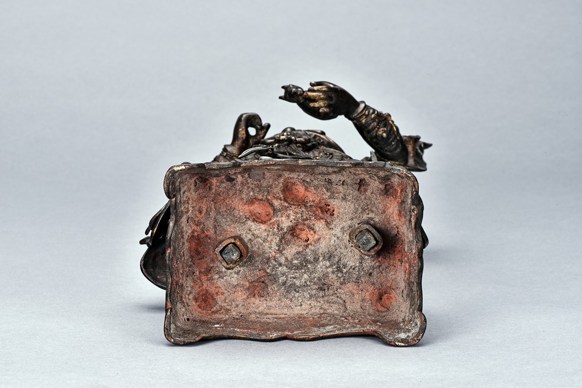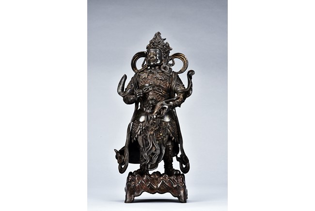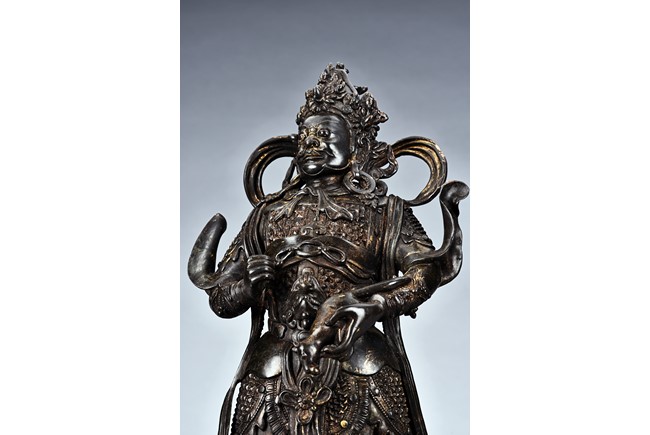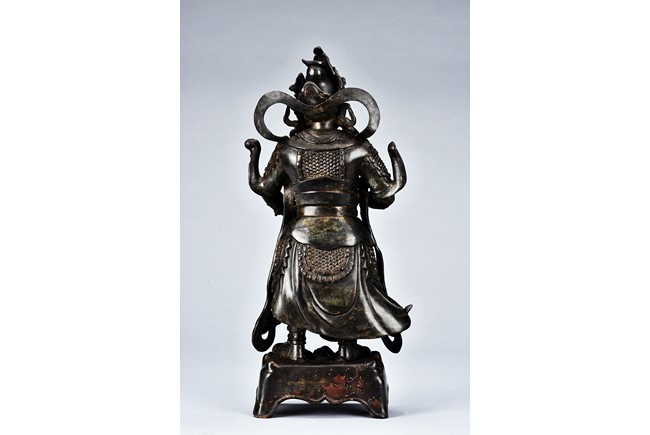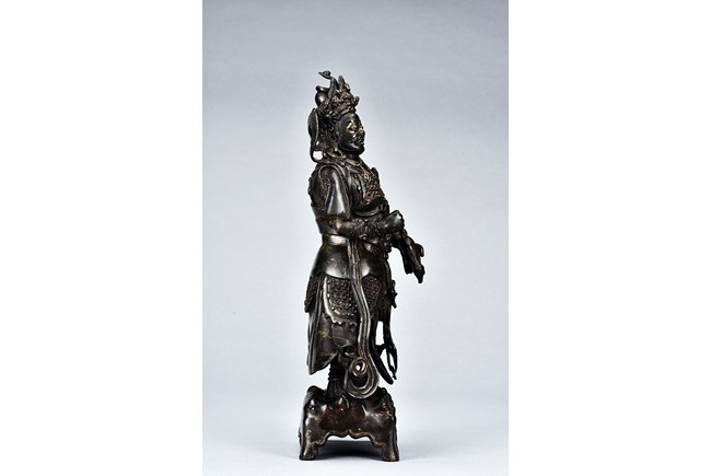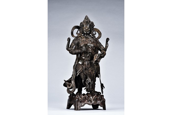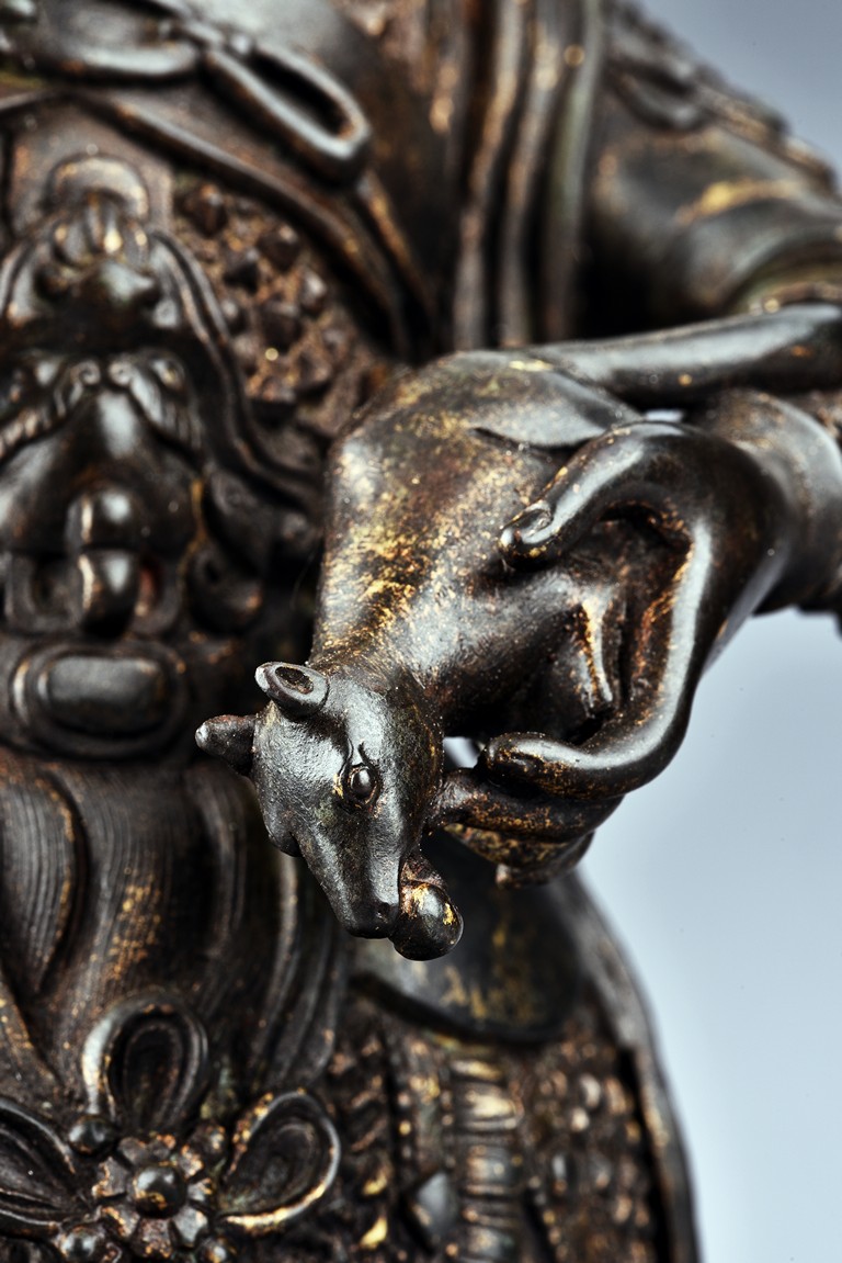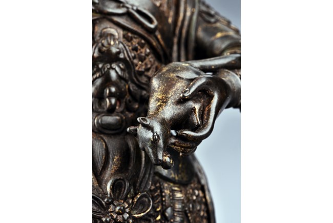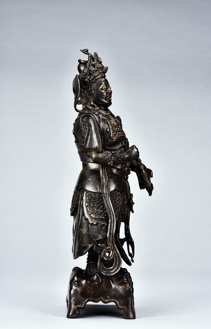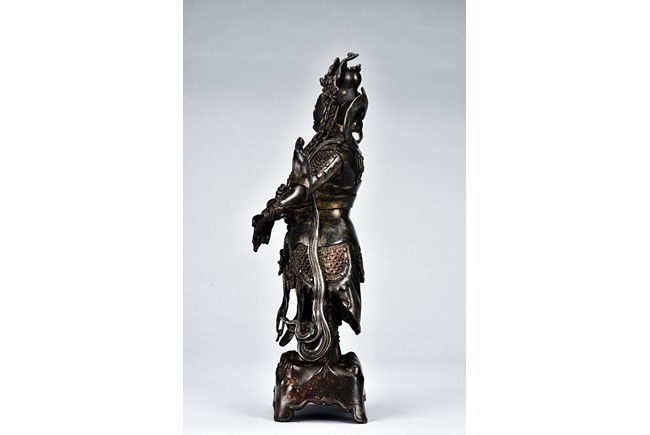 Cast standing upon a rockwork base, the figure is shown wearing elaborate chainmail completely covering the body and extending down to boots, left hand holding a mongoose, the right raised as if to hold an attribute,, with a celestial scarf billowing up behind the head and trailing down to the base of each, with further knotted ribbons at the waist, the face with stern expression, surmounted by elaborate crowns. 18th Century.