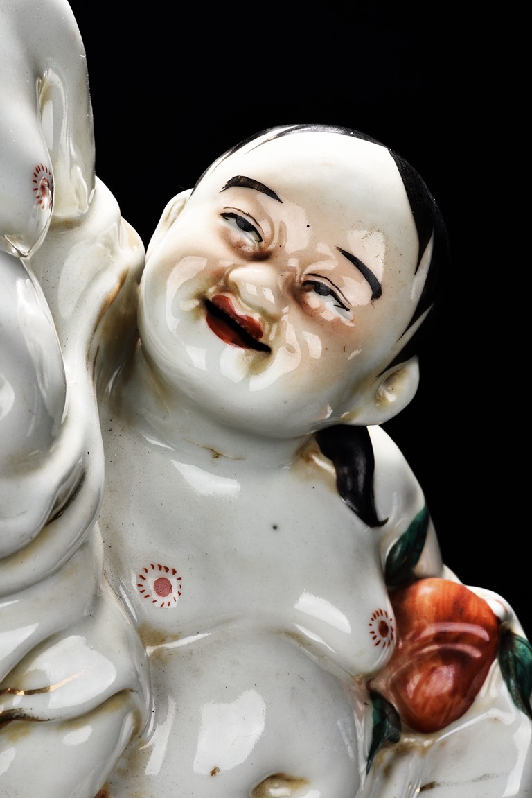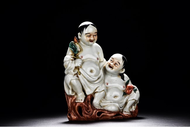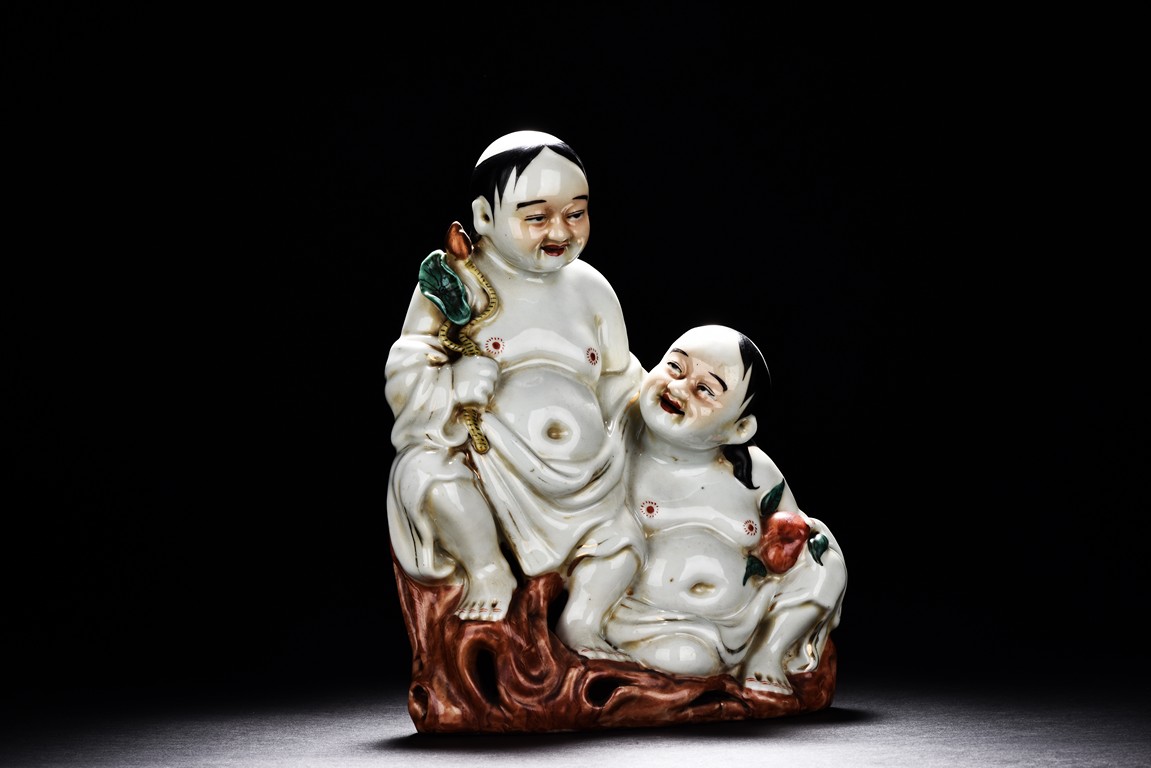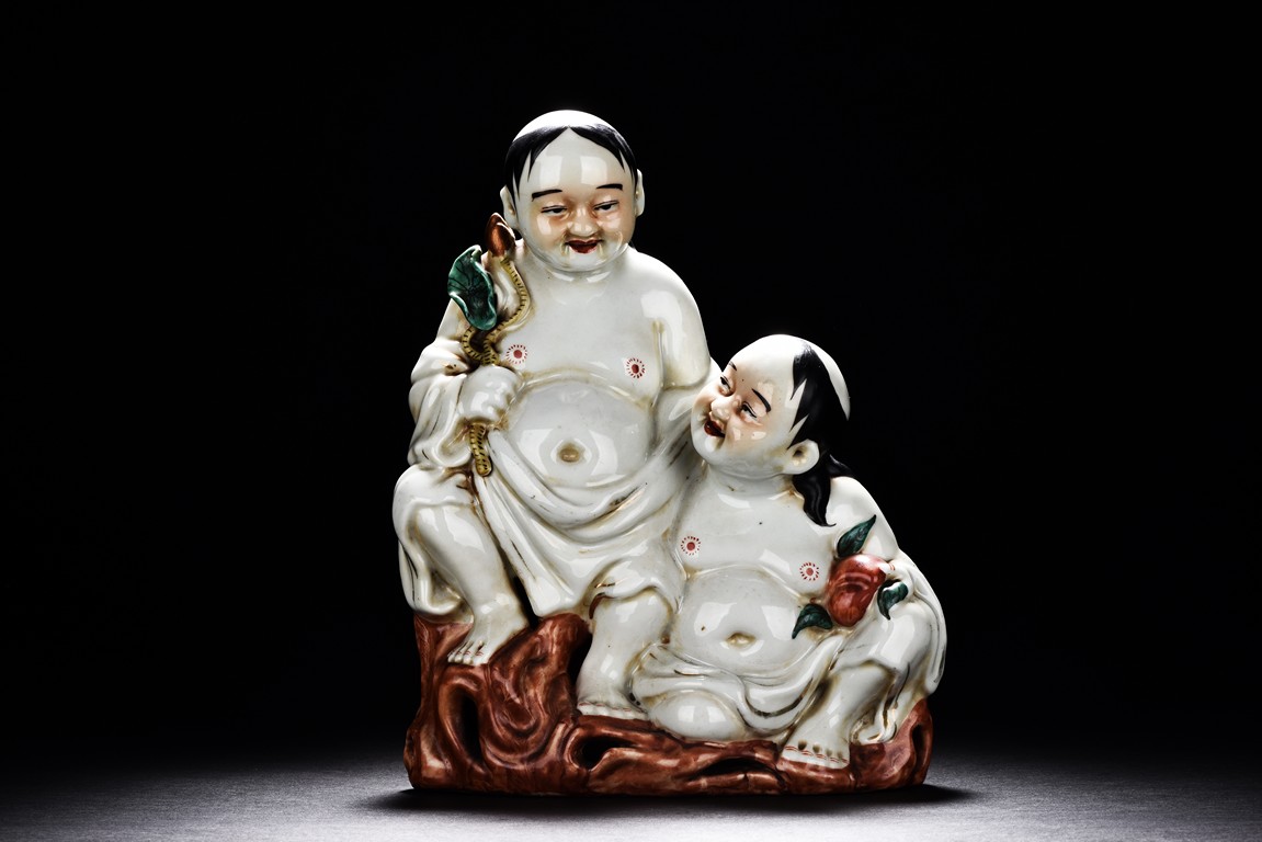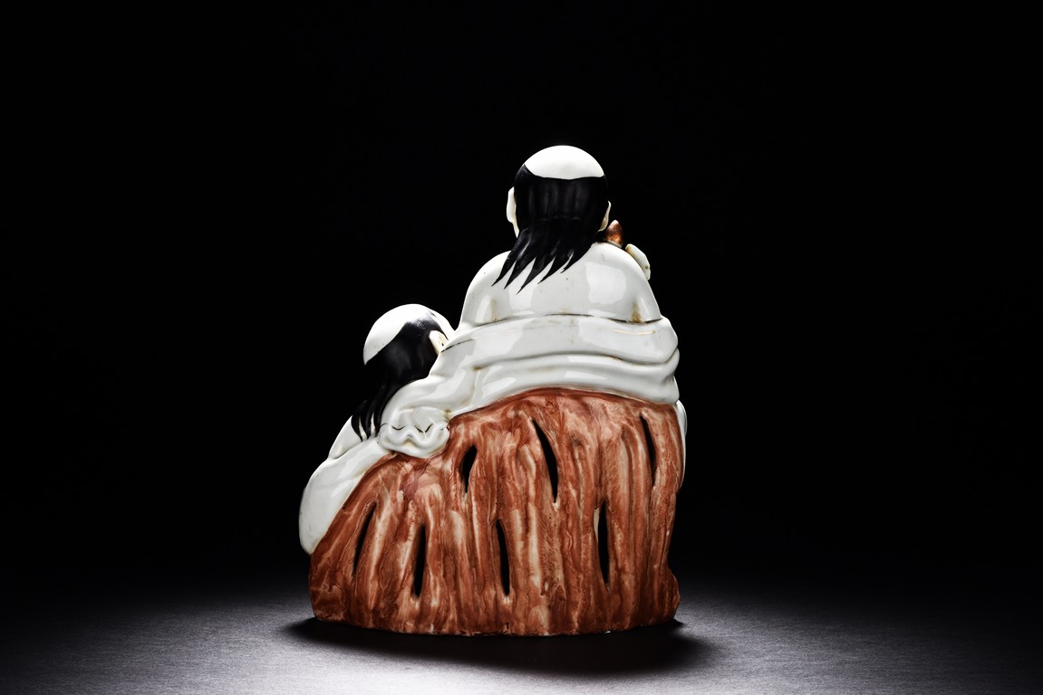 Both immortal shown seated on rock, one holding a lotus spray over shoulder, the other holding a leafy peach, wearing long robe revealing belly, both with smiling face, with hair over shoulder. Republic period.