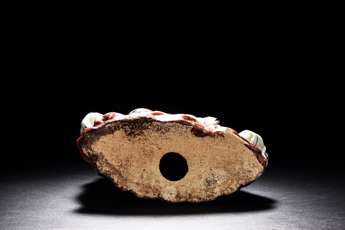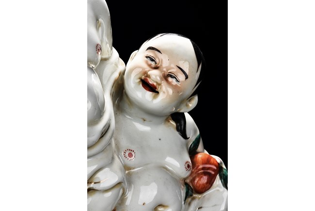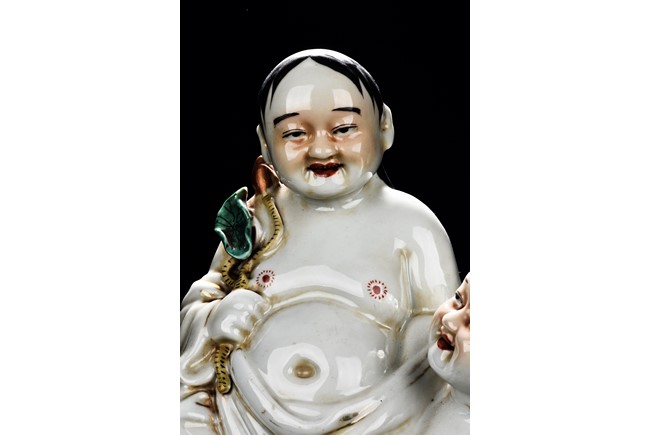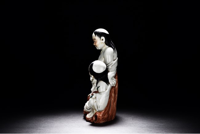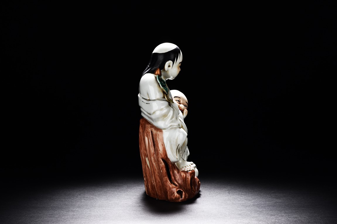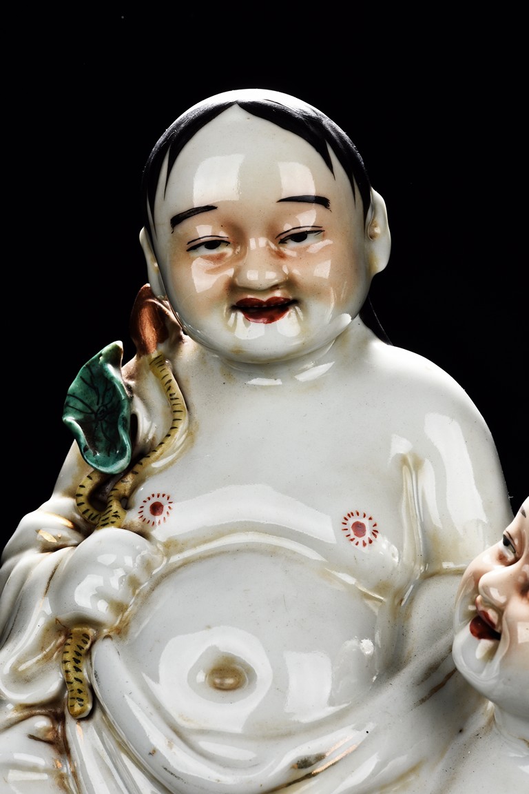 Both immortal shown seated on rock, one holding a lotus spray over shoulder, the other holding a leafy peach, wearing long robe revealing belly, both with smiling face, with hair over shoulder. Republic period.