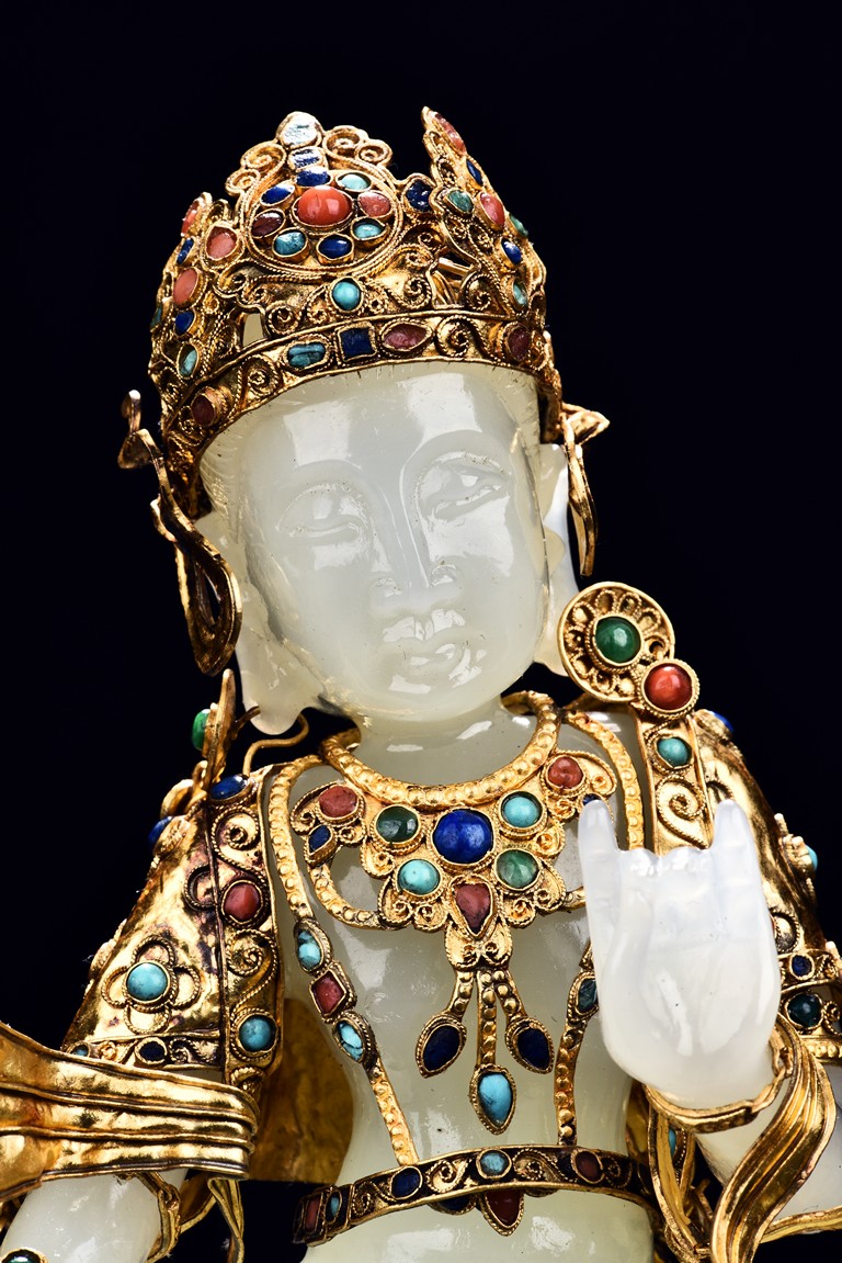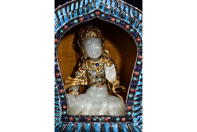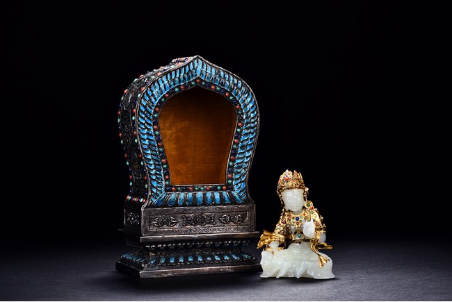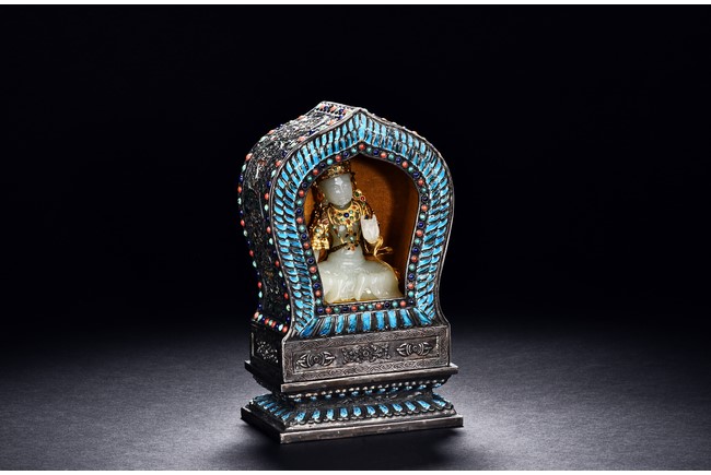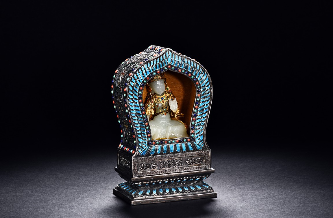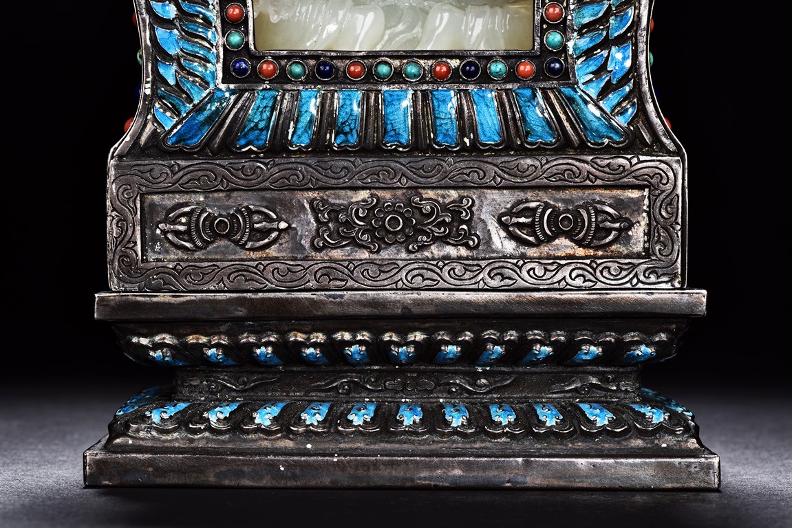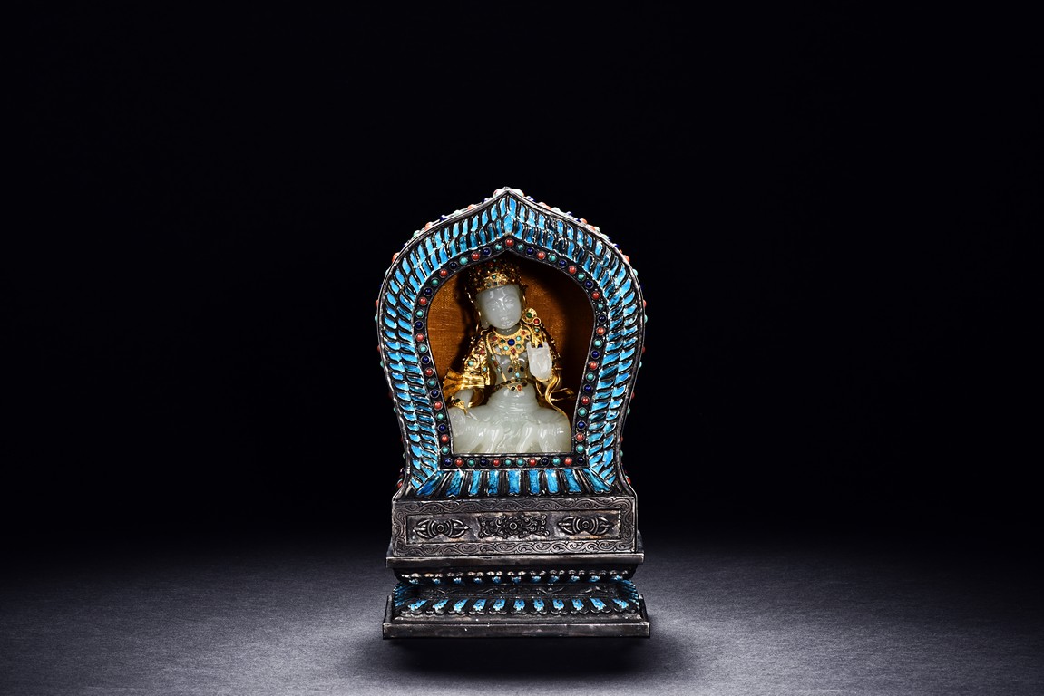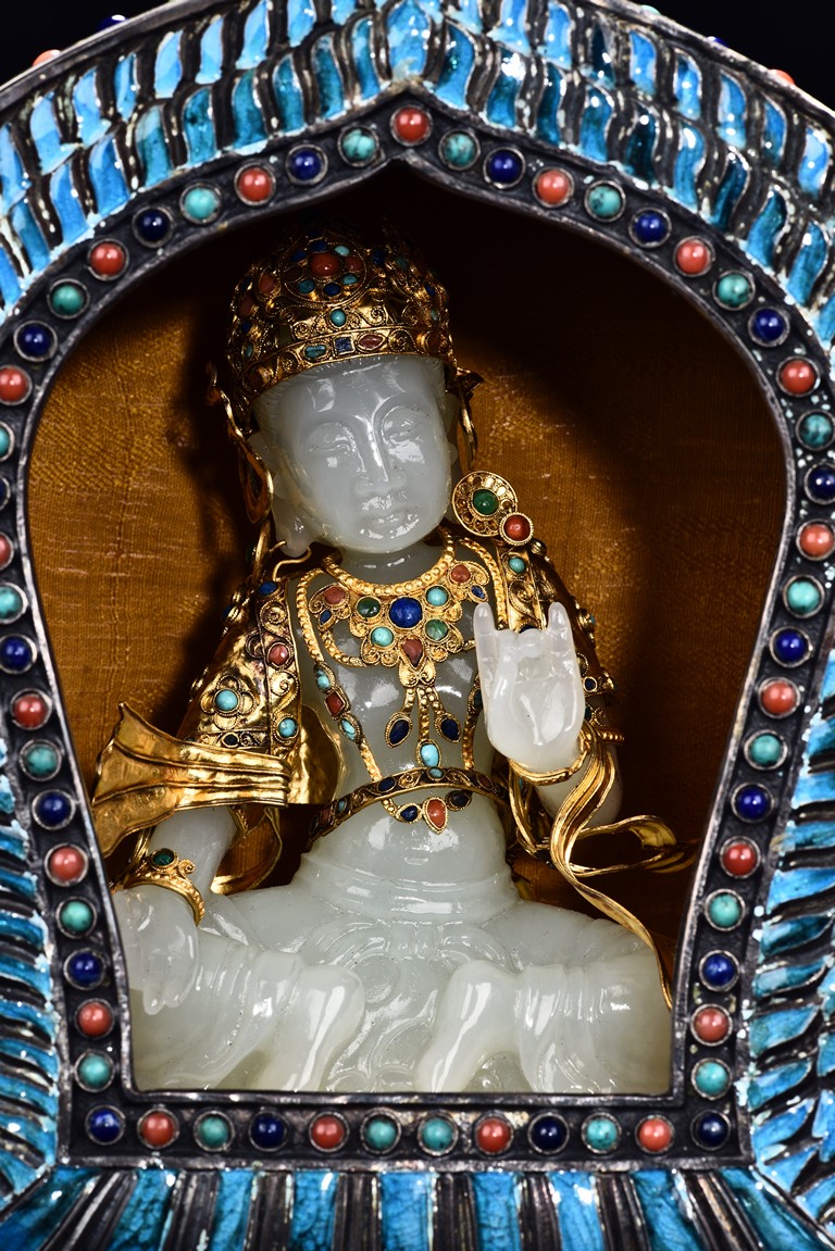 Contained within an elaborately worked silver shrine, the inner front frame finely embellished with turquoise, lapis lazuli, and coral beads, with outer rim enamlled in blue with flame motifs. The sides finely cast and enamelled with buddhist's treasures enclosed by turquoie, lapis lazuli, and coral beads. The bottom of the shrine with vajra and floral motifs, enclosed within scrolling floliage pattern. The base with double lotus petals enamelled in blue; the white jade bodhisattva statue is shown seated with left hand raised in tarjani mutra, symbolizing vigilance, and right hand rested on knee, wearing exqusite necklace, magnificent crown, and wheel-shaped earrings, all adorned with lapis lazuli, coral, turqupise, and spinach jade beads, and billowing sashes around both arms, all cast in gold foil. His face is shown with meditative expression, flanked by pendulous earlobes, and the jade is of even white tone. Qing Dynasty period.
