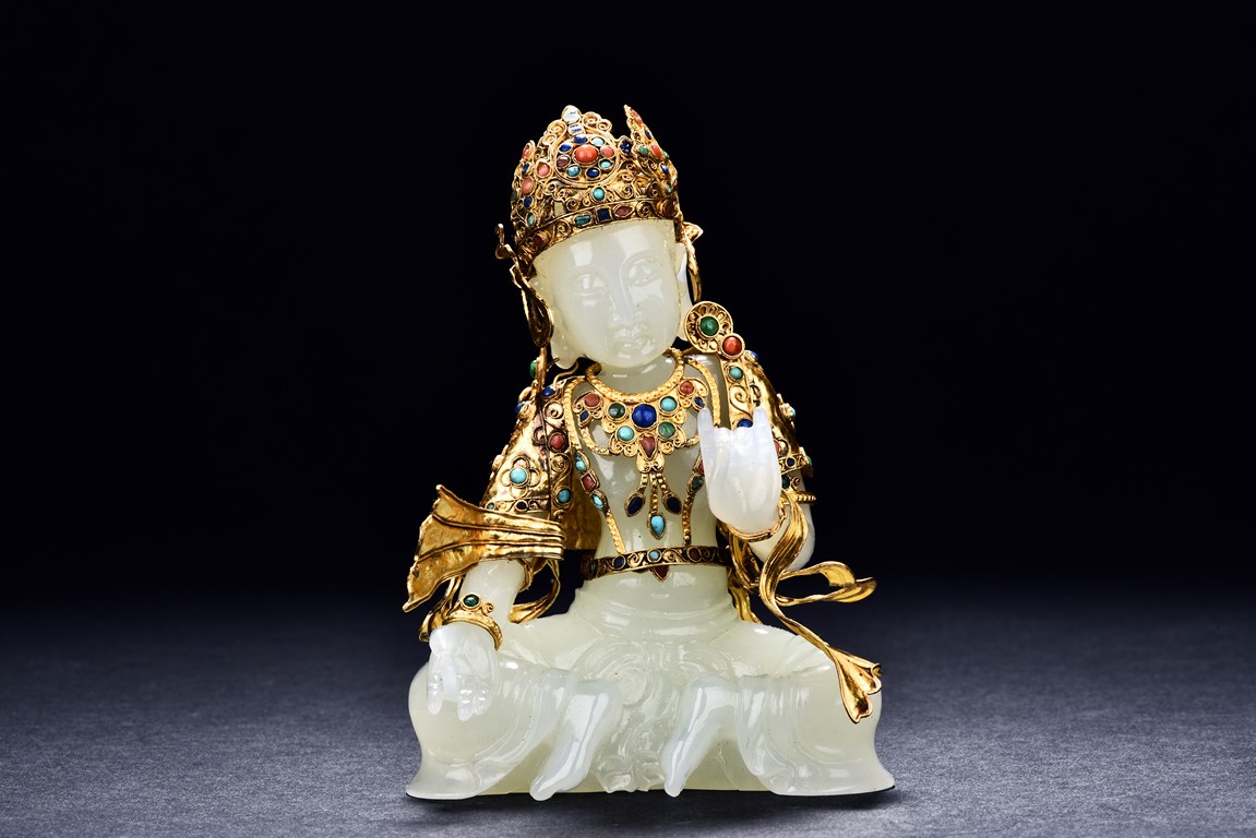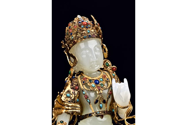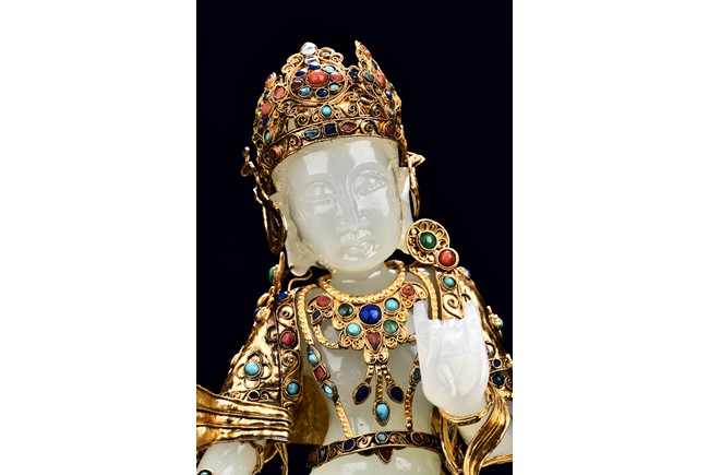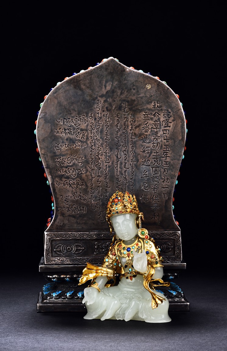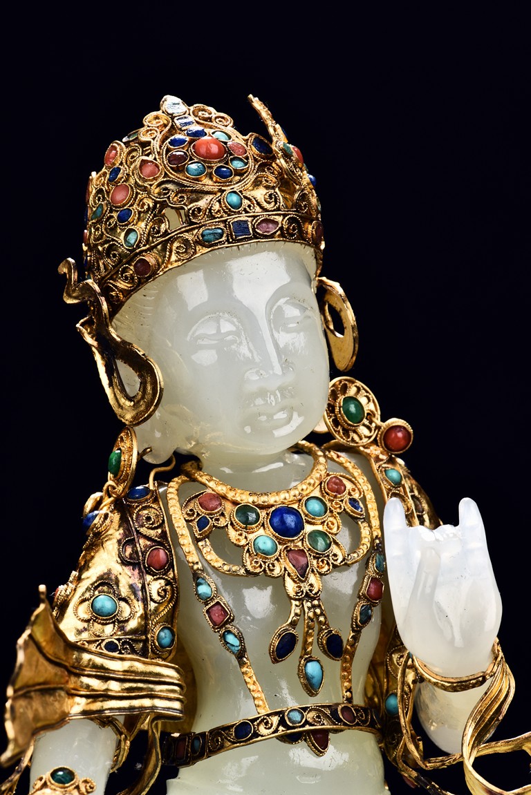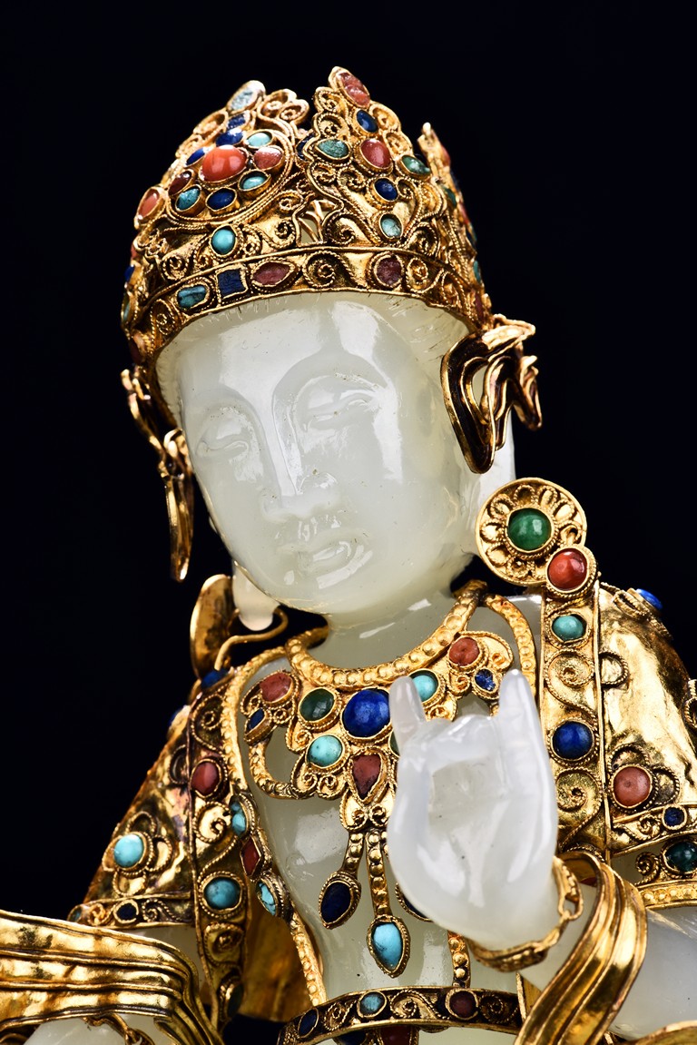 Contained within an elaborately worked silver shrine, the inner front frame finely embellished with turquoise, lapis lazuli, and coral beads, with outer rim enamlled in blue with flame motifs. The sides finely cast and enamelled with buddhist's treasures enclosed by turquoie, lapis lazuli, and coral beads. The bottom of the shrine with vajra and floral motifs, enclosed within scrolling floliage pattern. The base with double lotus petals enamelled in blue; the white jade bodhisattva statue is shown seated with left hand raised in tarjani mutra, symbolizing vigilance, and right hand rested on knee, wearing exqusite necklace, magnificent crown, and wheel-shaped earrings, all adorned with lapis lazuli, coral, turqupise, and spinach jade beads, and billowing sashes around both arms, all cast in gold foil. His face is shown with meditative expression, flanked by pendulous earlobes, and the jade is of even white tone. Qing Dynasty period.