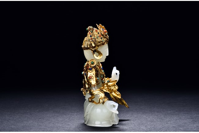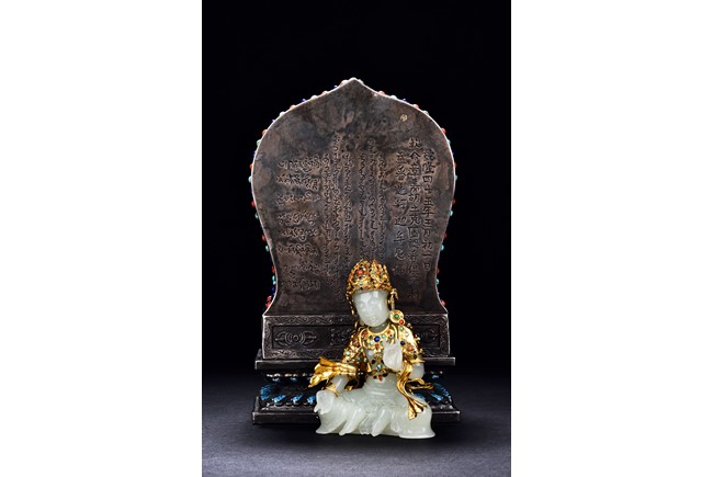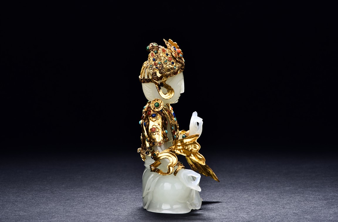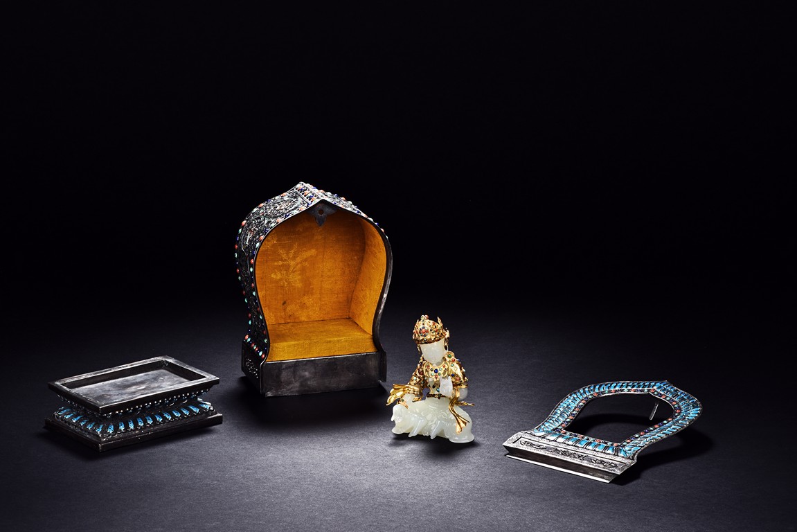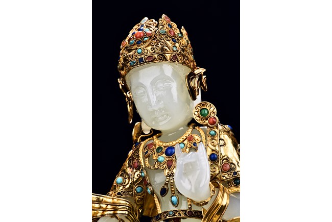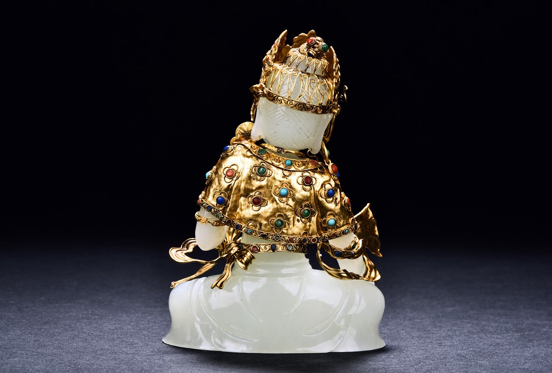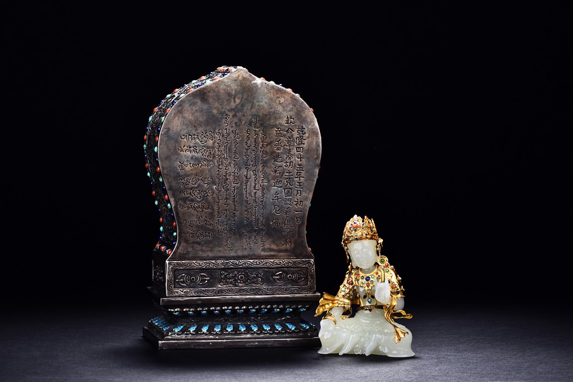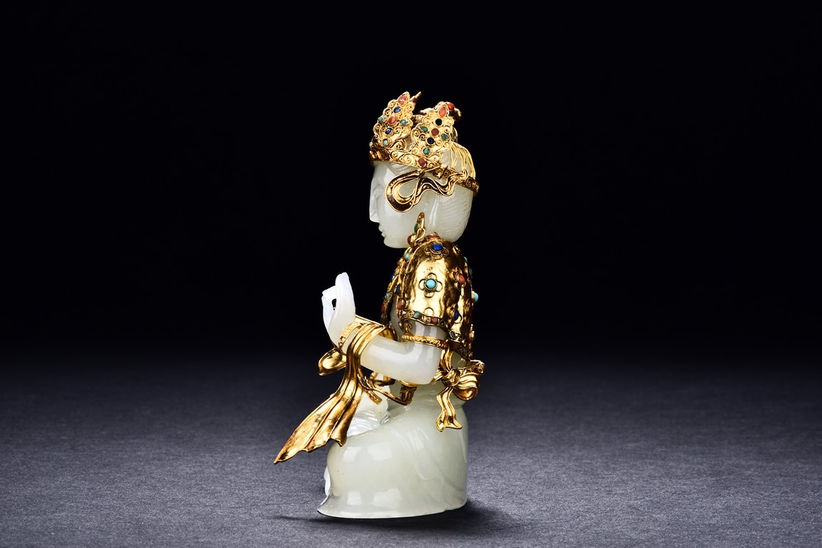 Contained within an elaborately worked silver shrine, the inner front frame finely embellished with turquoise, lapis lazuli, and coral beads, with outer rim enamlled in blue with flame motifs. The sides finely cast and enamelled with buddhist's treasures enclosed by turquoie, lapis lazuli, and coral beads. The bottom of the shrine with vajra and floral motifs, enclosed within scrolling floliage pattern. The base with double lotus petals enamelled in blue; the white jade bodhisattva statue is shown seated with left hand raised in tarjani mutra, symbolizing vigilance, and right hand rested on knee, wearing exqusite necklace, magnificent crown, and wheel-shaped earrings, all adorned with lapis lazuli, coral, turqupise, and spinach jade beads, and billowing sashes around both arms, all cast in gold foil. His face is shown with meditative expression, flanked by pendulous earlobes, and the jade is of even white tone. Qing Dynasty period.