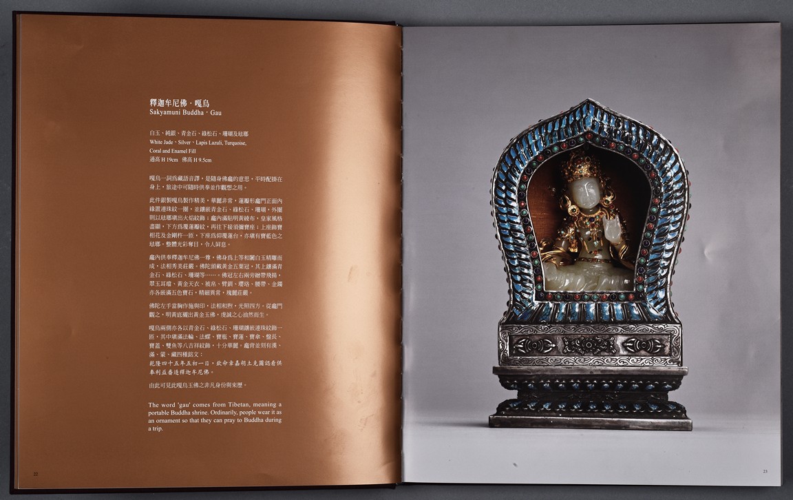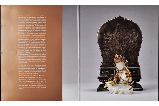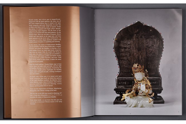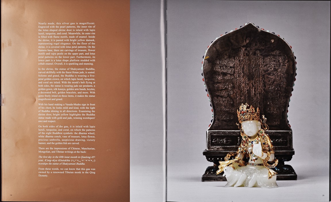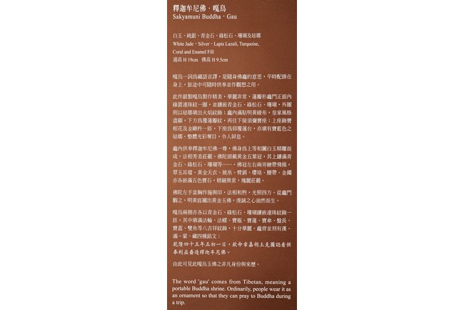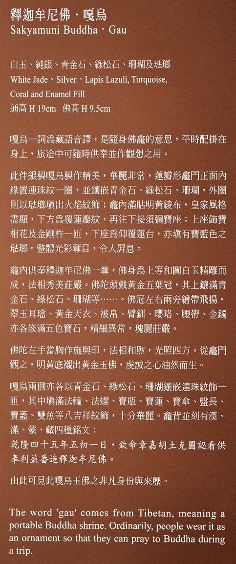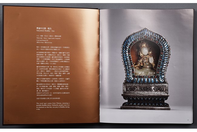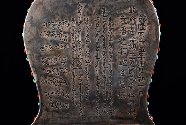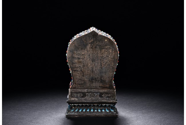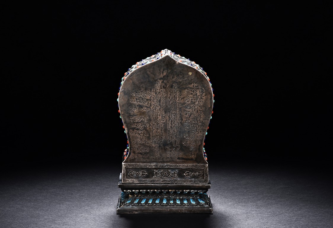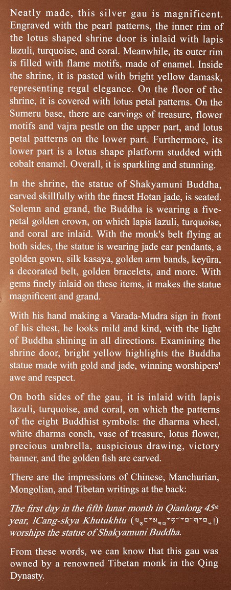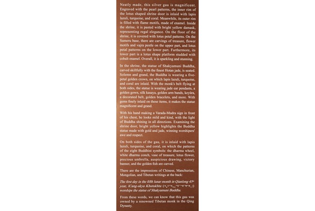 此純銀佛龕製作精美,華麗非常,蓮瓣形龕門正面內置連珠紋一串,並嵌青金石,綠松石,珊瑚。外圍則以琺瑯填出火焰紋飾。龕內滿貼黃織金錦,宮廷風格盡顯。下方為覆蓮瓣紋,再往下接須彌寶座。上座飾寶相花及金剛杵紋,下座為仰覆蓮台,亦填有寶藍色琺瑯。整體光彩奪目,瑰麗莊嚴。龕背並刻有漢滿蒙藏四種銘文:乾隆四十五年五月初一日,欽命章嘉胡土克圖認看供奉利益番造釋迦摩尼佛。其字體規範工整,可見應為宮廷供奉,由乾隆皇帝欽命章嘉活佛審查後所造。類似佛龕可參考2003年出版《故宮博物院藏文物珍品全集-藏傳佛教造像》,165頁,及268頁。