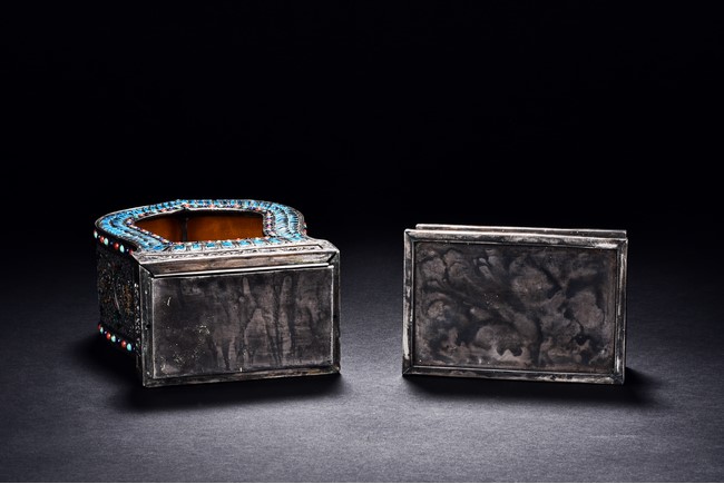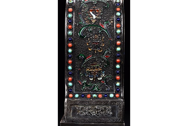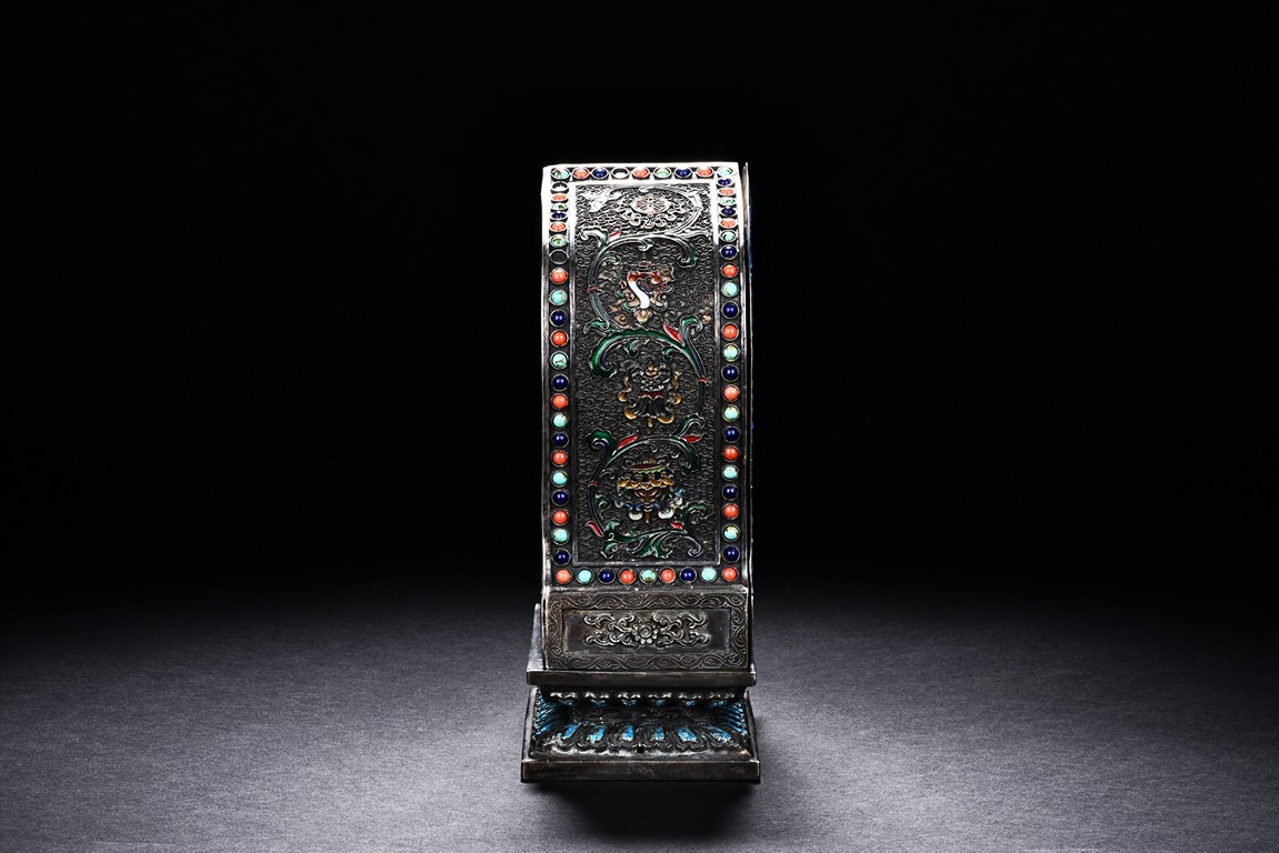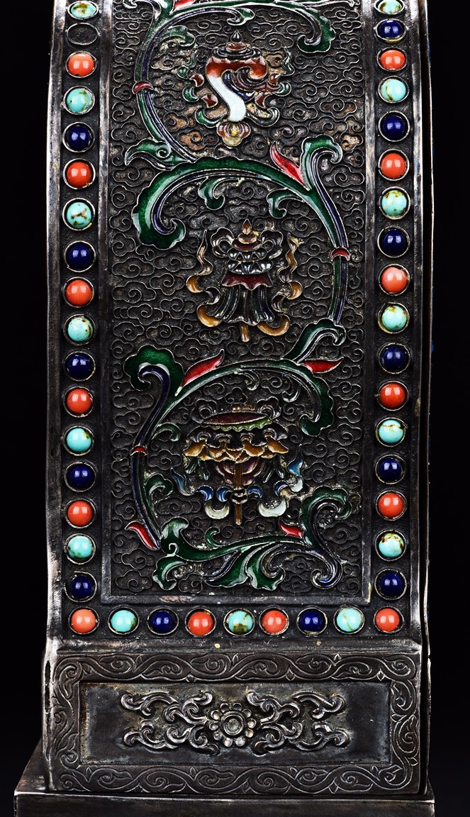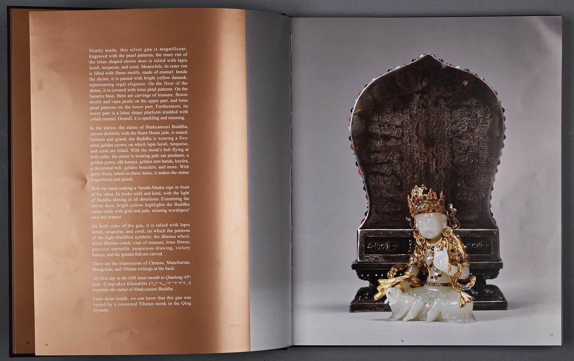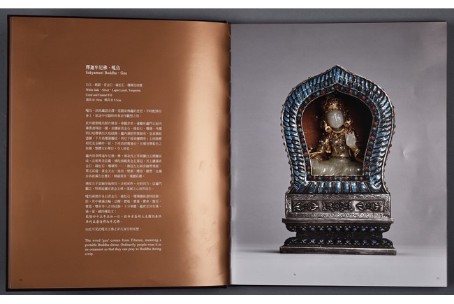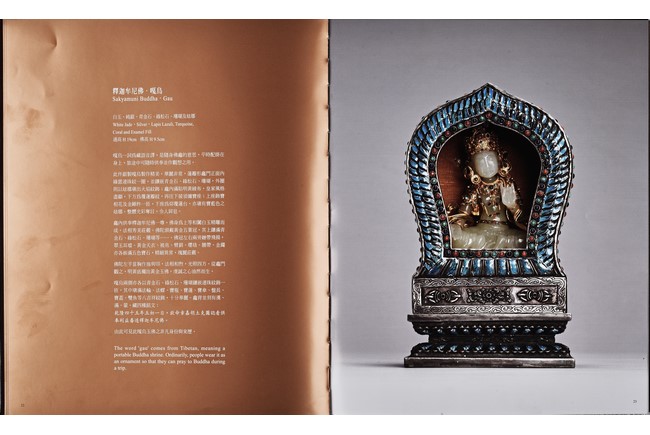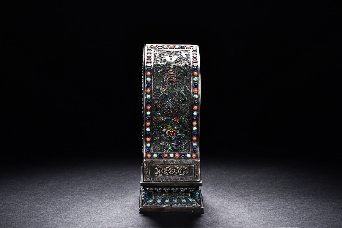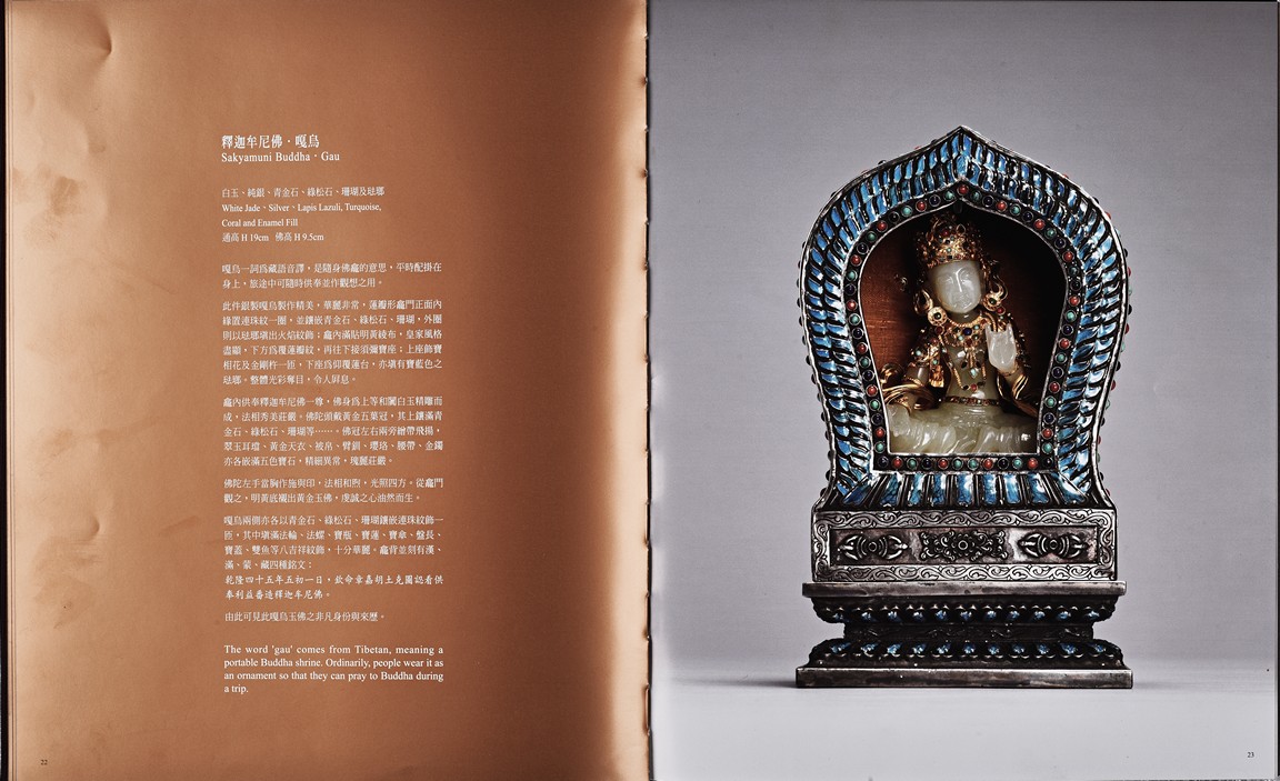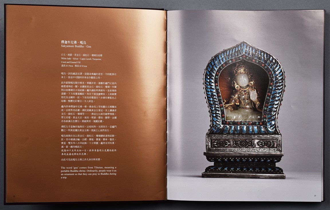 此純銀佛龕製作精美,華麗非常,蓮瓣形龕門正面內置連珠紋一串,並嵌青金石,綠松石,珊瑚。外圍則以琺瑯填出火焰紋飾。龕內滿貼黃織金錦,宮廷風格盡顯。下方為覆蓮瓣紋,再往下接須彌寶座。上座飾寶相花及金剛杵紋,下座為仰覆蓮台,亦填有寶藍色琺瑯。整體光彩奪目,瑰麗莊嚴。龕背並刻有漢滿蒙藏四種銘文:乾隆四十五年五月初一日,欽命章嘉胡土克圖認看供奉利益番造釋迦摩尼佛。其字體規範工整,可見應為宮廷供奉,由乾隆皇帝欽命章嘉活佛審查後所造。類似佛龕可參考2003年出版《故宮博物院藏文物珍品全集-藏傳佛教造像》,165頁,及268頁。